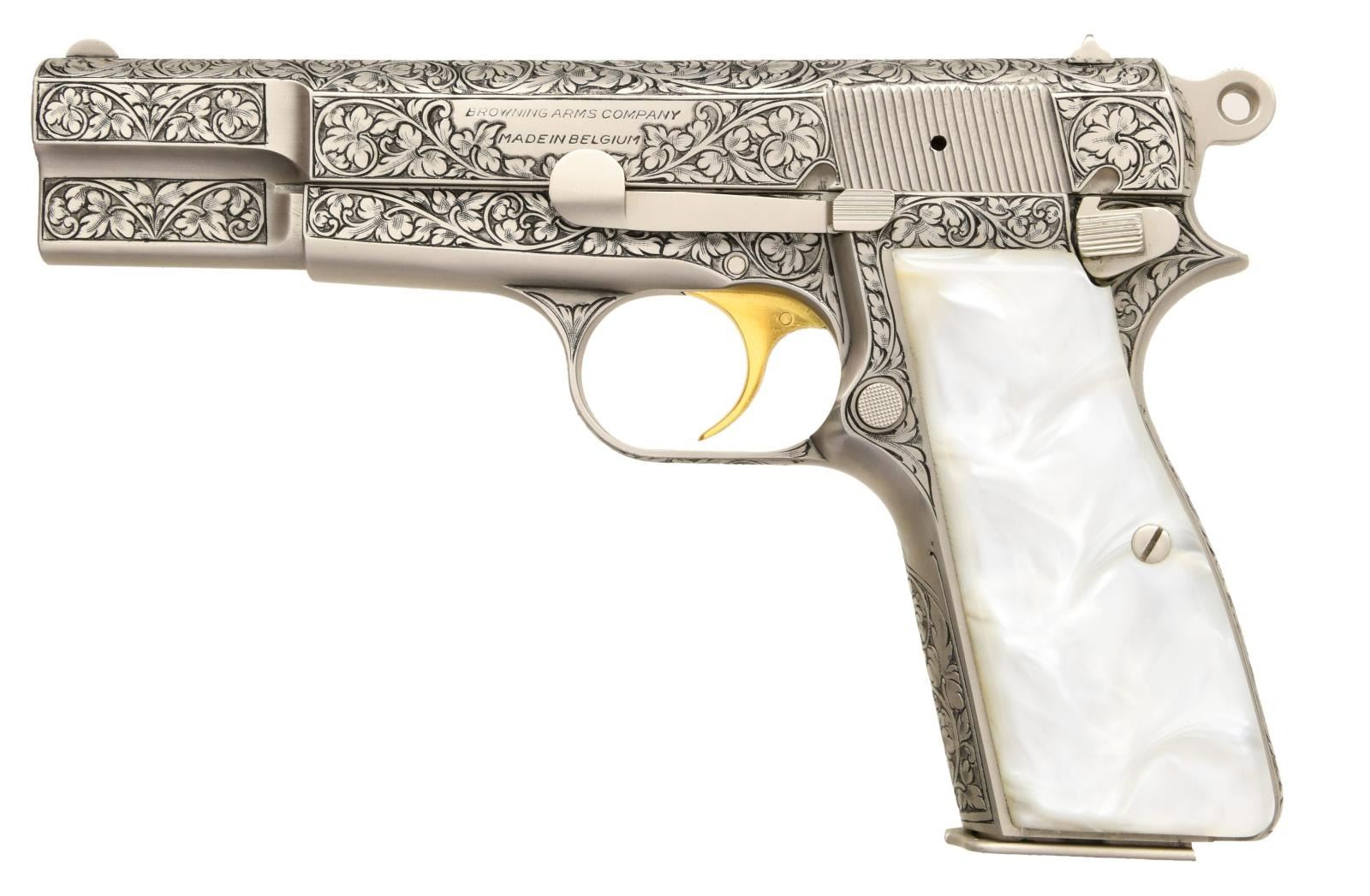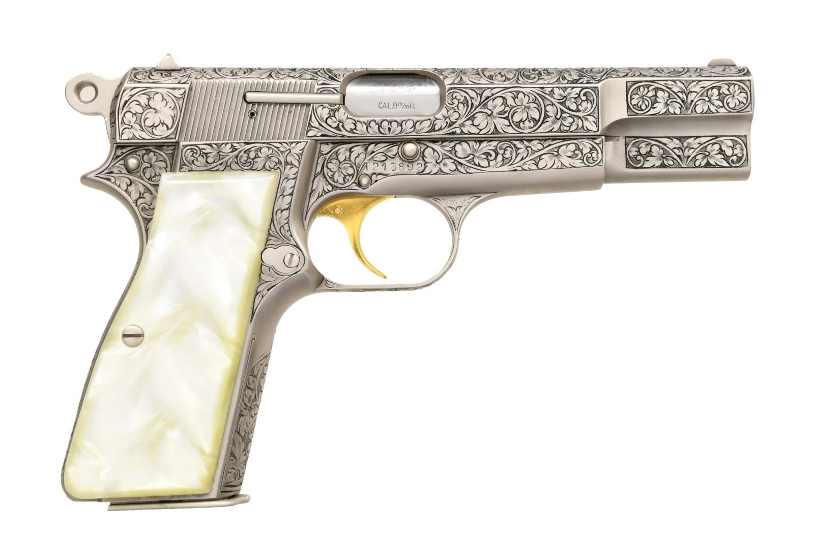 1) BROWNING HI-POWER SEMI-AUTOMATIC PISTOL. Cal. 9mm Luger. S# T213892. Bbl 4 5/8". Left side of slide is stamped "BROWNING ARMS COMPANY/ MADE IN BELGIUM". Frame and slide exhibit full coverage deep cut vine and floral panel engraving, with metal components exhibiting a French gray finish, and the trigger being gold plated. Frame is mounted with 2 piece smooth synthetic pearl grips. CONDITION: excellent, with metal components exhibiting few minor superficial marks from handling and storage overall. Brilliant mirror bore, exhibiting well defined rifling throughout. Right grip panel exhibits some yellowing, but grips otherwise are excellent overall. (23-1631/MLW).
