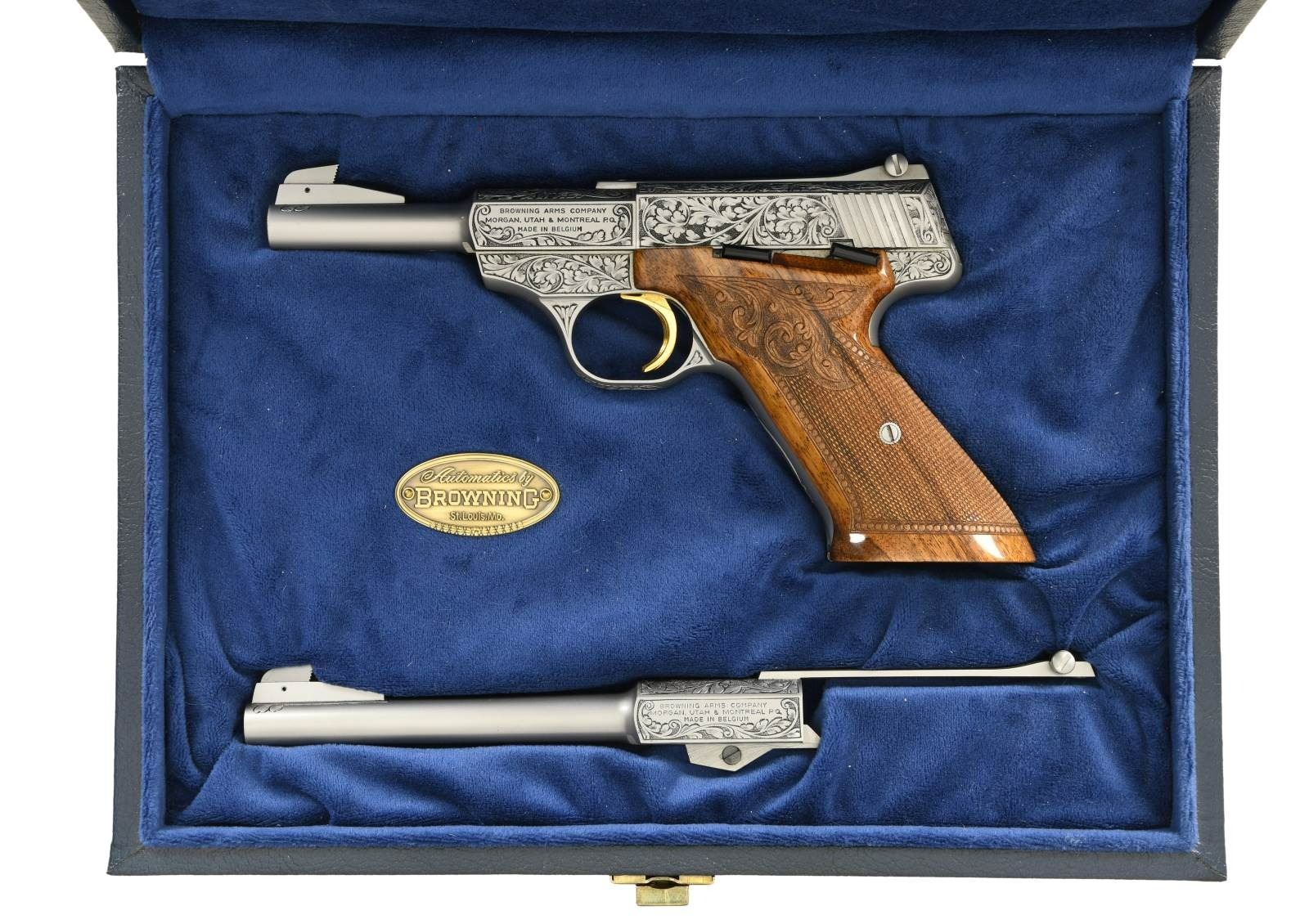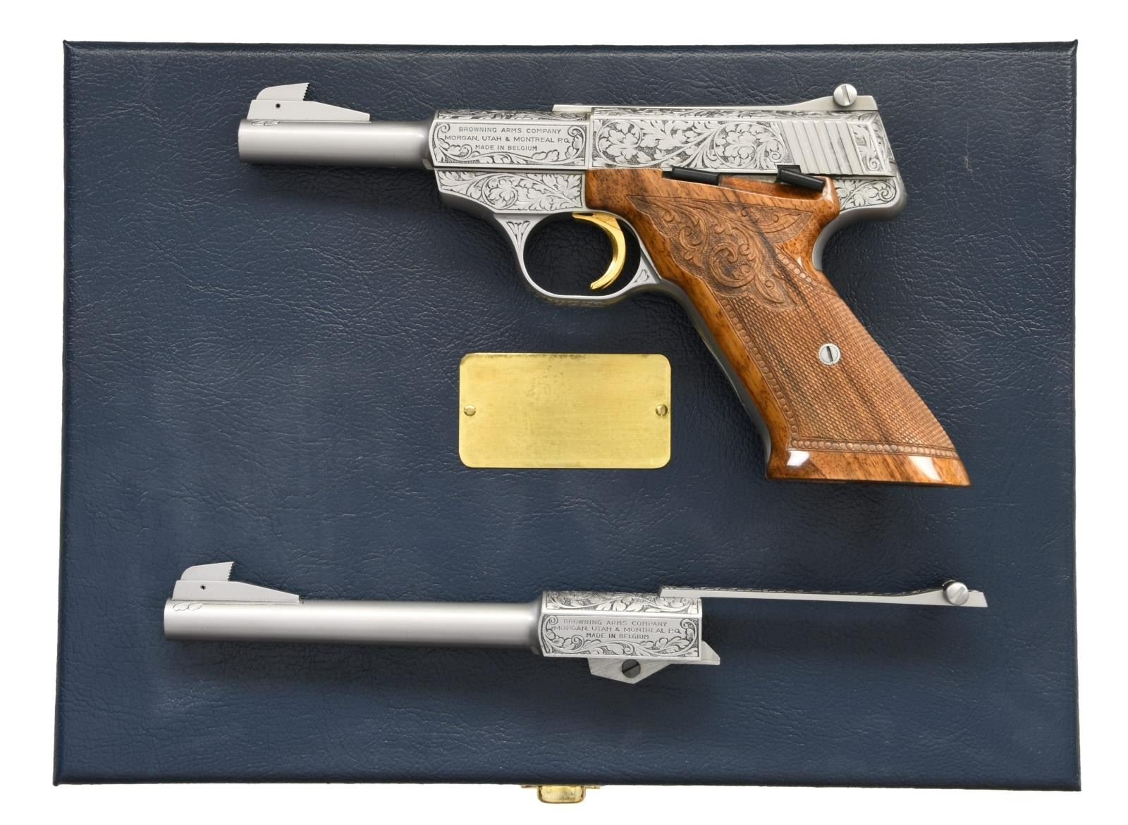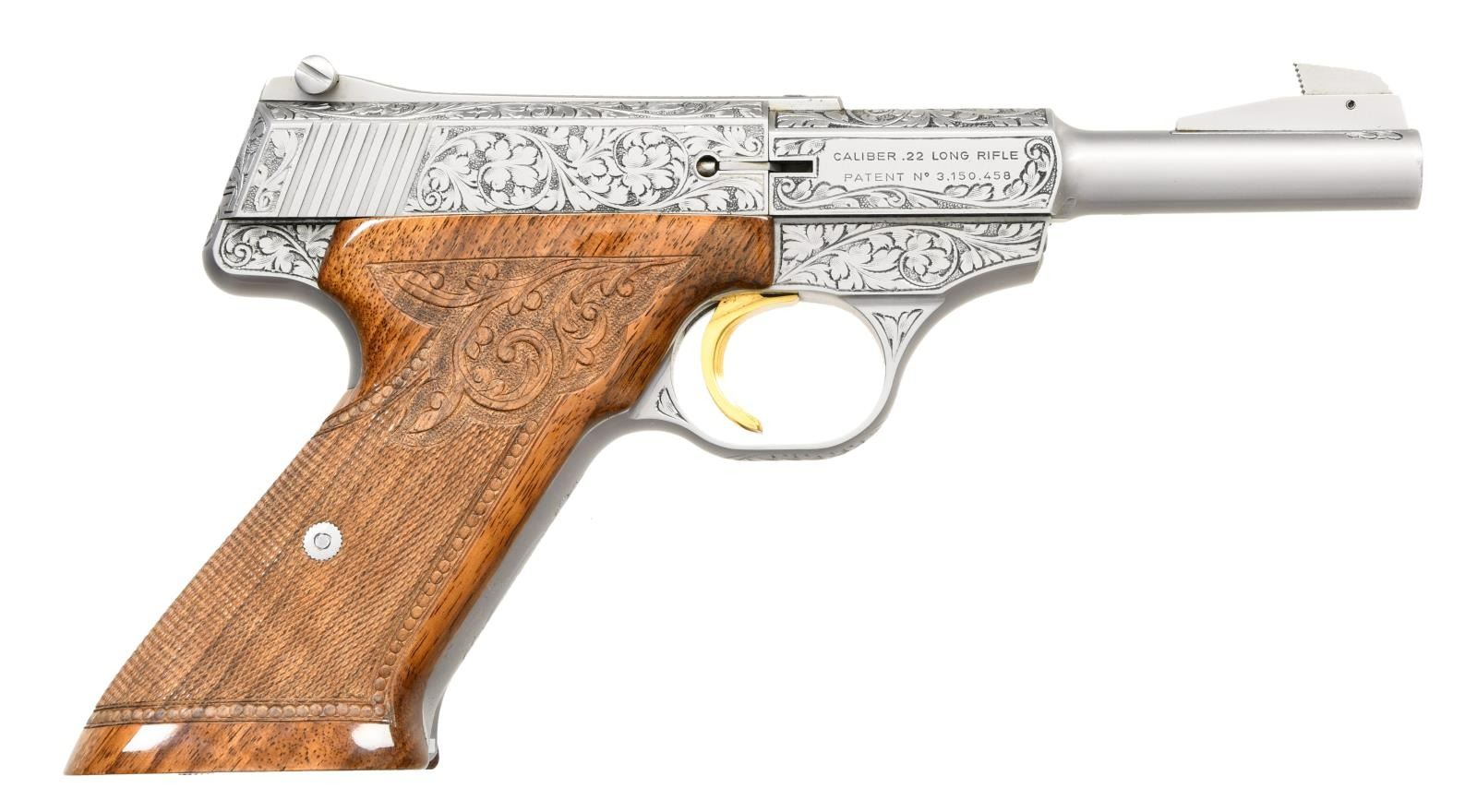 CHALLENGER SEMI-AUTO PISTOL. Cal. 22 LR. S# 40549U71. Bbl. 4 3/4" w/ ramped back cut squared blade having serrated face; factory adjustable rear that extends to rear of frame. Mfg. 1971 as 2 bbl. cased set w/ internet references indicating less than 10 produced as Renaissance model w/ extra bbl. Challenger model mfg. 1962-1975, Challenger II from 1975-1982 & Challenger III from 1982-1985. Very nice foliate scroll engraving w/ dark punch dot backgrounds. Gold plated wide serrated target trigger. Gloss finished fancy walnut grips having carved scroll pattern at top of each side plus bordered fine LPI cut checkering. Safety, mag. latch & slide lock are black; balance of finish is grey satin nickel. MAGS: 1 factory 10 rd. UNATTACHED ACCESSORIES: Dark blue leatherette lockable case having rectangular brass plaque on lid, compartmentalized medium blue velvet interior for pistol & its matching engraved 6 3/4" bbl. Unmarked Browning style black zippered pouch w/ red flannel lining. Original manual & case key. CONDITION: all aspects of entire set are near excellent including bores; appears new & unfired. PROVENANCE: The Collection of Gun Sport Ltd. owned by Jon R. Thomas. (23-3927/NW). CURIO. $3,500-4,500.