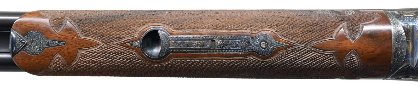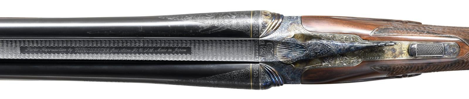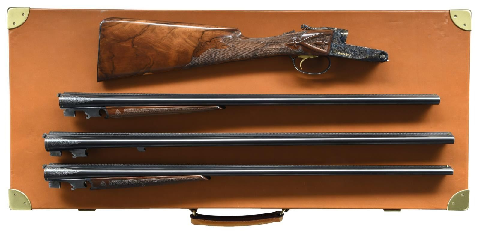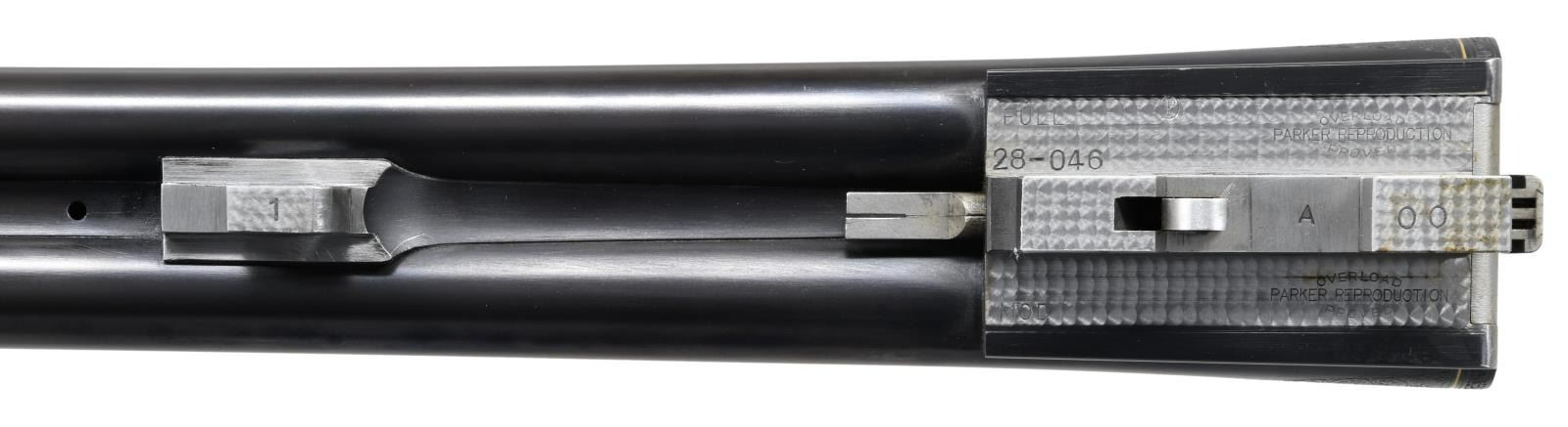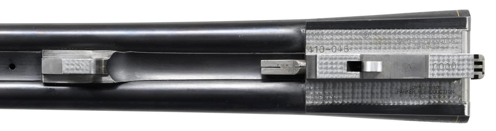 SMALL GAUGE 3 BARREL SET TWO 28 GAUGE AND ONE .410 WITH CASE. Cal. 28 Ga. (2 3/4"), .410 (3"). S# A-1 28-046. This scarce gun; 1 of 150 with standard factory engraving and 1 of 16, 28 Ga./.410 combinations is made with and extra set of short (26") 28 Ga. barrels. First set of 28 Ga. and .410 barrels measure 28". The 28" 28 Ga. barrels (choked Mod. & Full) are stamped "1" on loop, the 26" (Q1 & Q2) "2" and the .410 barrels (IC & Mod.) "3". All numbers match except .410 barrels have 410 prefix. Ribs are marked with Winchester reproduction info and "Made in Japan". Gold lines are inlaid around breech ends which are also embellished with 2 1/2" triangles of scroll engraving. Decorative bands are also around muzzles. Barrel flats are engine turned and stamped with Parker reproduction proofs, chokes, S#'s and Winchester proofs. Frame size "00" is on 28 Ga. barrels and "0000" is on .410 barrels. Case hardened small size Parker action with lightening cuts in watertable features automatic safety ("SAFE" inlaid in gold) and gold plated single selective trigger with checkered finger blade. Action is well filed with 3 beads around fences, but no special treatment is given to juncture of bottom and sides. Action is engraved in standard late A-1 special pattern with near full coverage of well cut shaded scroll within scroll and geometric borders. This scroll surrounds scenes of dogs on sides. A pair of pointers are on left and setters on right. "Parker Bros" is in gold under each dog scene. A pointer and setter are on bottom of action and a spaniel retrieving a dove is on trigger plate. Blued top lever has filed in chevron and thumb piece is pierced and carved with scrolls. Trigger guard has two piercings in bow which is engraved with flying woodcock, flanked by scroll. S# is in gold on tang. Straight grip buttstock of somewhat figured and lightly marbled European walnut measures 14 1/4" over skeleton steel buttplate. Central wood is checkered with fleur de lis intrusion. Side panels with fleur de lis drop points are recessed around large relief carved fleur de lis and are nicely checkered. Grip checkering is of classic A-1 special style with fancy outline and flares toward comb. 28 Ga. barrels share one splinter forend, .410 barrels have their own which has "410" prefix which matches number on barrels. Forend irons are engine turned. Fleur de lis checkering matches buttstock. MEASUREMENTS: DAH: 2 3/8". DAC: 1 5/16". CAST: approx. 1/2" off. LOP: 14 1/4". WEIGHT: 6 lb. 6 oz. UNATTACHED ACCESSORIES: gun is housed in its original oak and leather case with zippered leather trimmed canvas outer cover. Interior is lined in green felt and an oval Parker Reproduction label is in lid. Bottom compartment is configured for action and all barrels and contains "Parker" marked snap caps and oil bottle. Two keys are in leather retainer. A pair of .410 snap caps are include and are in their original wrapping. CONDITION: exceptionally fine. Does not appear to have been fired since proof. Barrels show only the faintest assembly and handling marks. Action retains essentially all of its very delicate original factory color with perhaps a hint of silvering on fences from contact with case. Wood shows only a few light marks. Checkering is crisp and bright. Bores are bright and shiny. Gun was not tested for functioning so not to cause any wear or possible marking. (.410 barrels assembled for photo & measurement.) Case leather is very fine as protected by its outer cover which shows some minor rubs. Interior cloth, label, partitions and accessories are also very fine, close to as new. All of the Parker/Winchester Reproduction guns continue to increase in value every year. This is an opportunity to acquire one of the scarcest and most desirable variations. (23-4779/MGM). MODERN. $40,000-60,000.