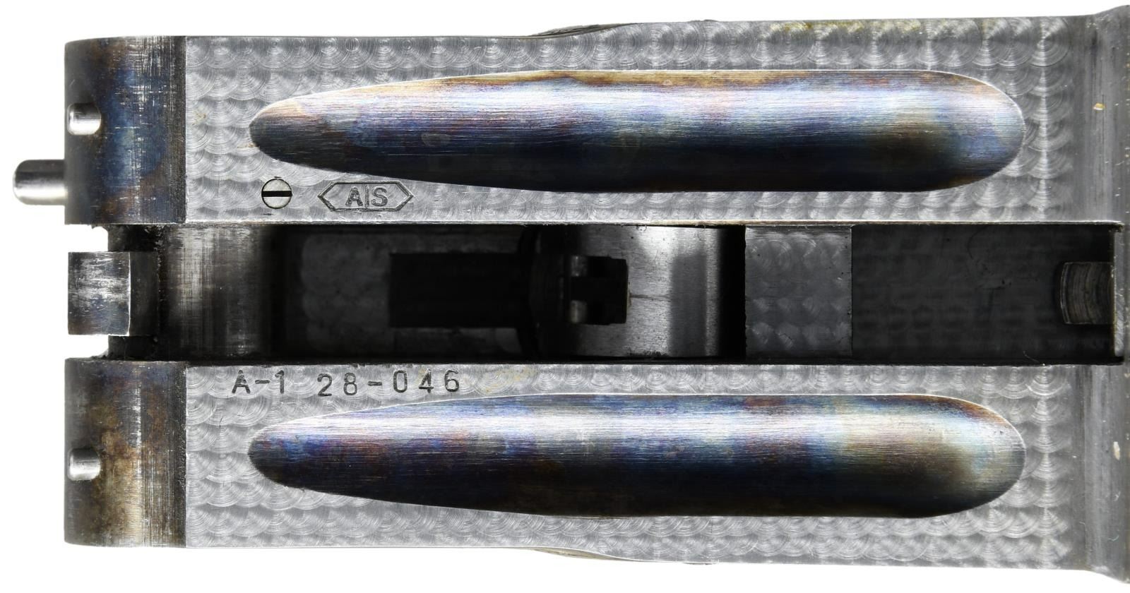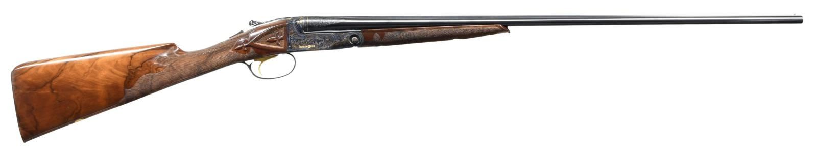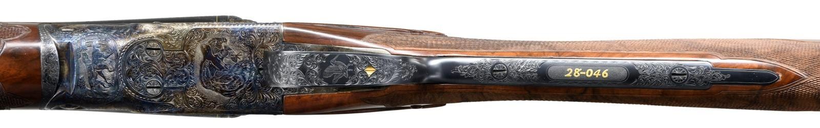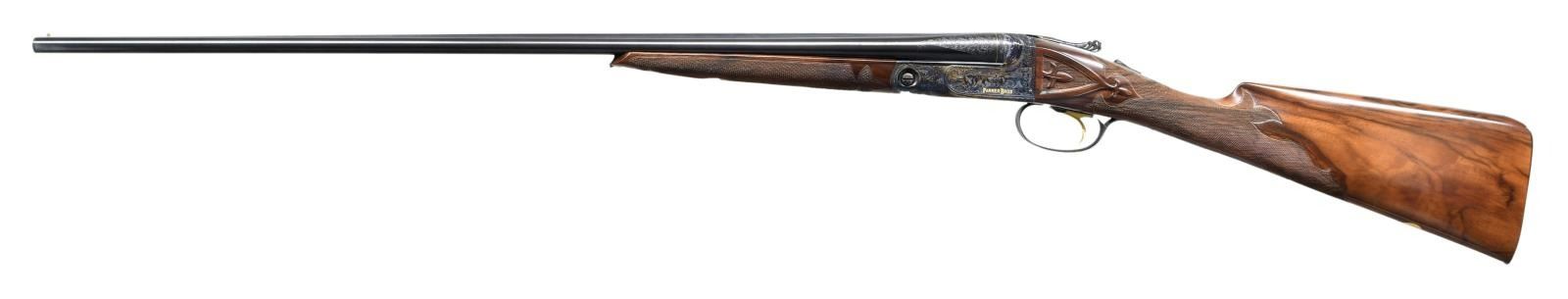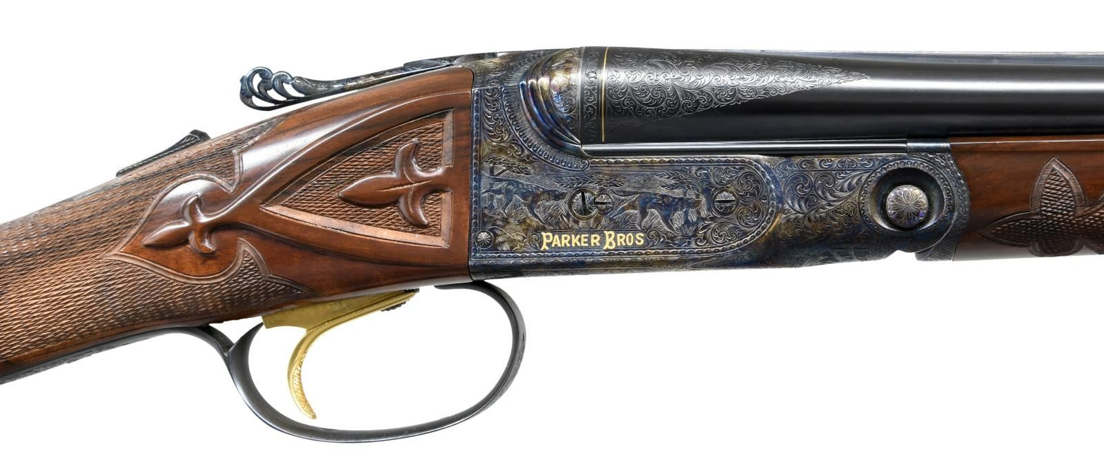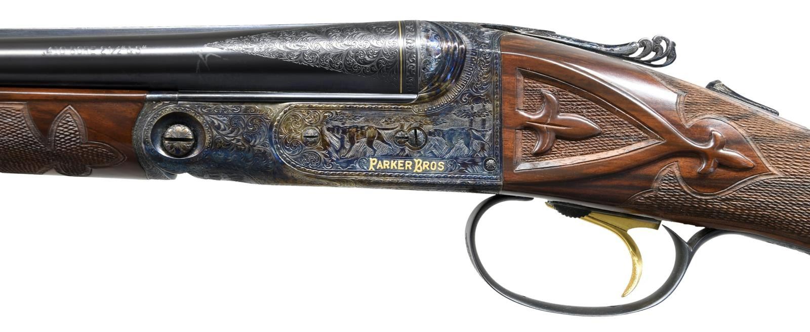 SMALL GAUGE 3 BARREL SET TWO 28 GAUGE AND ONE .410 WITH CASE. Cal. 28 Ga. (2 3/4"), .410 (3"). S# A-1 28-046. This scarce gun; 1 of 150 with standard factory engraving and 1 of 16, 28 Ga./.410 combinations is made with and extra set of short (26") 28 Ga. barrels. First set of 28 Ga. and .410 barrels measure 28". The 28" 28 Ga. barrels (choked Mod. & Full) are stamped "1" on loop, the 26" (Q1 & Q2) "2" and the .410 barrels (IC & Mod.) "3". All numbers match except .410 barrels have 410 prefix. Ribs are marked with Winchester reproduction info and "Made in Japan". Gold lines are inlaid around breech ends which are also embellished with 2 1/2" triangles of scroll engraving. Decorative bands are also around muzzles. Barrel flats are engine turned and stamped with Parker reproduction proofs, chokes, S#'s and Winchester proofs. Frame size "00" is on 28 Ga. barrels and "0000" is on .410 barrels. Case hardened small size Parker action with lightening cuts in watertable features automatic safety ("SAFE" inlaid in gold) and gold plated single selective trigger with checkered finger blade. Action is well filed with 3 beads around fences, but no special treatment is given to juncture of bottom and sides. Action is engraved in standard late A-1 special pattern with near full coverage of well cut shaded scroll within scroll and geometric borders. This scroll surrounds scenes of dogs on sides. A pair of pointers are on left and setters on right. "Parker Bros" is in gold under each dog scene. A pointer and setter are on bottom of action and a spaniel retrieving a dove is on trigger plate. Blued top lever has filed in chevron and thumb piece is pierced and carved with scrolls. Trigger guard has two piercings in bow which is engraved with flying woodcock, flanked by scroll. S# is in gold on tang. Straight grip buttstock of somewhat figured and lightly marbled European walnut measures 14 1/4" over skeleton steel buttplate. Central wood is checkered with fleur de lis intrusion. Side panels with fleur de lis drop points are recessed around large relief carved fleur de lis and are nicely checkered. Grip checkering is of classic A-1 special style with fancy outline and flares toward comb. 28 Ga. barrels share one splinter forend, .410 barrels have their own which has "410" prefix which matches number on barrels. Forend irons are engine turned. Fleur de lis checkering matches buttstock. MEASUREMENTS: DAH: 2 3/8". DAC: 1 5/16". CAST: approx. 1/2" off. LOP: 14 1/4". WEIGHT: 6 lb. 6 oz. UNATTACHED ACCESSORIES: gun is housed in its original oak and leather case with zippered leather trimmed canvas outer cover. Interior is lined in green felt and an oval Parker Reproduction label is in lid. Bottom compartment is configured for action and all barrels and contains "Parker" marked snap caps and oil bottle. Two keys are in leather retainer. A pair of .410 snap caps are include and are in their original wrapping. CONDITION: exceptionally fine. Does not appear to have been fired since proof. Barrels show only the faintest assembly and handling marks. Action retains essentially all of its very delicate original factory color with perhaps a hint of silvering on fences from contact with case. Wood shows only a few light marks. Checkering is crisp and bright. Bores are bright and shiny. Gun was not tested for functioning so not to cause any wear or possible marking. (.410 barrels assembled for photo & measurement.) Case leather is very fine as protected by its outer cover which shows some minor rubs. Interior cloth, label, partitions and accessories are also very fine, close to as new. All of the Parker/Winchester Reproduction guns continue to increase in value every year. This is an opportunity to acquire one of the scarcest and most desirable variations. (23-4779/MGM). MODERN. $40,000-60,000.