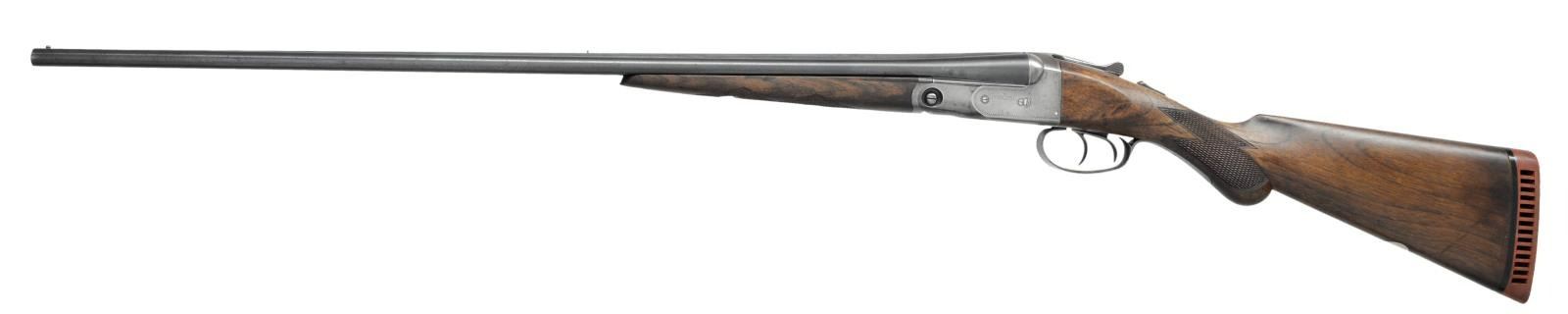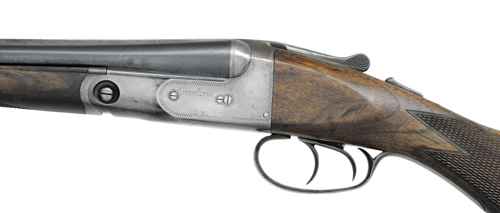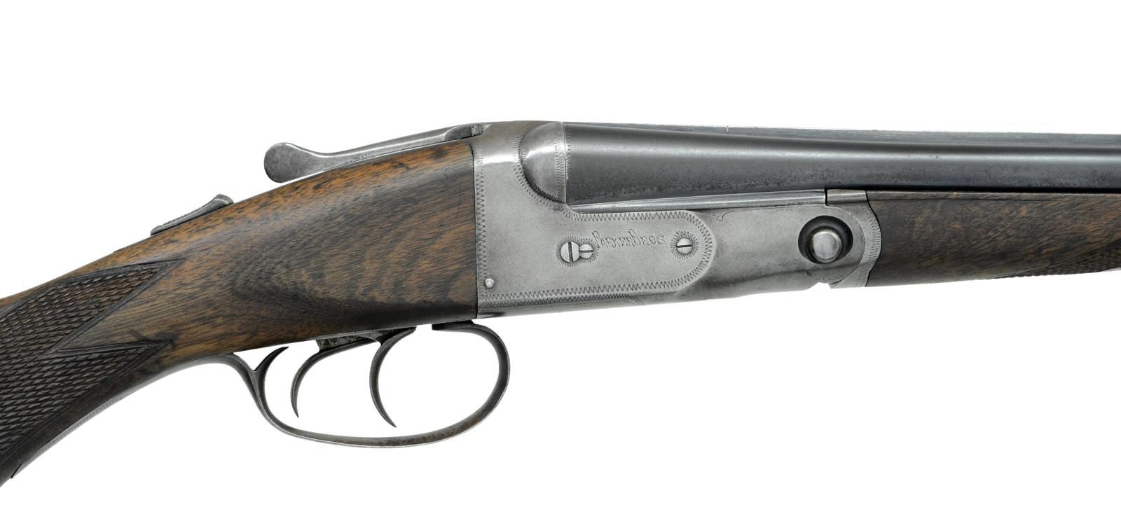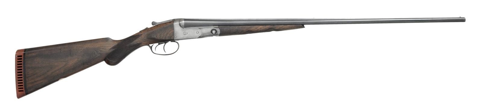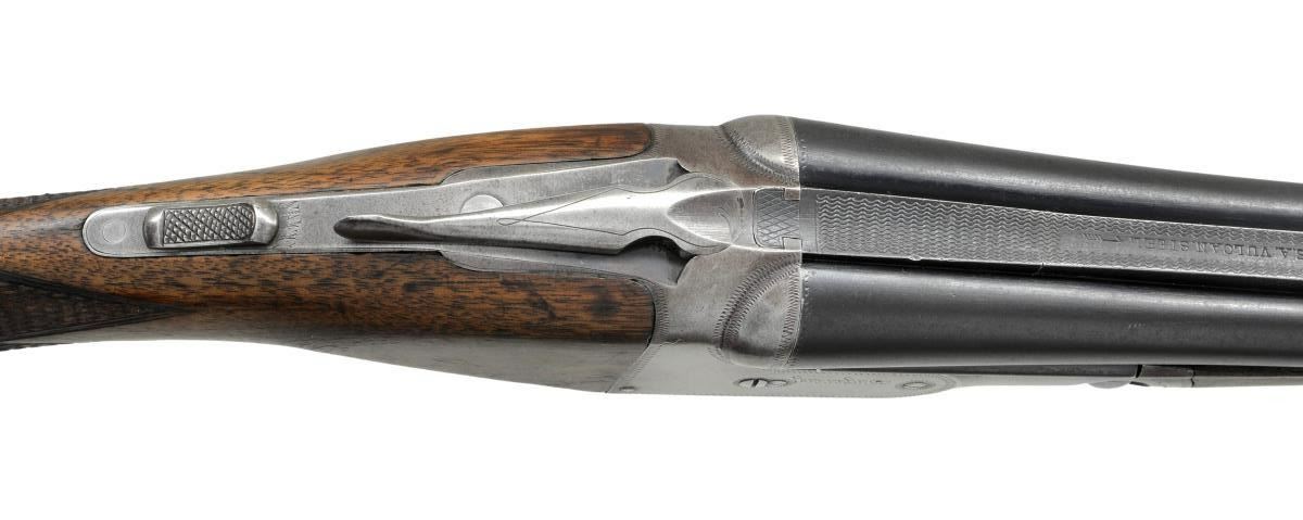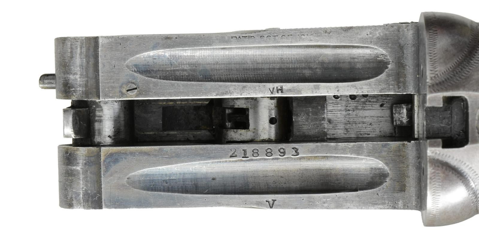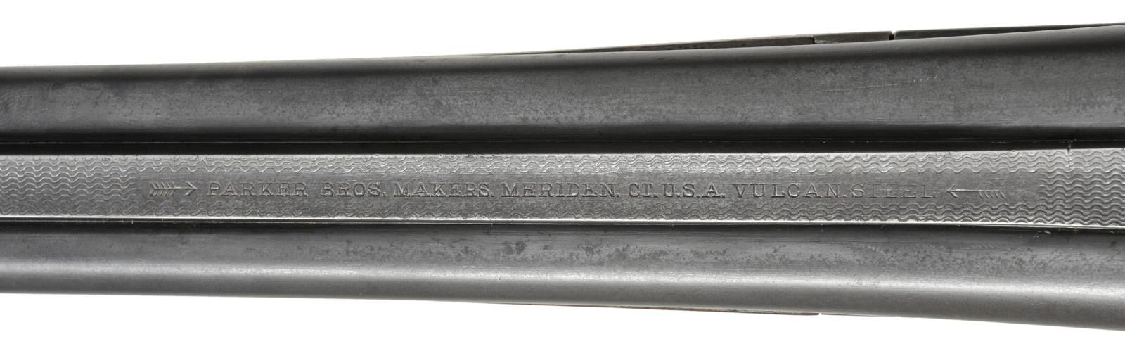 Cal. .410 2-1/2" chambers. S# 218893. It is estimated that fewer then 500 .410 V grade guns were made; most had 26" barrels as is the case with this gun. Rib is marked with usual Parker Meriden CT address and "VULCAN STEEL". All correct markings are on watertable and lumps, rear lump stamped "410" and frame size "000". Small size Parker action with all correct markings on watertable features automatic safety and double triggers. Action is engraved in usual V style with wiggle borders. "Parker Bros" is on each side. SN is on trigger guard tang. Round knob pistol grip buttstock of plain American walnut measures 14-1/8" over Hawkins pad. Point pattern checkering is at grip and a vacant silver oval is on toeline replacing the ususal shield. Matching splinter forend has usual Parker release and steel tip. MEASUREMENTS: BBLS: Bore Diameter at muzzles: L .395 (Mod?). R .395 (Mod?). STOCK: DAH: 2-13/16". DAC: 1-3/4". CAST: neutral. LOP: 14-1/8". WEIGHT: 5lb. 7.5oz. CONDITION: good. Barrels retaining perhaps 40% of what appears to be original blue with light freckling and browning overall. Action has traces of case hardening color where protected but is mostly pewter gray with some brown staining. Stocks with nearly all of an oil refinish over a good number of marks and dings. Checkering recut. Bores are bright and shiny with a few minor pits observed in right barrel. Action is tight, mechanically good. (23-1400/MGM). C&R $10,000-15,000.