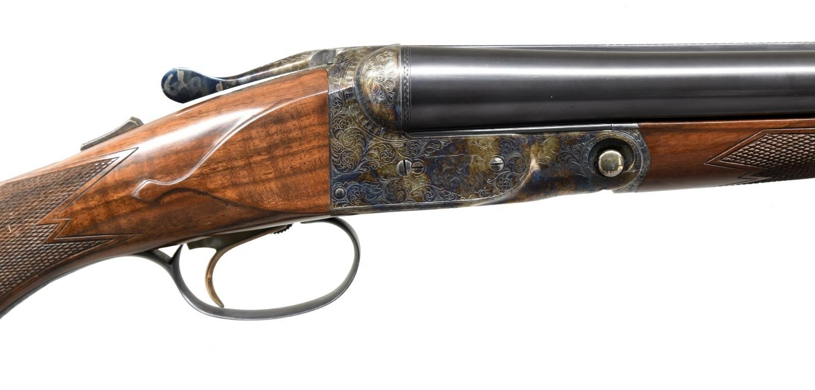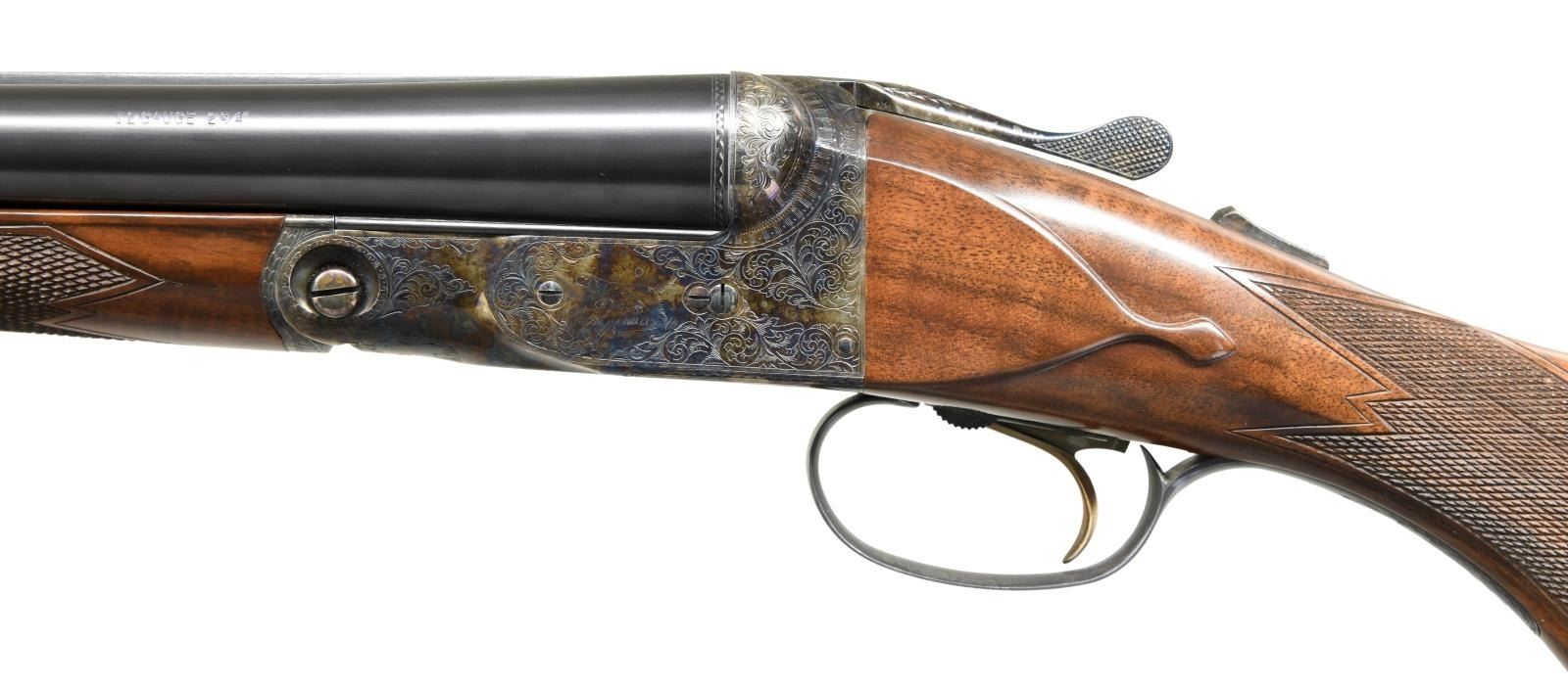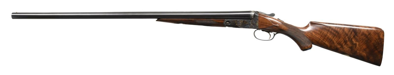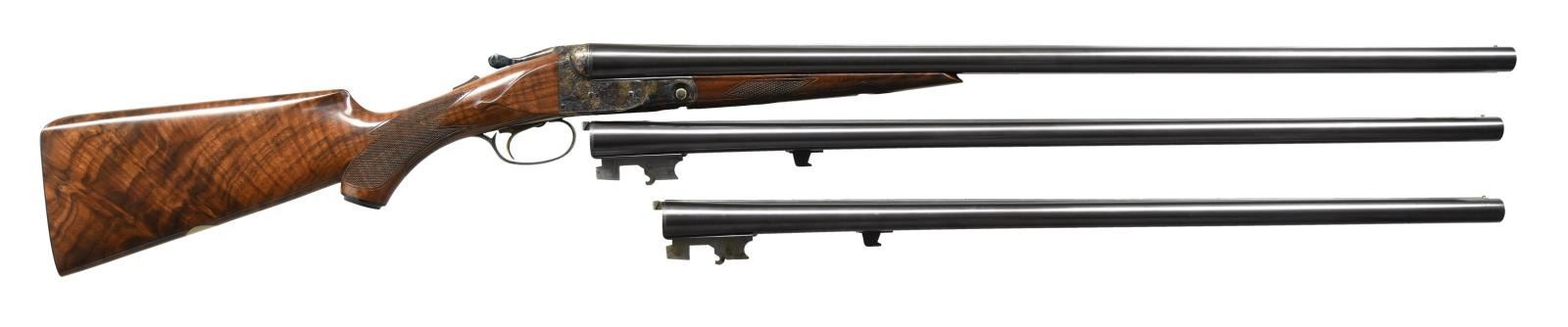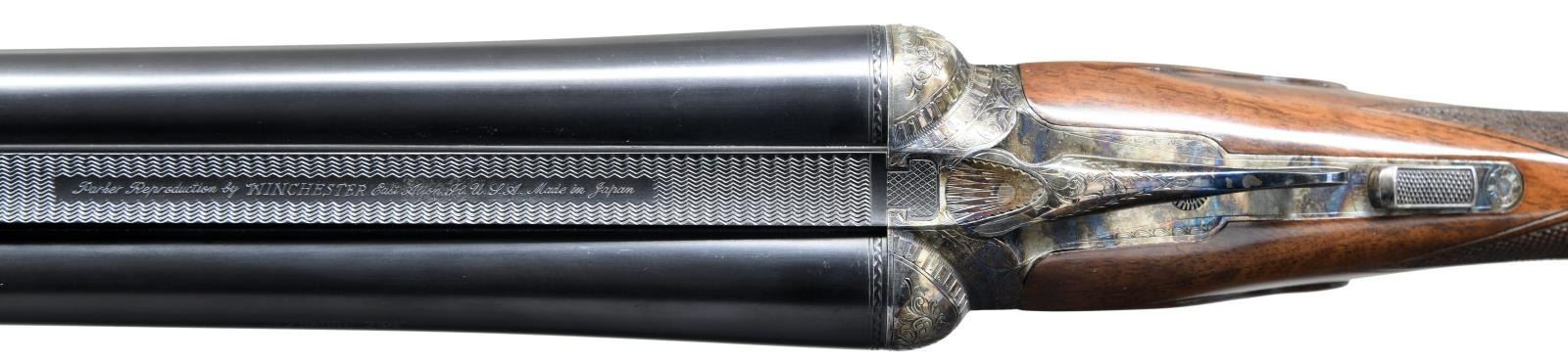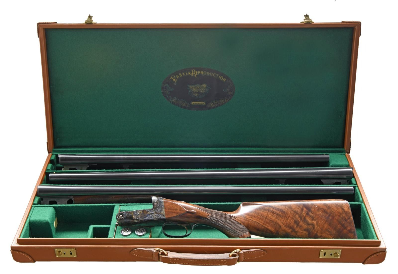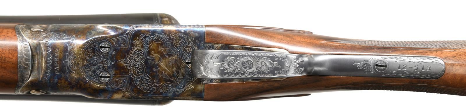 SET WITH CASE. Cal. 12 Ga. 2-3/4". S# 12-00513. Records indicate that only 1800 DHE 12 Ga. guns were made. This 3 barrel set is very unusual; perhaps unique. Barrels are all 12 gauge 1-1/2" frame with matching markings and S#'s. Set #1 is 28" marked for Mod & Full. Set #2 is 26" marked for IC & Mod. 3rd set without number stamp on loop appears to be type used for the "Steel Shot Special". It measures 28" long and is marked for 2-3/4" and 3" chambers with IC & Mod chokes. "H" is stamped on lump. Case hardened 1-1/2 size Parker action with automatic safety and single selective trigger is engraved in usual D reproduction style with dogs on sides, Parker on bottom and pheasant on trigger plate. Capped pistol grip buttstock of nicely crotch figured walnut measures 14-3/8" over skeleton steel buttplate. Stock has usual checkering, drop points and silver oval. Matching splinter ejector forend serves all barrel sets. MEASUREMENTS: Barrel Set #1. STOCK: DAH: 2-1/16". DAC: 1-1/4". CAST: neutral. LOP: 14-3/8". WEIGHT: 6 lb. 15 oz. UNATTACHED ACCESSORIES: gun is housed in a Parker Reproduction brown leather case with outer cover. Case is configured for gun and all 3 barrel sets. It also contains snap caps and associated Parker paperwork including information booklet. Also included is original white cardboard shipping box for this gun with label listing barrel sets #1 & #2. CONDITION: exceptionally fine. Appears essentially unfired since proof. With only a very few assembly and handling marks in all factory finishes. Very delicate case hardening color is quite strong showing some light silvering on left fence. Mechanically crisp. Case is very fine as protected by its outer cover which shows some minor rubs. (23-1272/MGM). MODERN. $4,000-8,000.