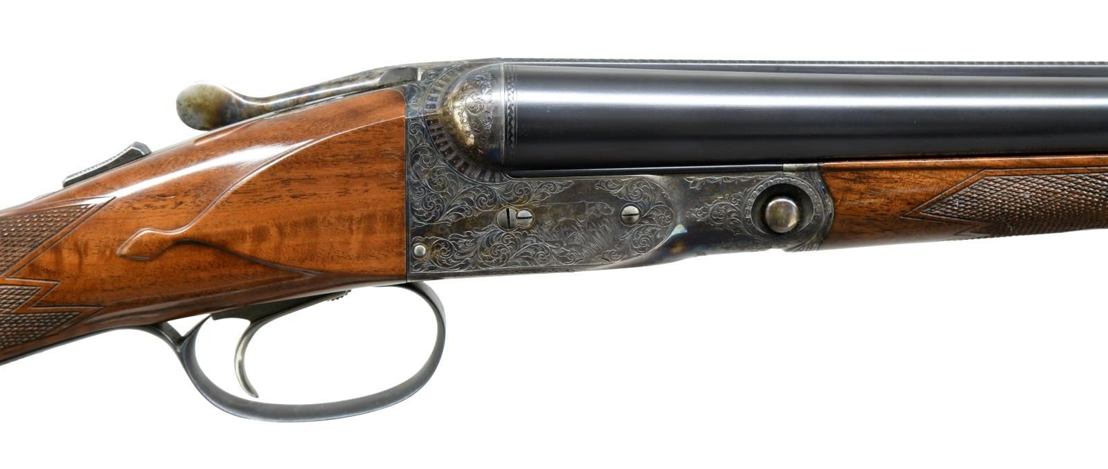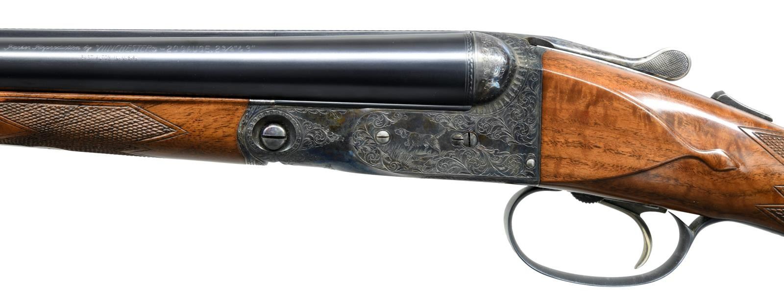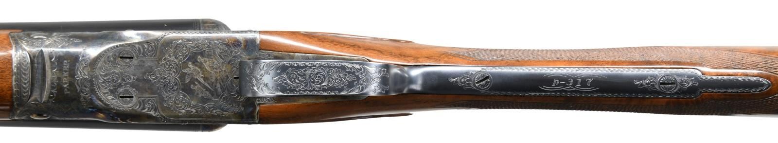 Cal. 20 ga. 2 3/4 & 3". S#. P-00317. Bbls: 28" with brass bead. Fixed Mod & Full chokes. Case colored "O" frame action has standard DH engraving. Selective ejectors. Nickel finished SST. Steel tipped splinter forend and straight grip stock of fancy walnut has D grade checkering & oval nameplate on toe line. LOP: 14 1/2" to a checkered butt with skeleton steel buttplate. DAC: 1 3/8". DAH 2 1/4". Stock has a slight cast on. Weight: 6 lbs. 10.8 ozs. UNATTACHED ACCESSORIES: Parker repro tan case containing cleaning rod, 2 snap caps, 2 brushes & key in bubble wrap. CONDITION: Action retains over 95% case colors showing slight edge & carry wear. Over 98% blue. Stocks have very good finish with a few scratches. Right side of butt has a grain check extending from the buttplate. Bright near excellent bores. (23-1286/DS). MODERN. $3000-4000.