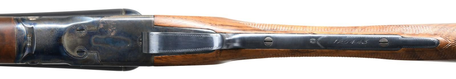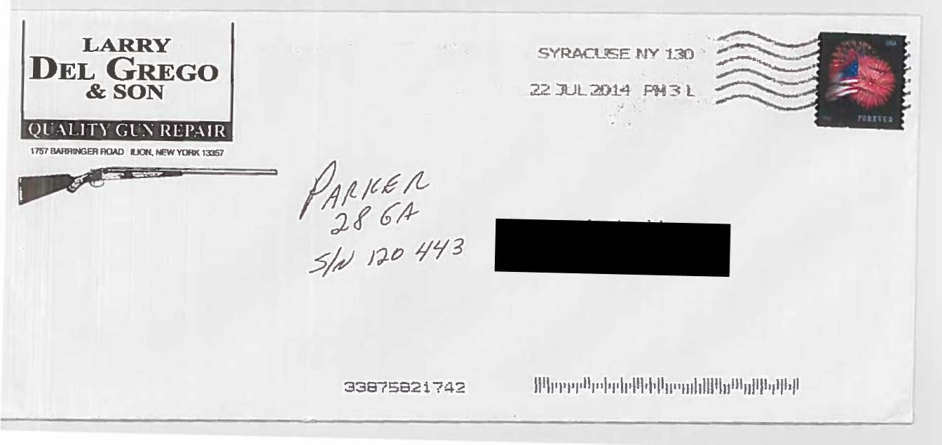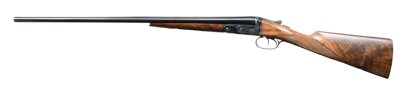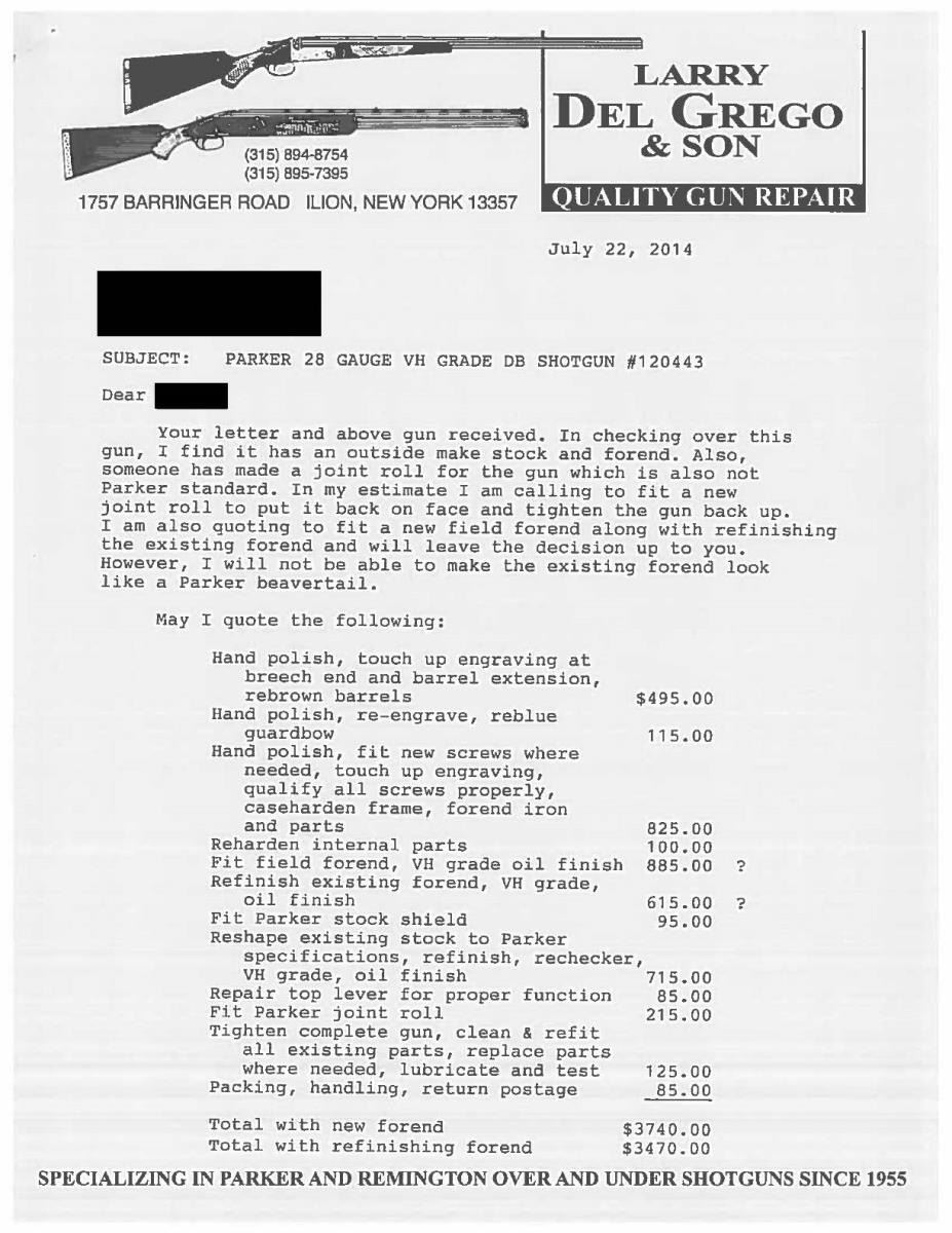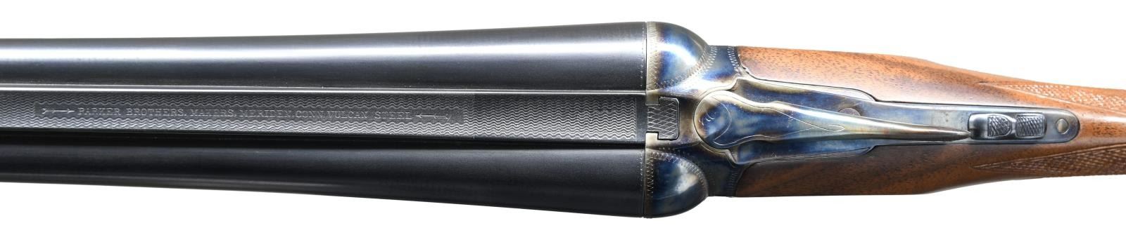 STRAIGHT GRIP STOCK. Cal. 28 Ga. 2-3/4" chambers. S# 120433. An estimate from Larry Del Grego dated July 2014 outlines work to be done on this gun to the total of $3,740.00. Obviously this work was preformed. This gun has 26" barrels with Parker info and "VULCAN STEEL" on matted rib. All correct factory markings are on barrel flats and lump is stamped with frame size "0". Small size casehardened Parker action with non-automatic safety and double triggers is engraved with wiggle borders and "Parker Bros." on sides. S# is on trigger guard tang and all correct numbers and markings are on watertable. Straight grip buttstock of nicely crotch figured American walnut measures 14" over checkered wood butt. Stock features point pattern checkering and classic Parker shield on toe line. Matching splinter forend has usual release with patent info. MEASUREMENTS: BBLS: Bore Diameter: L .555. R .552. Restriction: L .022 (Full) R .022 (Full). Wall thickness: L .026. R .027. STOCK: DAH: 2-3/8". DAC: 1-1/2"+. CAST: slightly off. LOP: 14". WEIGHT: 6 lb. 4 oz. UNATTACHED ACCESSORIES: Larry Del Grego letter dated July 2014. CONDITION: very fine as completely refurbished retaining essentially all new factory type finishes as applied by Larry Del Grego. There is some noted staining and fingerprints on bottom of action and a very few minor marks in other finishes. Bores show light frosting. Action is tight. Mechanically good. "The Parker Story" estimates that 772 VH guns were made with 26" barrels. (23-2180/MGM). C&R. $4,000-6,000.