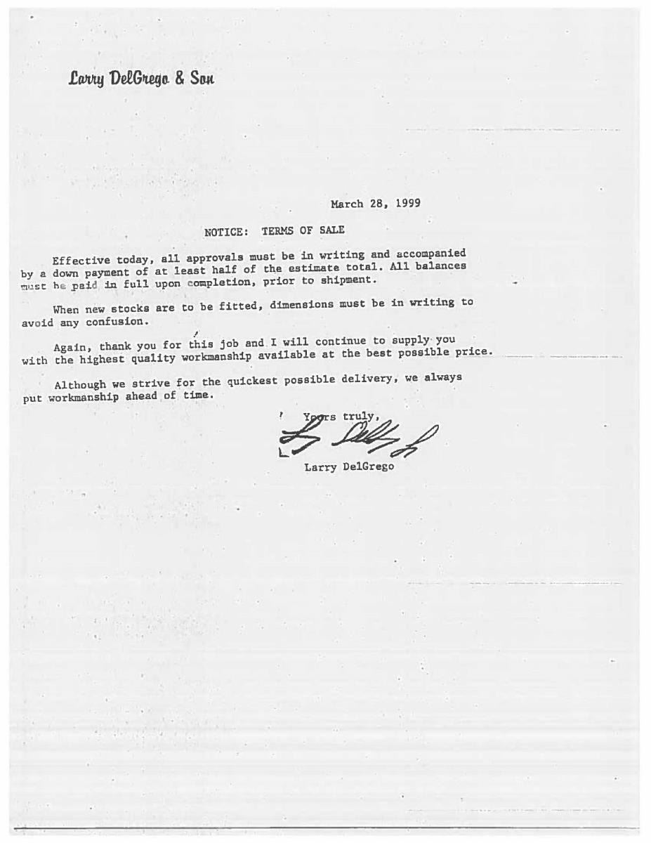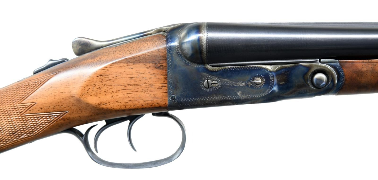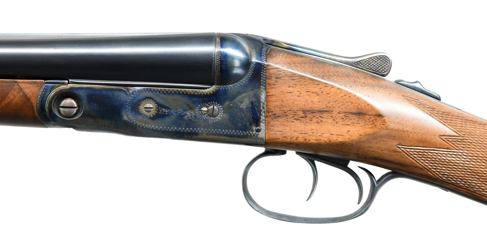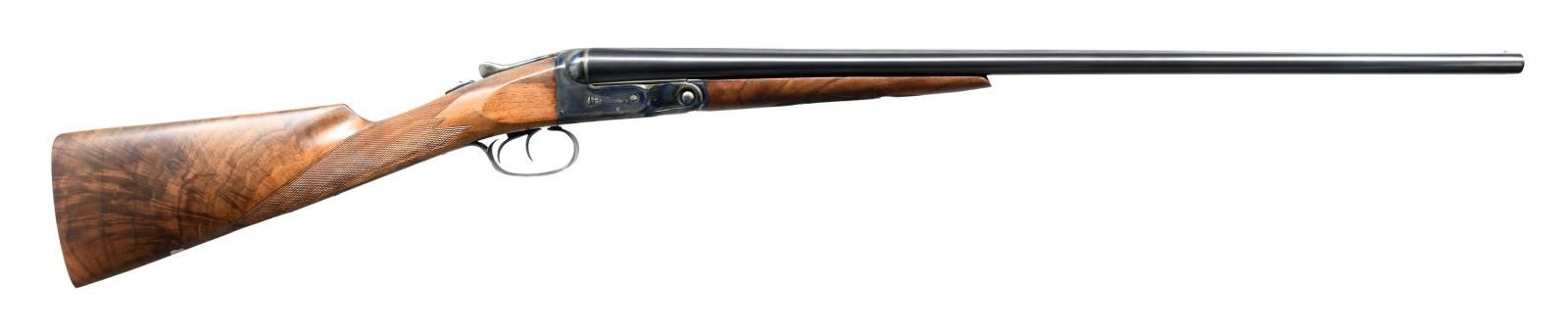 STRAIGHT GRIP STOCK. Cal. 28 Ga. 2-3/4" chambers. S# 120433. An estimate from Larry Del Grego dated July 2014 outlines work to be done on this gun to the total of $3,740.00. Obviously this work was preformed. This gun has 26" barrels with Parker info and "VULCAN STEEL" on matted rib. All correct factory markings are on barrel flats and lump is stamped with frame size "0". Small size casehardened Parker action with non-automatic safety and double triggers is engraved with wiggle borders and "Parker Bros." on sides. S# is on trigger guard tang and all correct numbers and markings are on watertable. Straight grip buttstock of nicely crotch figured American walnut measures 14" over checkered wood butt. Stock features point pattern checkering and classic Parker shield on toe line. Matching splinter forend has usual release with patent info. MEASUREMENTS: BBLS: Bore Diameter: L .555. R .552. Restriction: L .022 (Full) R .022 (Full). Wall thickness: L .026. R .027. STOCK: DAH: 2-3/8". DAC: 1-1/2"+. CAST: slightly off. LOP: 14". WEIGHT: 6 lb. 4 oz. UNATTACHED ACCESSORIES: Larry Del Grego letter dated July 2014. CONDITION: very fine as completely refurbished retaining essentially all new factory type finishes as applied by Larry Del Grego. There is some noted staining and fingerprints on bottom of action and a very few minor marks in other finishes. Bores show light frosting. Action is tight. Mechanically good. "The Parker Story" estimates that 772 VH guns were made with 26" barrels. (23-2180/MGM). C&R. $4,000-6,000.