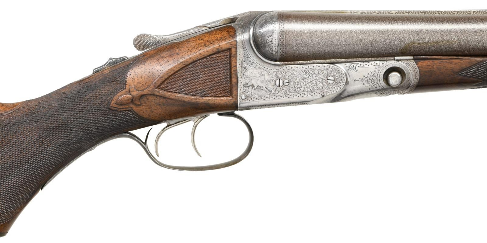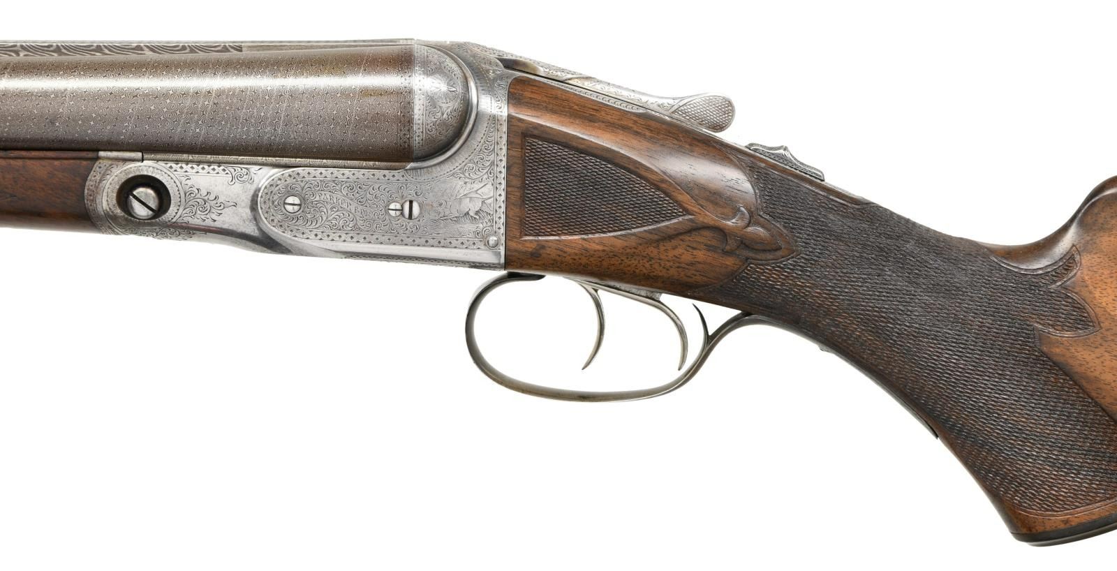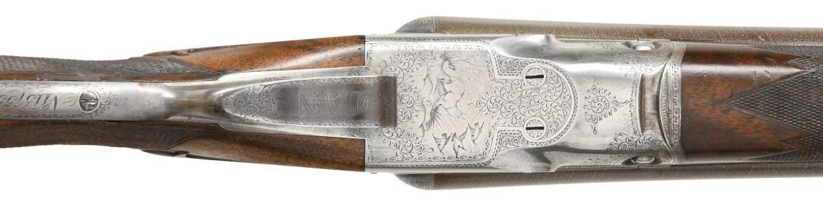 AND ORIGINAL MONTE CARLO STOCK. Cal. 12 Ga., 2 5/8". S# 113755. Bbl. 30" w/ very attractive, closely patterned damascus is marked "PARKER BROS. MAKERS. MERIDIAN CONN. DAMASCUS STEEL" on flat matted slightly raised pigeon rib. The Parker Story indicates that 228 BH guns were made w/ damascus steel bbls. Bbl. flats & lumps are stamped w/ all correct markings including Frame Size "2", Grade "C" & "DD" for bbl. quality. Case hardened frame w/ all correct markings on water table features automatic safety & nickel plated dbl. triggers. Action is filed & engraved in typical "B" fashion w/ single beads around fences & dbl. dogs (pointers on left, setters on right) on sides surrounded by scroll. This gun is unusual in that the borders are of knot work design. Grade B guns normally have unique scenes on trigger plates; this gun depicts a fox on hill side, flushing a trio of turkeys. Broadly marbled European walnut pistol grip buttstock measures 14 1/4" over "London Guns" solid red pad & features unusual Monte Carlo comb of a style & shaping noted on other known Parker examples. Checkered side panels end in nicely carved fleur-de-lis. Fancy pattern grip checkering has semi-fleur-de-lis intrusions toward comb. Hard rubber grip cap has lg. inset gold oval plate on bottom. Matching splinter forend has filed steel tip & usual Deeley type release. Both forend iron & bbl. loop of this set are stamped "1". The Parker Gun Identification Ledger relates that this gun came w/ an extra set of bbls., (not included w/ this lot). MEASUREMENTS: BORE DIA.: Left .733. Right .733. BORE RESTRICTIONS: Left .027 Mod. Right .024 Mod. WALL THICKNESS: Left .029. Right .029. DAH 3 5/16". Drop at Monte Carlo 2 1/4". DAC: 1 7/16". WEIGHT: 8 lbs. CONDITION: good as refinished, bbls. retaining nearly all of a very fine rebrown w/ excellent definition to intricate pattern. Action is mostly cleaned to bright silver w/ traces of case hardening color where protected. Stocks retain most of a well-done oil refinish. There is evidence that stock has been broken through wrist and repaired. Checkering recut. Newer pad is not well fitted. Bores are fine w/ one or 2 scattered pits. Action is slightly loose. (23-2116/MGM). CURIO. $3,500-5,000.