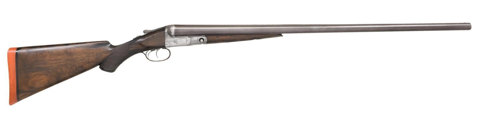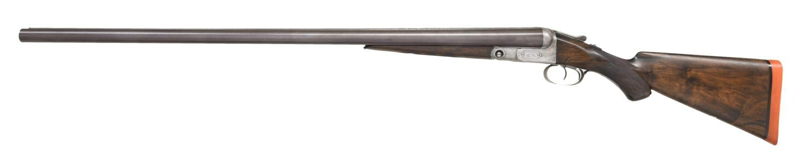 Cal. 10 ga. 2 7/8". S#. 138526. Bbls. 32" of Damascus Steel. Steel front bead. No. 3 frame action has GH grade engraving. Double triggers & extractors. Steel tipped splinter forend & hard rubber capped pistol grip stock of fancy thin shell walnut have GH grade checkering. German silver shield in toe line. LOP: 14 5/8" over an aftermarket solid orange London style pad. DAC: 1 5/8". DAH: 2 3/8". Near neutral cast. Bore diameter: R .778, L .778. Choke constriction: R .018, L .038. Weight: 9 lbs, 15.6 oz. 1907 mfg. CONDITION: Bbls. retain over 80% lightly faded browned finish showing some dark spotting. Action has faded to gray, engraving remains intact. Stocks are refinished with freshened checkering showing scattered marks & small dents. Bores are generally bright with some very light pitting. (23-1289/DS). CURIO. $2000-3000.