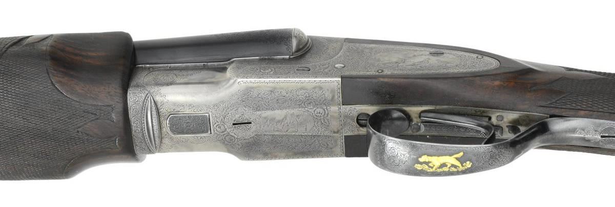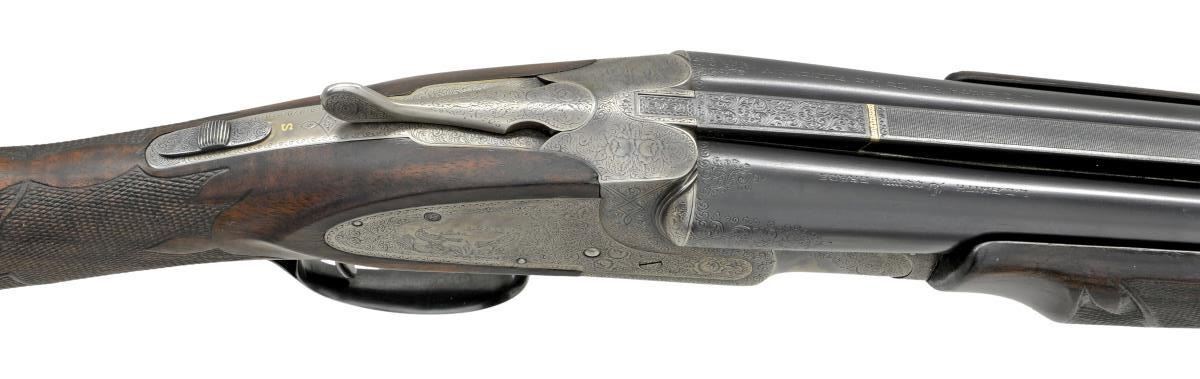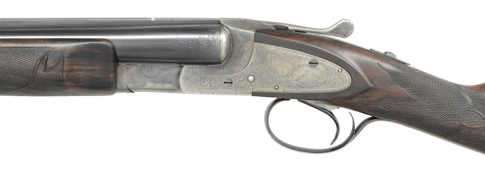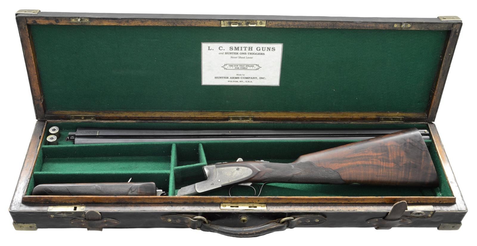 CROWN GRADE SXS SHOTGUN. Cal. 20 Ga. S# 26603. Bbl. 28" with single sighting plane rib having a gold bar forward of the engraved rib extension. Right bbl. engraved "L. C. SMITH CROWN GRADE". Left bbl. engraved "L. C. Smith Gun Co. Inc. Fulton, N. Y." White front & mid beads. Case colored Featherweight sidelock action. Selective ejectors. Hunter One single selective trigger. Crown grade engraving per order features Partridge on the right sideplate with quail on the left. Standard engraving has setters & pointers. The trigger guard bow features a special order raised gold pointing setter. The trigger plate depicts 4 flying ducks. Balance of action has fine arabesque scroll engraving with floral & geometric designs. The top lever engraving is very unusual as it lacks the typical gold crown. Beavertail forend and straight grip stock of exhibition thin shell walnut feature elaborate borderless segmented hand checkering. LOP: 13 3/4" from single trigger to checkered butt. DAC: 1 5/8". DAH: 2 1/4". Stock has a slight cast off. Bore dia; RT .610, LT Choke constriction: RT .013, LT .004, (uncommon reserved chokes). Minimum wall thickness: RT .038, LT .041. Weight: 6 lbs. 11.4 oz. UNATTACHED ACCESSORIES: L. C. Smith collectors Association Letter giving general information about L. C. Smith shotguns and listing specification for this gun. Record shows it was started on November 26, 1947 and completed January 20, 1948. The shipping address is nearly illegible but may be "Burbank Hardware Company", no address provided. The fact that the word "Monogram" was written next to "Crown" in the ledger and crossed out indicates confusion as to the grade. A total of 862 Crown grades were mfg. 1912-1950. "Only six of these were the same configuration as # 26603, and it is likely that no others were engraved in a similar pattern". Also included is a Cody Firearms Museum Records check confirming the information and adding a ship date of 5-6-1948. The gun is housed in an oak & leather luggage case with green velour fitted interior. The inside lid has a reproduction L. C. Smith paper label. Case contains a 2 piece wood cleaning rod & snap caps. CONDITION: the action retains over 40% lightly faded case colors. Over 95% lightly faded bbl. blue. Very good wood finish shows some scratches, small marks & mildew spots. Very good bright bores. (23-4780/DS). CURIO. $20,000-30,000.