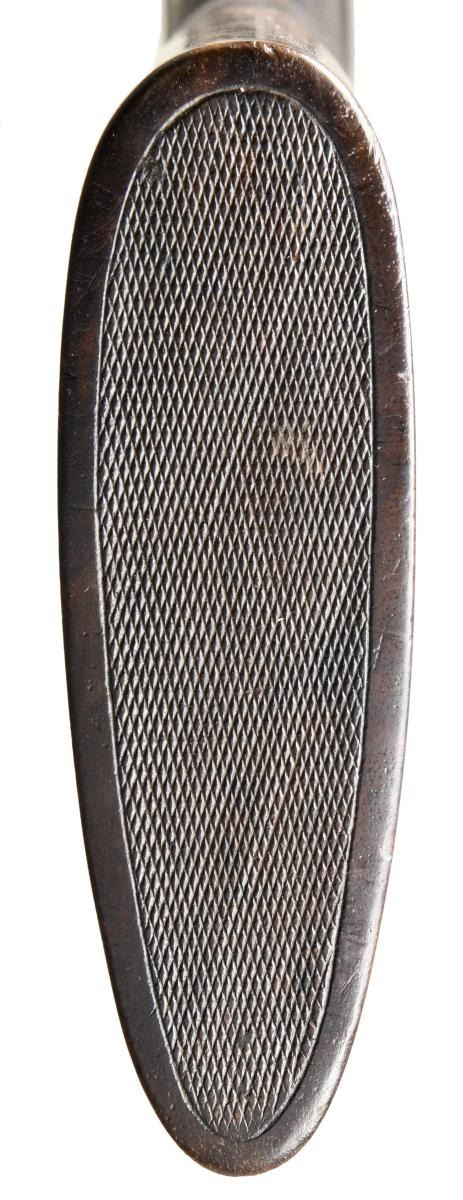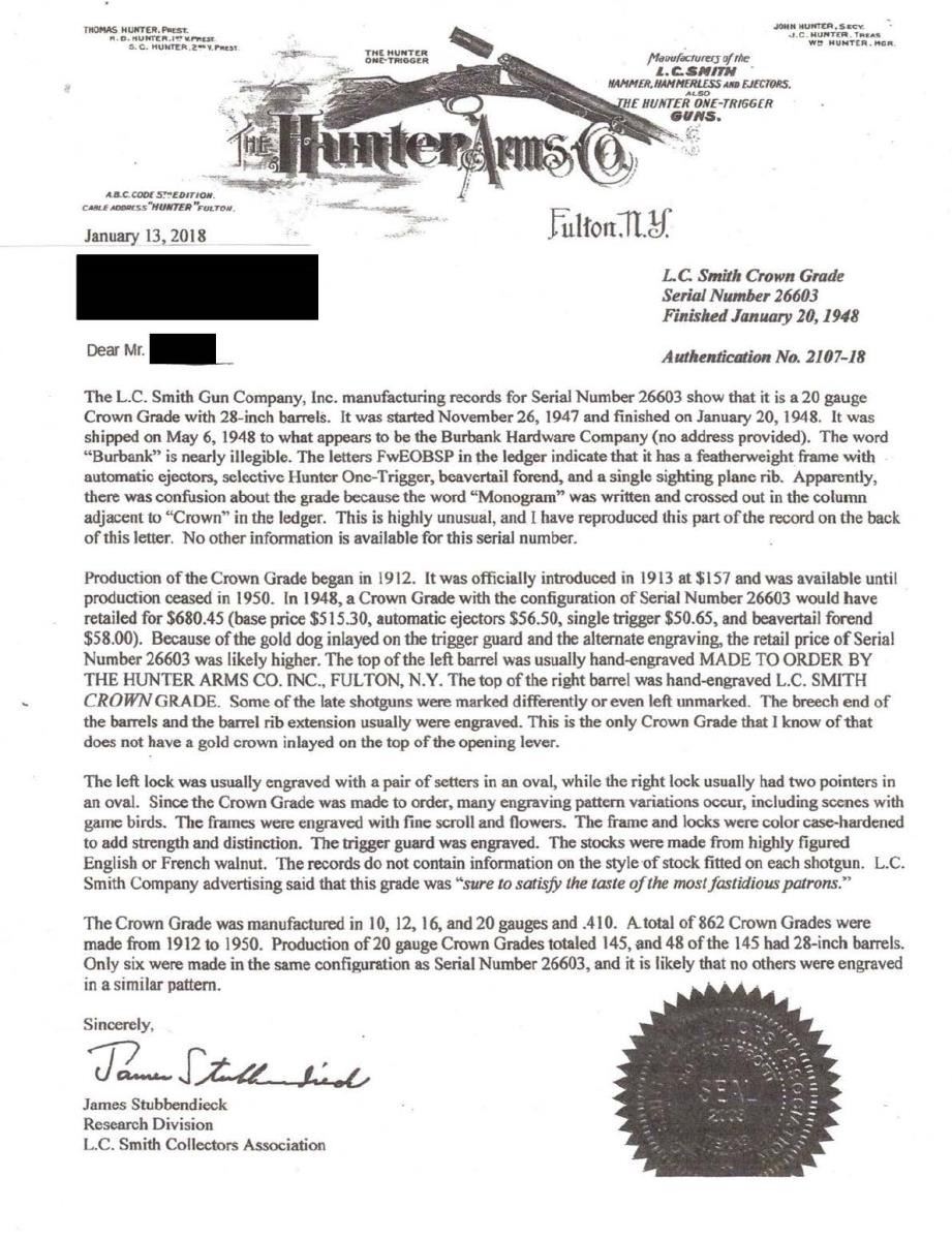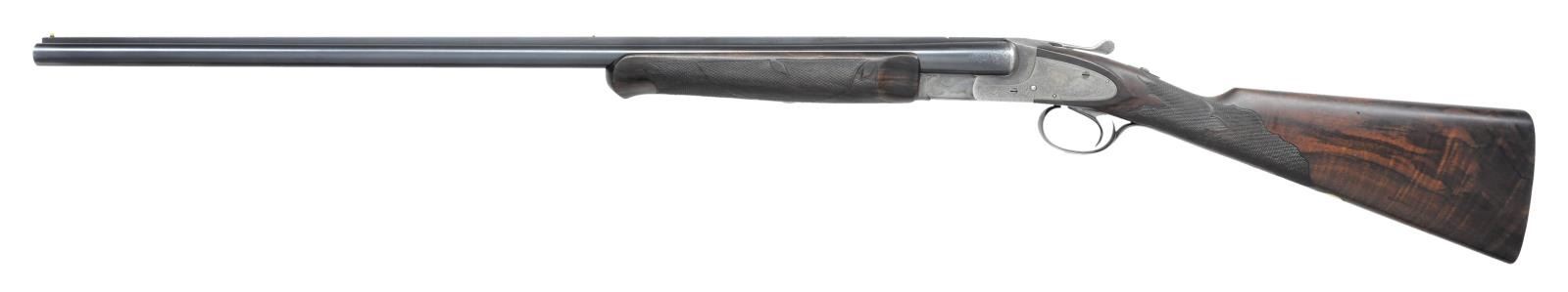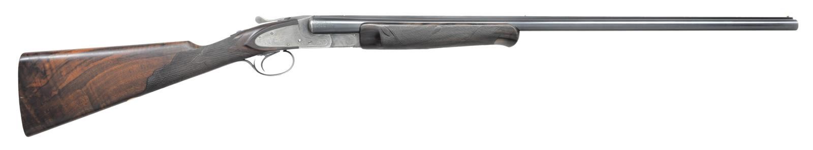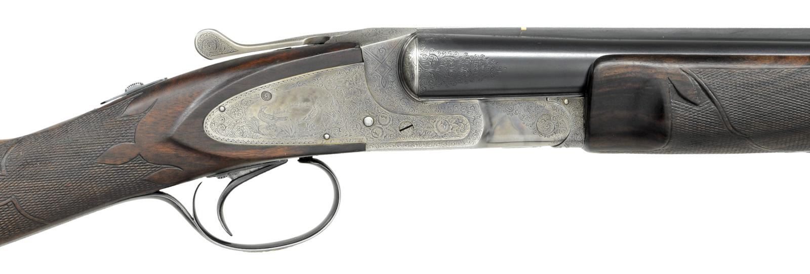 CROWN GRADE SXS SHOTGUN. Cal. 20 Ga. S# 26603. Bbl. 28" with single sighting plane rib having a gold bar forward of the engraved rib extension. Right bbl. engraved "L. C. SMITH CROWN GRADE". Left bbl. engraved "L. C. Smith Gun Co. Inc. Fulton, N. Y." White front & mid beads. Case colored Featherweight sidelock action. Selective ejectors. Hunter One single selective trigger. Crown grade engraving per order features Partridge on the right sideplate with quail on the left. Standard engraving has setters & pointers. The trigger guard bow features a special order raised gold pointing setter. The trigger plate depicts 4 flying ducks. Balance of action has fine arabesque scroll engraving with floral & geometric designs. The top lever engraving is very unusual as it lacks the typical gold crown. Beavertail forend and straight grip stock of exhibition thin shell walnut feature elaborate borderless segmented hand checkering. LOP: 13 3/4" from single trigger to checkered butt. DAC: 1 5/8". DAH: 2 1/4". Stock has a slight cast off. Bore dia; RT .610, LT Choke constriction: RT .013, LT .004, (uncommon reserved chokes). Minimum wall thickness: RT .038, LT .041. Weight: 6 lbs. 11.4 oz. UNATTACHED ACCESSORIES: L. C. Smith collectors Association Letter giving general information about L. C. Smith shotguns and listing specification for this gun. Record shows it was started on November 26, 1947 and completed January 20, 1948. The shipping address is nearly illegible but may be "Burbank Hardware Company", no address provided. The fact that the word "Monogram" was written next to "Crown" in the ledger and crossed out indicates confusion as to the grade. A total of 862 Crown grades were mfg. 1912-1950. "Only six of these were the same configuration as # 26603, and it is likely that no others were engraved in a similar pattern". Also included is a Cody Firearms Museum Records check confirming the information and adding a ship date of 5-6-1948. The gun is housed in an oak & leather luggage case with green velour fitted interior. The inside lid has a reproduction L. C. Smith paper label. Case contains a 2 piece wood cleaning rod & snap caps. CONDITION: the action retains over 40% lightly faded case colors. Over 95% lightly faded bbl. blue. Very good wood finish shows some scratches, small marks & mildew spots. Very good bright bores. (23-4780/DS). CURIO. $20,000-30,000.