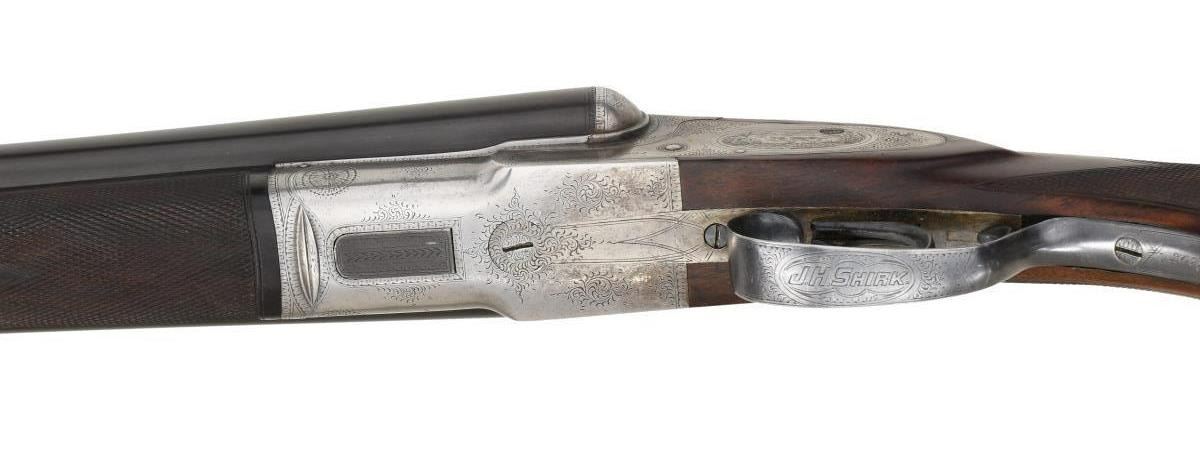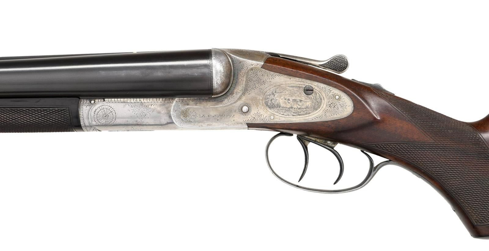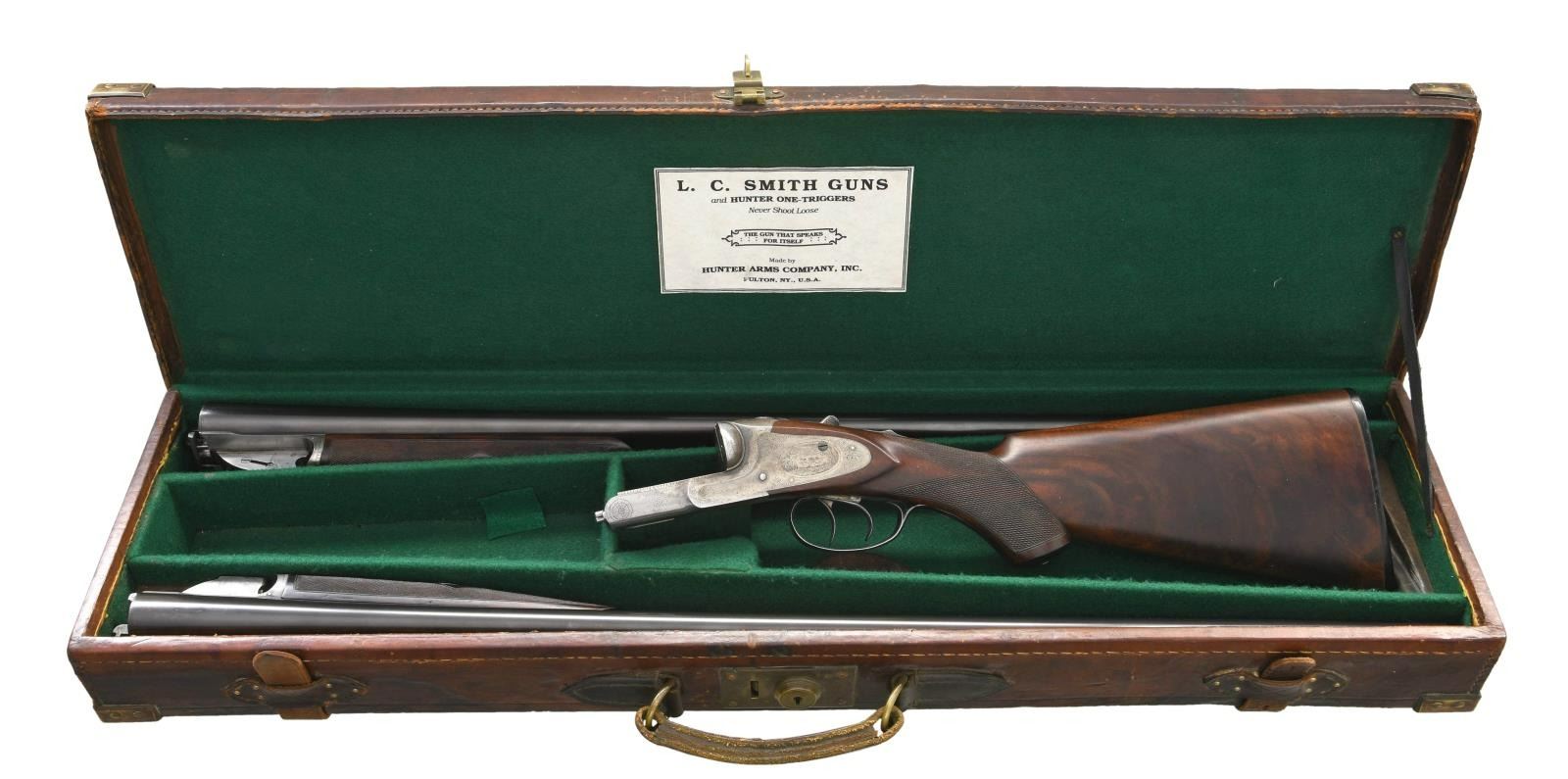 Cal.12 ga. 2 3/4" S#. 207255. Two barrel set, both barrels are 30" of Nitro Steel. This is the only Grade 4 shipped with 2 set of 30" barrels listed in the ledgers. Case colored sidelock action with selective ejectors & double triggers. The No. 4 engraving features oval scenes with pointing dogs. The scenes are surrounded by fine arabesque scroll that continues to upper & lower receiver areas as well as the trigger guard. the trigger guard bow is engraved with customer name "J. H. Shirk". The breech end of both bbls. have border line engraving. Rib extensions are marked "Hunter Arms Co., Fulton, NY". Each set of bbls has it individual splinter forend of ebony tipped thin shell walnut. Hard rubber capped pistol grip custom replacement stock of fancy walnut is checkered at the wrist. LOP: 13 1/2" over a proper style buttplate. DAC: 1 7/8". DAH: 2 5/8". Near neutral cast. BBL1: Bore diameter: RT .725, LT 727. Choke constriction: RT .034, LT .034. Minimum bore dia: RT .025, LT .030. BBL 2: Bore diameter: RT .729, LT .729. Choke constriction: RT .004, LT .020. Minimum bore dia: RT .026, LT .028. Weight: 7 lbs, 12.6 oz. UNATTACHED ACCESORIES: L.C. Smith Collectors Association letter providing general information & listing specifications for this gun as recorded on page 23 of Ledger 17. Completion date, January 26, 1907. Further stating "Serial Number 207255 was the only No. 4 shipped with two sets of 30" barrels." Total production of No. 4 shotguns from 1894-1915 was 495. No. 4 production in all gauges totaled 29 in 1907. Gun is housed in a leather covered case with green velour 2 bbl. fitted interior. Case lid exterior is marked with initials "H. S. M." Lid interior has an added L. C. Smith paper label. Case key is included. Case shows normal age related wear. CONDITION: Action retains 30% light case colors fading to a silvery gray. Both bbls. have over 95% blue. Both forearms are refinished with freshened checkering. Stock shows light wear & handling marks with hairline cracks behind both locks. All bore are very good & bright. (23-1616/DS) CURIO. $7000-10,000.