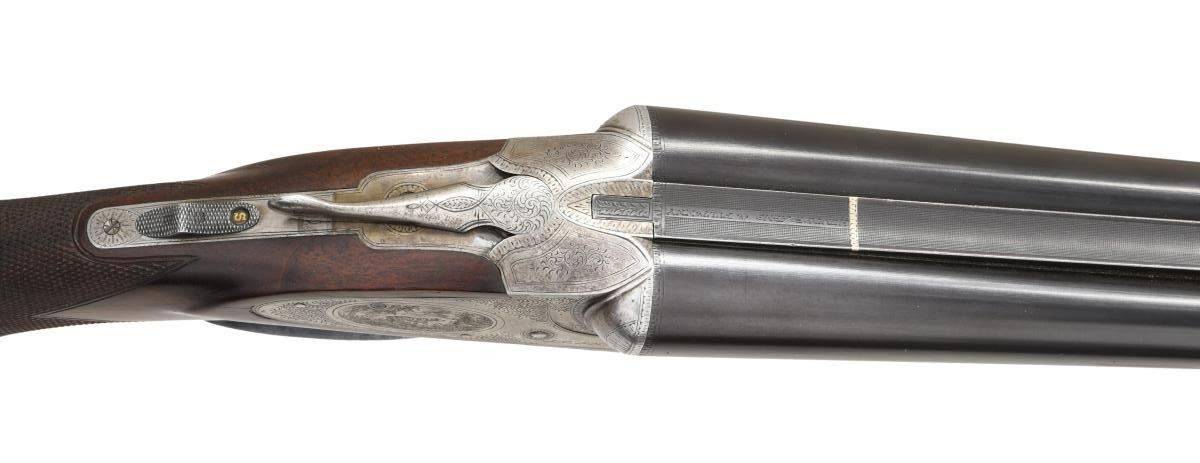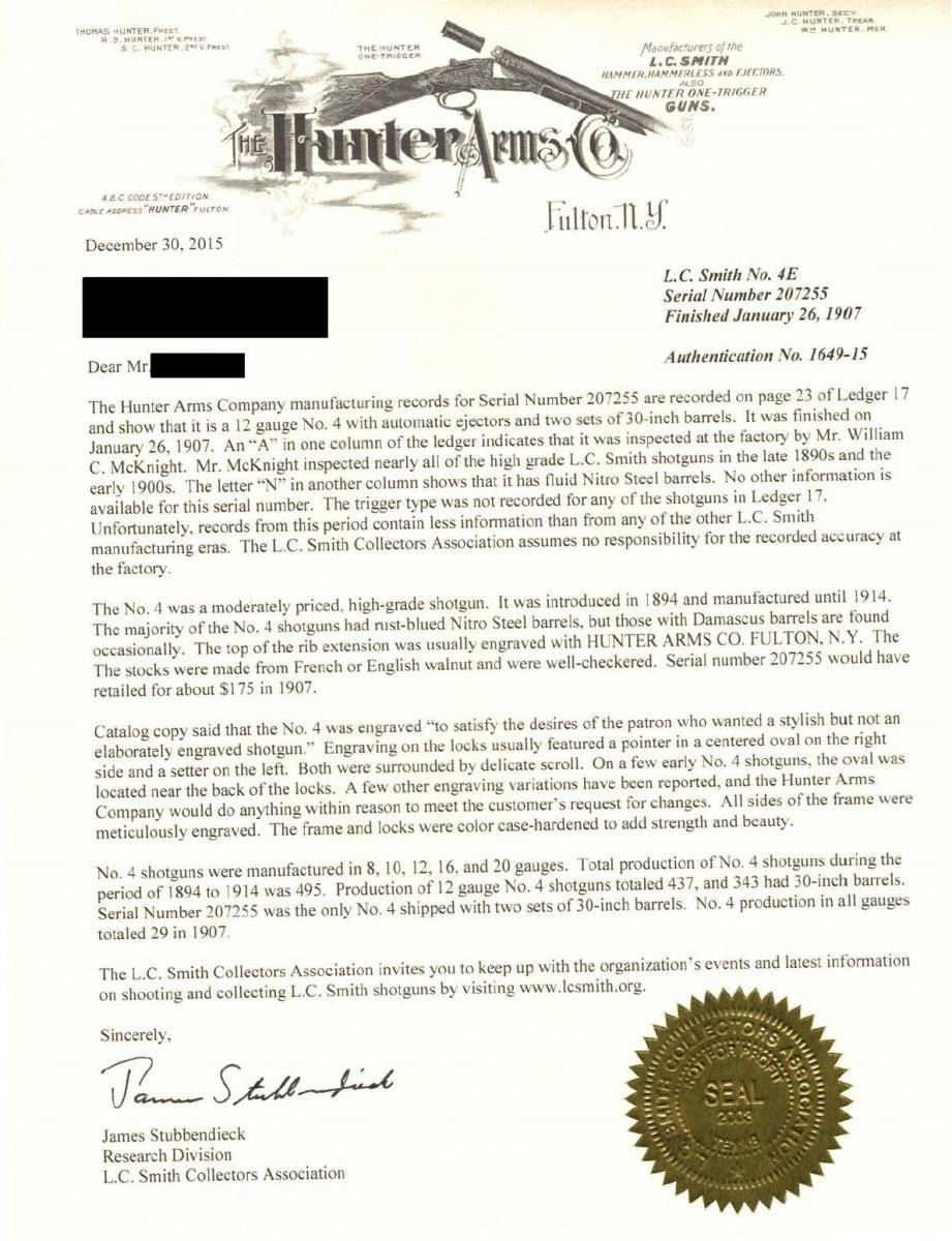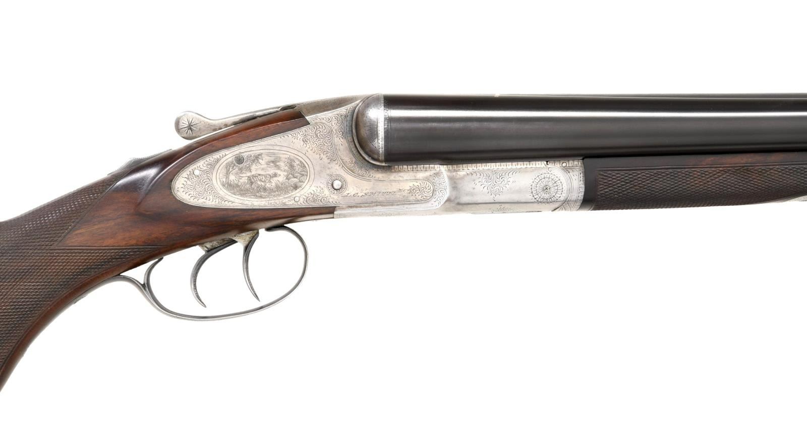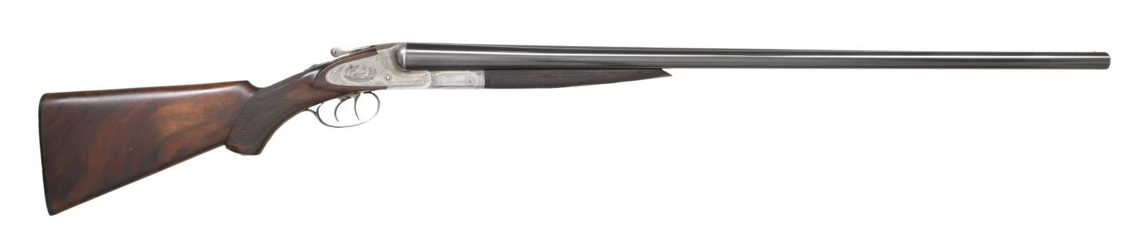 Cal.12 ga. 2 3/4" S#. 207255. Two barrel set, both barrels are 30" of Nitro Steel. This is the only Grade 4 shipped with 2 set of 30" barrels listed in the ledgers. Case colored sidelock action with selective ejectors & double triggers. The No. 4 engraving features oval scenes with pointing dogs. The scenes are surrounded by fine arabesque scroll that continues to upper & lower receiver areas as well as the trigger guard. the trigger guard bow is engraved with customer name "J. H. Shirk". The breech end of both bbls. have border line engraving. Rib extensions are marked "Hunter Arms Co., Fulton, NY". Each set of bbls has it individual splinter forend of ebony tipped thin shell walnut. Hard rubber capped pistol grip custom replacement stock of fancy walnut is checkered at the wrist. LOP: 13 1/2" over a proper style buttplate. DAC: 1 7/8". DAH: 2 5/8". Near neutral cast. BBL1: Bore diameter: RT .725, LT 727. Choke constriction: RT .034, LT .034. Minimum bore dia: RT .025, LT .030. BBL 2: Bore diameter: RT .729, LT .729. Choke constriction: RT .004, LT .020. Minimum bore dia: RT .026, LT .028. Weight: 7 lbs, 12.6 oz. UNATTACHED ACCESORIES: L.C. Smith Collectors Association letter providing general information & listing specifications for this gun as recorded on page 23 of Ledger 17. Completion date, January 26, 1907. Further stating "Serial Number 207255 was the only No. 4 shipped with two sets of 30" barrels." Total production of No. 4 shotguns from 1894-1915 was 495. No. 4 production in all gauges totaled 29 in 1907. Gun is housed in a leather covered case with green velour 2 bbl. fitted interior. Case lid exterior is marked with initials "H. S. M." Lid interior has an added L. C. Smith paper label. Case key is included. Case shows normal age related wear. CONDITION: Action retains 30% light case colors fading to a silvery gray. Both bbls. have over 95% blue. Both forearms are refinished with freshened checkering. Stock shows light wear & handling marks with hairline cracks behind both locks. All bore are very good & bright. (23-1616/DS) CURIO. $7000-10,000.