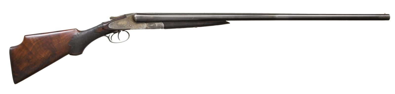 ENGRAVING. Cal. 12 Ga. 2 3/4". S# 6292. It is estimated that at least 210 A2 grade L. C. Smiths were made between 1892 & 1913. In Houchin's "L.C. Smith The Legend Lives", chapter 10's list of all 210 A2's found in the records does not list this gun, but does list gun number 6293 as a 12 Ga. w/ 28" bbls. shipped August 13, 1901. Factory records indicate that this gun is a Monogram Grade. This gun has 30" bbls. fitted w/ slightly raised matted rib holding white midbead & white & brass front. Scroll engraving within geometric borders is at rear of rib behind gold line. Tops of bbls. are engraved "Sir Joseph Whitworth Fluid Compressed Steel" "Made To Order By The Hunter Arms Co., Fulton N.Y." There are bands of geometric engraving around muzzles & breech ends which are also engraved w/ 2" triangles of scroll. There are 1 1/2" triangles at muzzles. Engine turned bbl. flats are engraved w/ serial number. Bottoms of bbls. have Whitworth "sheaf of wheat" trademarks. Case hardened regular frame sidelock action w/ usual rotary bolt has S# engraved on water table which is also stamped w/ patent dates. Action features early style bushed strikers, automatic safety ("SAFE" inlaid in gold) & dbl. triggers. Action has nicely filed fences & is engraved w/ about 70% coverage sm. scroll w/ geometric borders & highlights outlining oval vignettes of dogs on sides; setter on left & pointer on right. Top of action is finely engraved w/ shaded oak leaves. Fences are engraved in shell pattern. Bottom of action & trigger plate depict rose bouquets. Top bouquet has hanging shrouds of oak leaves. Lockplates are near fully engraved w/ scroll matching that found on action w/ geometric borders which surrounds finely detailed hunting scenes w/ a pair of pointers, one pointing an unseen bird behind rock wall & fence posts. The other dog is honoring. Right side shows a pair of setters intent on unseen quarry on rocky hillside under spruce tree. "L.C. SMITH" is engraved at the front portion of each lockplate behind sm. renderings of game birds, quail on left & pigeon on right. Trigger guard bow is engraved w/ a pair of woodcock. S# is on tang. Pistol grip Monte Carlo buttstock of well veined & flame figured European walnut measures 14 1/8" over ribbed hard rubber buttplate over 1/4" spacer. Grip checkering is of standard A2 style w/ fleur-di-lis intrusions behind lockplates & crenelated borders toward comb. Matching splinter ejector forend w/ inlet ebony tip is near fully checkered & has fleur-di-lis ribbons through pattern. Iron is scroll & line border engraved. Serial number is at center & forend has usual J-spring release with secondary knurled roll in rnd. engraved steel escutcheon. MEASUREMENTS: BBLS: Bore Diameter: R .727", L .727". Restriction: R .024" (MOD), L .038" (FULL). Min. Wall Thickness: R .040", L .039". STOCK: DAH: 4". DA rear of Monte Carlo: 2 1/2". DAC: 1 3/4". LOP: 14 1/8". CAST: neutral. WEIGHT: 7 lb. 15 oz. CONDITION: very good to fine. Bbls. retaining approx. 80% original blue w/ some light freckling, marks & scratches. Action & lockplates retain a considerable amount, perhaps as much as 40% of their muted light brown case hardening color. All engraving remains sharp & clear. Stocks retain most of an old oil finish with open grain and scattered marks. There are some noted repairs of chipping behind lockplates. Checkering shows considerable oil infill of very closely spaced diamonds with some rerunning over an area with almost invisible repair. Checkering on forend is considerably worn & shows one fairly deep dent at center of rear panel. Bores are bright & shiny without any noted problems except for 2-3 light striations in right bbl. & a sm. dent 11" back from muzzle in left. Action is tight. Ejectors are in time. Forend iron also has a slight bend at rear and wood shows some repairs. (23-1428/MGM). CURIO. $6,500-9,500.