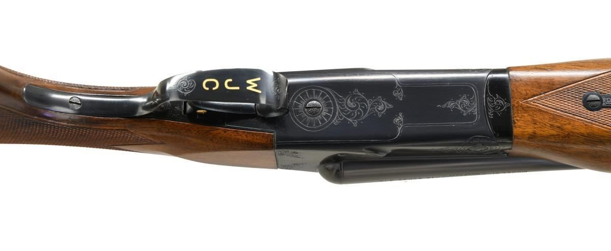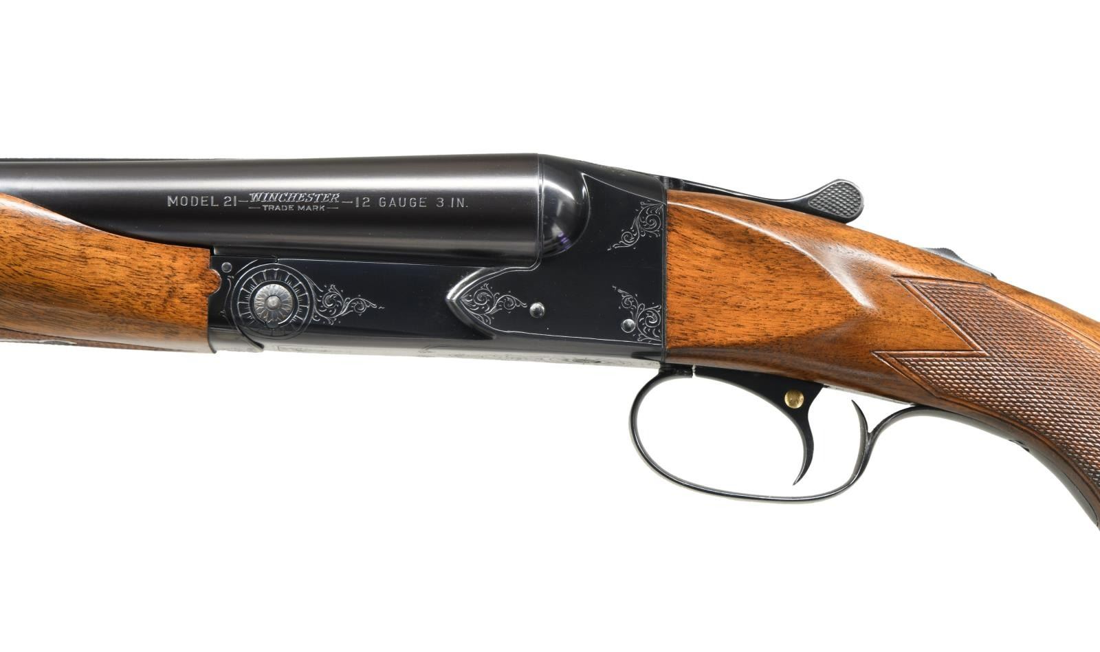 SHOTGUN. Cal. 12 Ga., 2 3/4". S# 30255. Bbls. 30" of Winchester proof steel with fixed Full & Full chokes. Steel Front bead. Blued boxlock action style 21-1 hand engraving Trigger guard bow has gold inlaid initials "WJC". Single selective trigger and Selective ejectors. Beavertail forend and uncapped pistol grip stock of nicely grained black walnut have point pattern hand checkering. Lug area of bbls. as well as water table, breach face of action & ejector hammers have a machine jeweled finish. LOP 13 5/8" over original solid red Winchester pad. DAC: 1 1/2". DAH: 2 3/8". Neutral cast Weight 7 lbs. 13 oz. UNATTACHED ACCESSORIES: letter from the Cody Firearms Records Office detailing the following information, "Duck Gun. 12 gauge. Barrel Length: 30 inches. Right Barrel: Full, Left Barrel: Full. Chamber: 3 inches. Automatic safety. Single trigger. Selective ejector. Pistol grip stock. Winchester recoil pad. Custom Duck finish. Engraved: #1. Gold inlay "W J C" in vertical position on trigger guard. Made for: 353-055-8959. Order number: 34-022-202-061A. Inspection started: July 07, 1954. Inspection finished: July 19, 1954". CONDITION: outstanding original gun retaining nearly all finish. Right side of stock along toeline has a small dent. Bright near excellent bores. PROVENANCE: Felix Bedlan collection. (23-4684/DS). CURIO: $9,000-12,500.