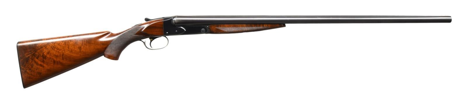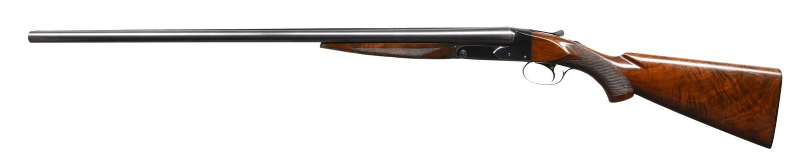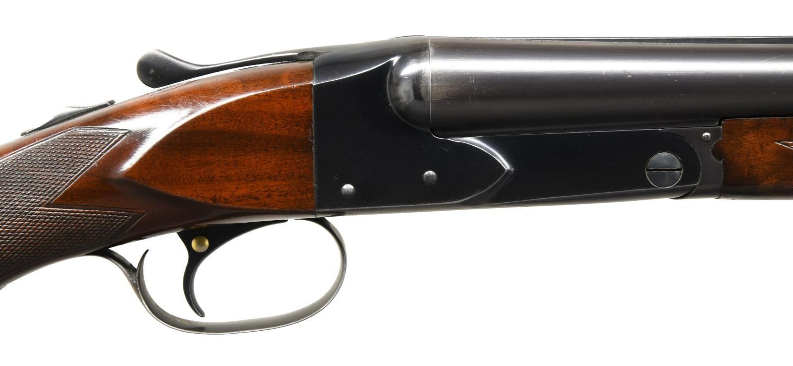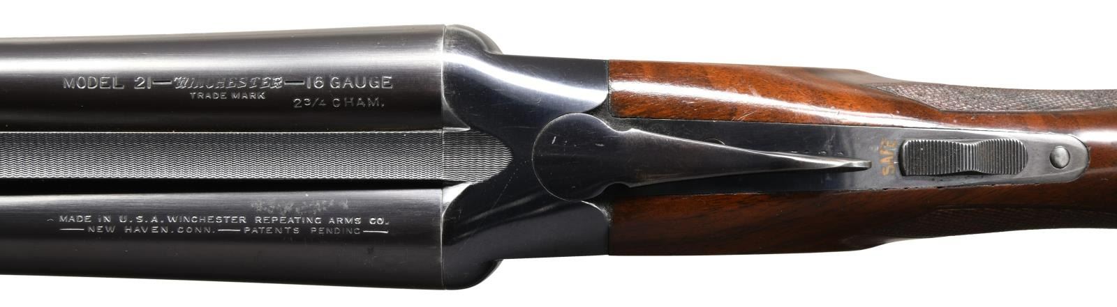 Cal. 16 ga. 2 3/4". S# 15126. Bbls. 28" of Winchester Proof Steel. Fixed Mod Full chokes. Blued boxlock action. Single selective trigger. Selective ejectors. Splinter forearm & uncapped pistol grip stock of fancy walnut w/ point pattern checkering. LOP: 14" over original buttplate. DAC: 1 1/2". DAH: 2 1/2". Neutral cast. Bore diameter: R, .672, L, .669. Choke constriction: R, .010, L, .024. Minimum wall thickness: R, .035, L, .038. WEIGHT: 6 lbs, 14.2 ozs. UNATTACHED ACCESSORIES: Cody Firearms Museum Records Check confirming "Symbol: G21 B / Order No: 06/19/1941 / FOR: Stock / Finish: Regular / Grade of Wood: Regular / Pitch: Reg. / Pull: 14" / Drop: @ Heel: Reg. @ Comb: Reg. / Finish Date: 6/25/1941". CONDITION: bbl. & action retain over 90% blue showing edge wear & small marks. Original wood finish shows scattered scratches & marks. Bores are generally bright, left bbl. has some plastic fouling at muzzle. (23-4804/DS). CURIO. $4000-5500.