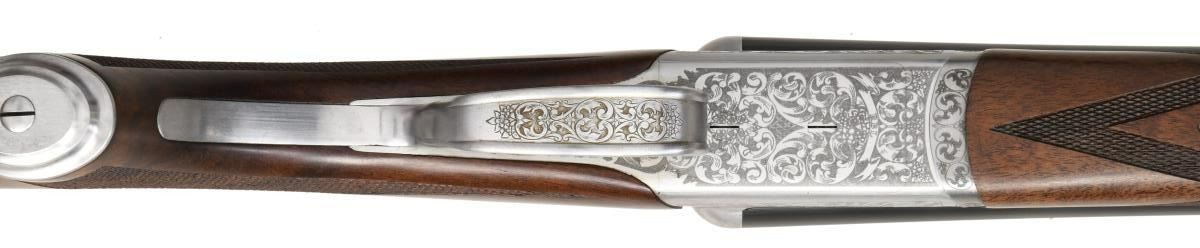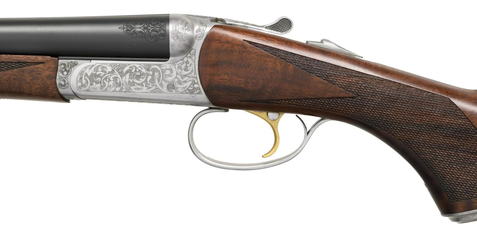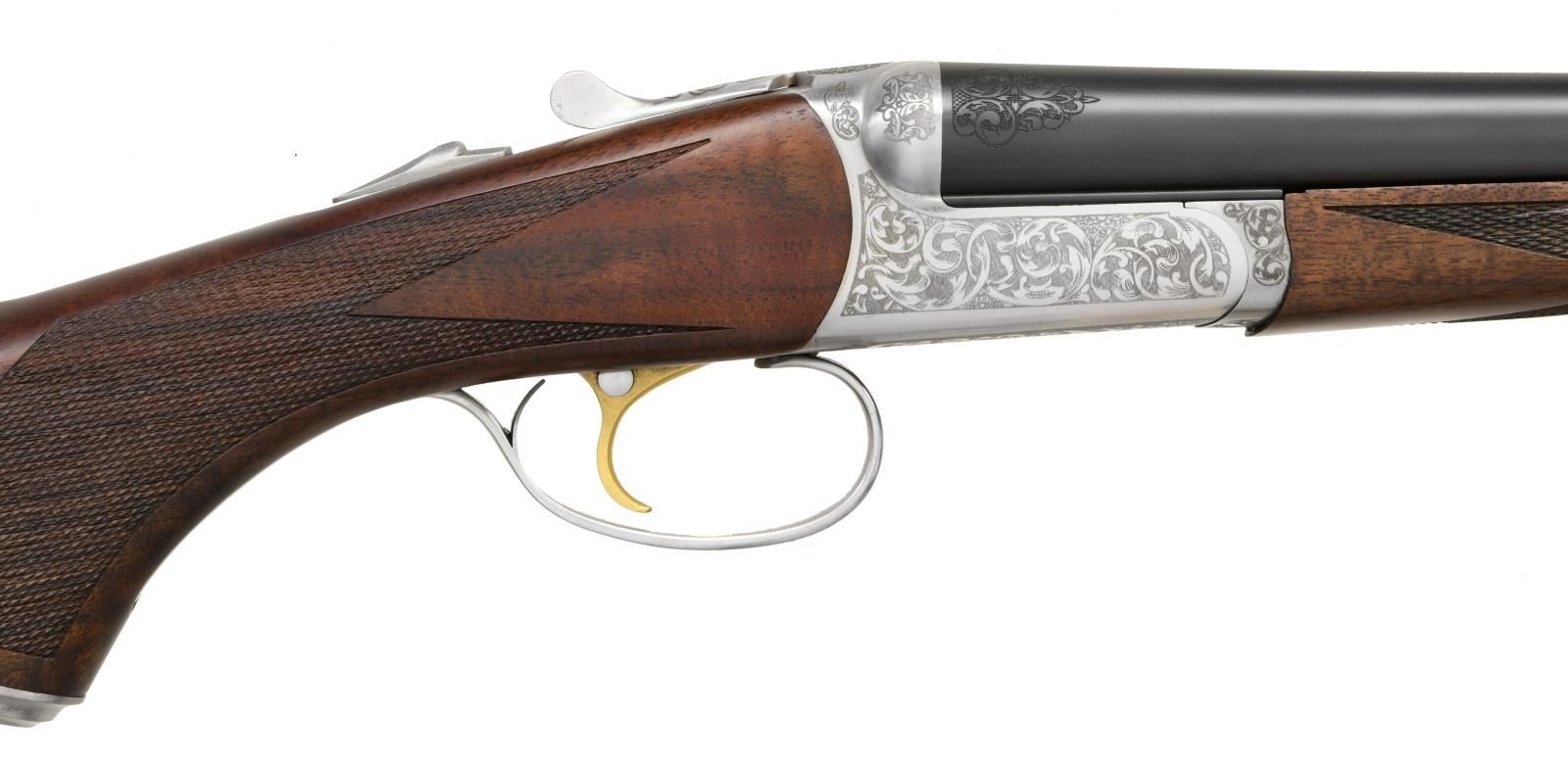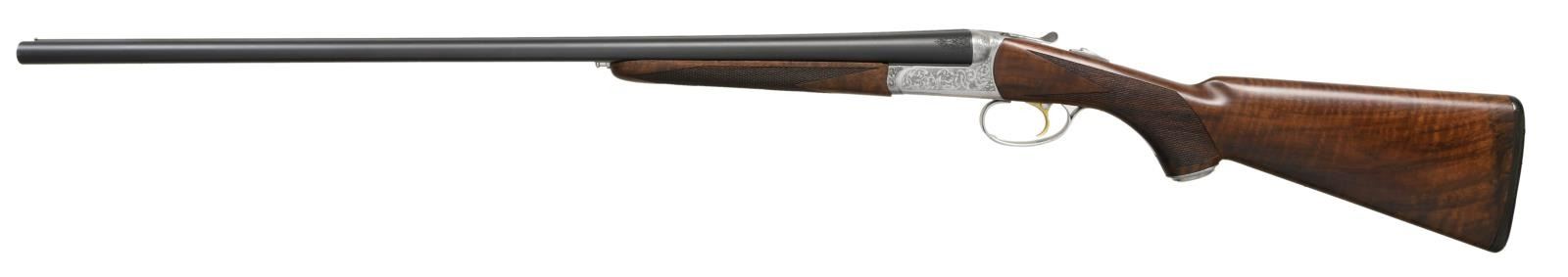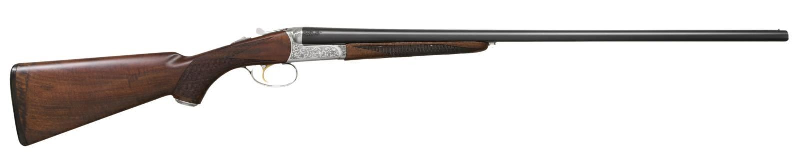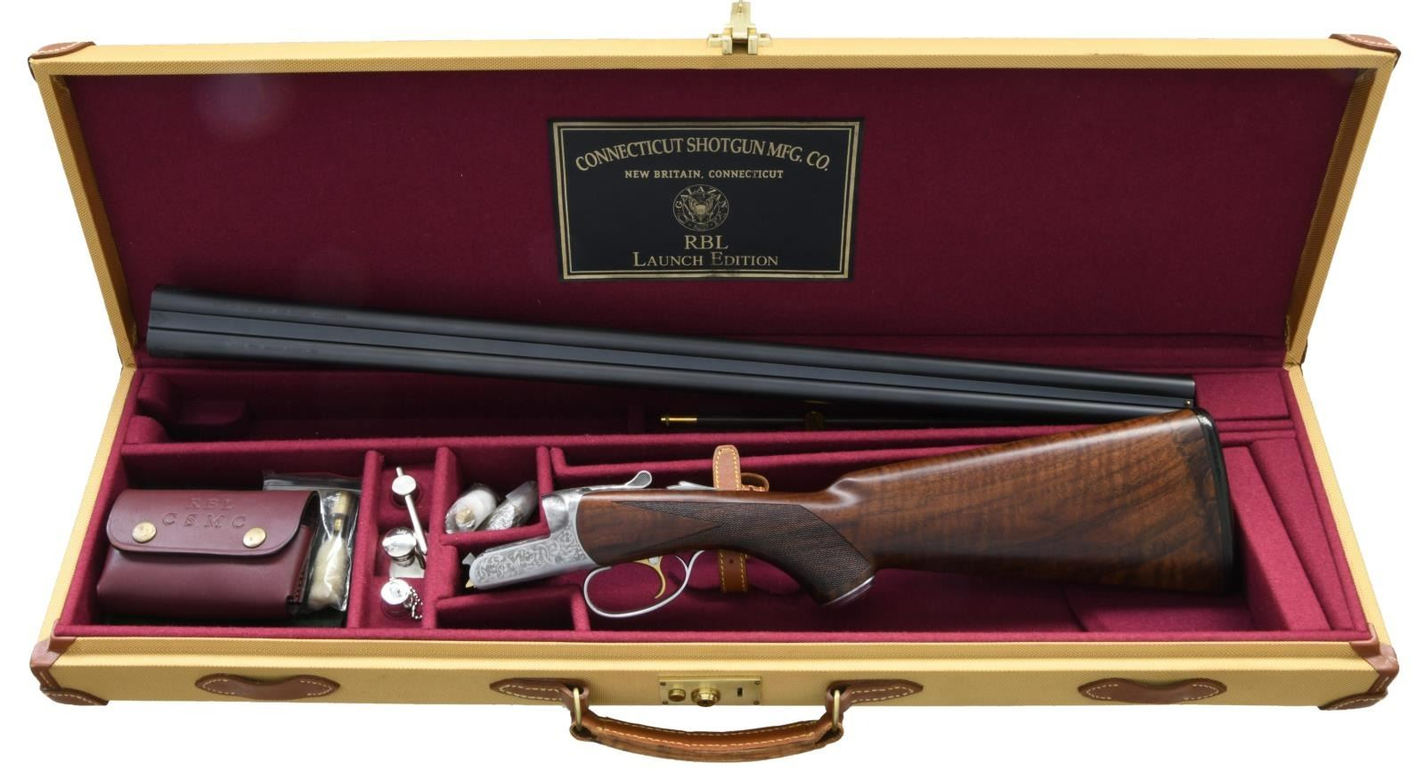 LAUNCH EDITION SXS SHOTGUN. Cal. 20 Ga., 2 3/4". S# RBL002530. The 28" rust blue bbls. w/ swamped game rib has a brass front bead. Included is a set of 5 CSMC RBL interchangeable choke tubes. French grey boxlock action w/ gold plated SST, ejectors & automatic safety. Receiver has generous coverage of laser scroll engraving. Dbl. beaded triggerguard bow w/ long tang. Beavertail walnut forearm w/ Anson release & wrap around point pattern laser cut checkering. Pistol walnut stock w/ laser cut checkering at wrist & gray steel pistol cap. LOP: 14 7/8" to black pad. DAC: 1 3/8". DAH: 2 1/32". CAST: neutral. WEIGHT: 6.37 lbs. UNATTACHED ACCESSORIES: gold cloth case w/ leather trim & burgundy cloth partitioned interior. Lid has CSMC RBL Launch Edition label. Case contains 2 chamber mops, case for ear plugs, oil bottle, 2 piece cleaning rod, choke wrench, choke tube pouch containing spare chokes. Also comes w/ shipping box. CONDITION: near excellent blue & grey metal finish. Near excellent wood finish. Bright shiny bores w/ light use. Case has very good appearance w/ light staining on lid. (23-4937/MD). MODERN. $2,750-3,750.