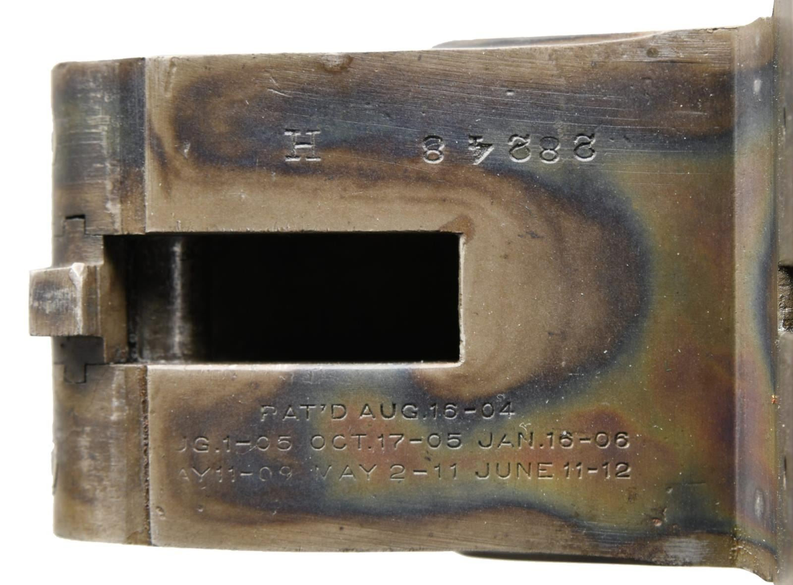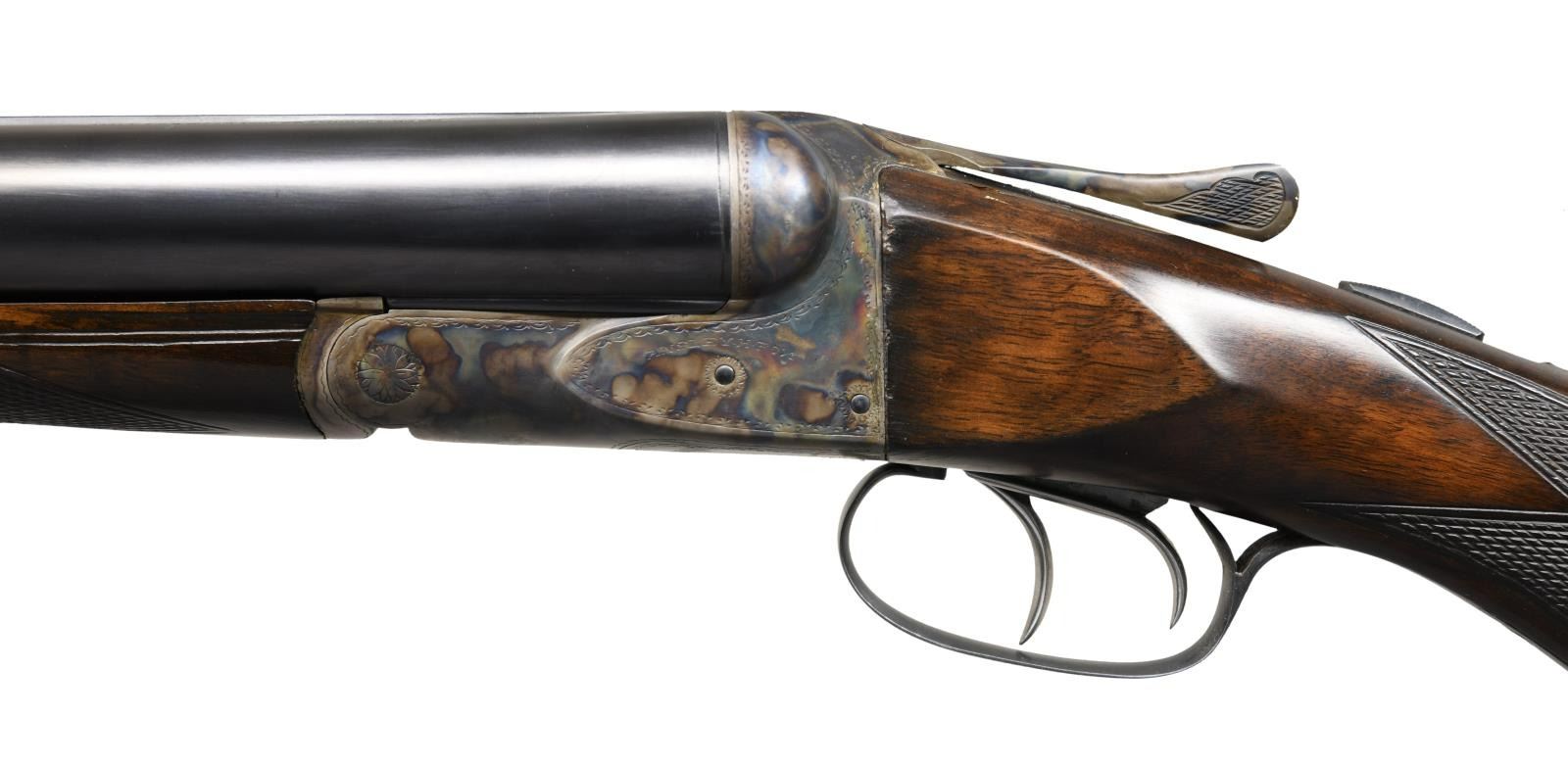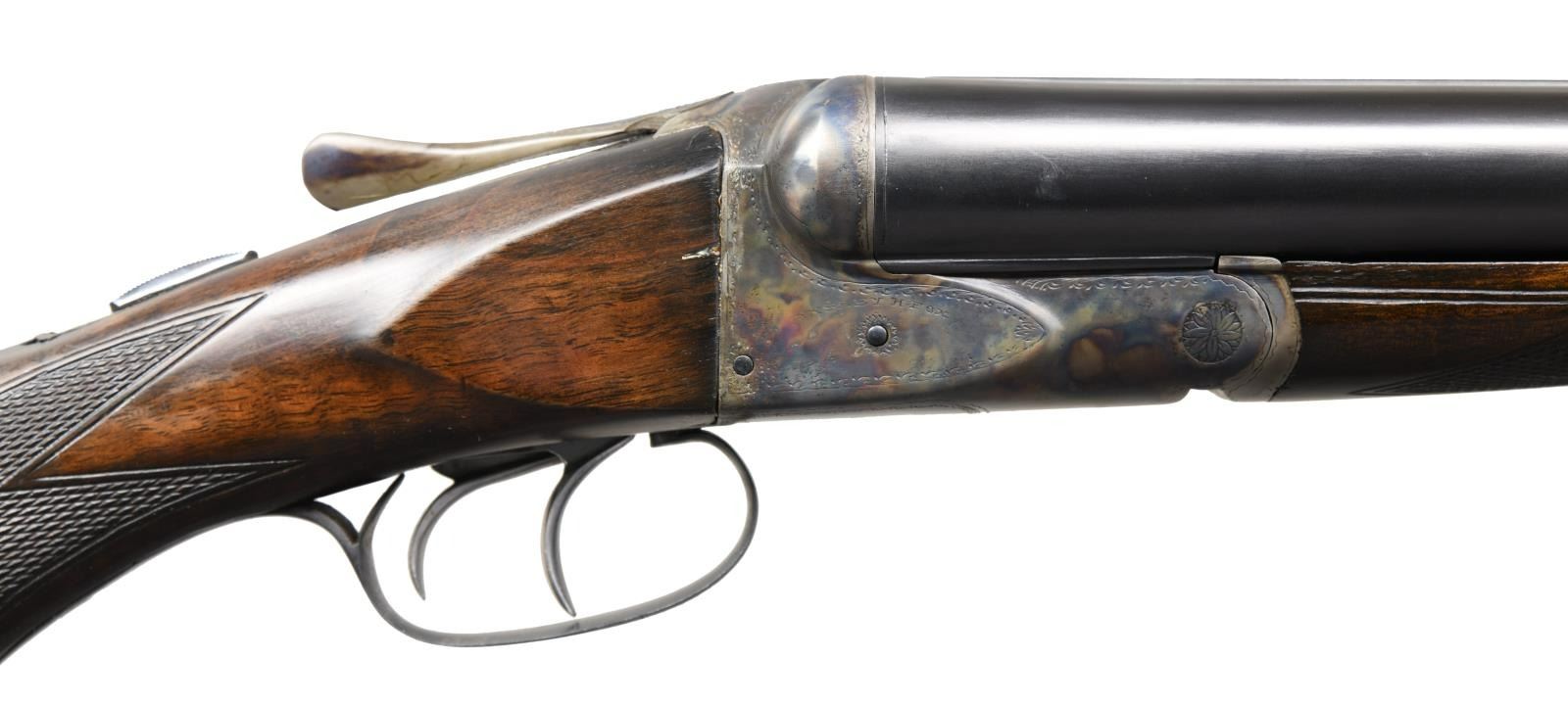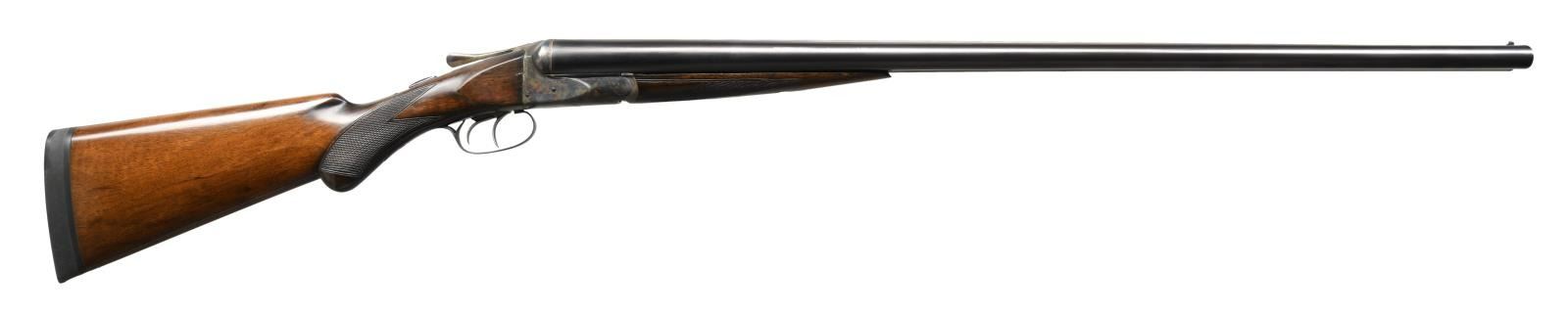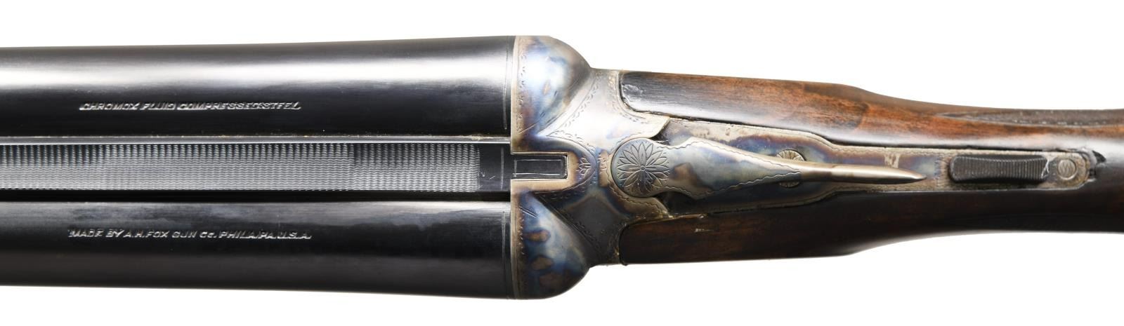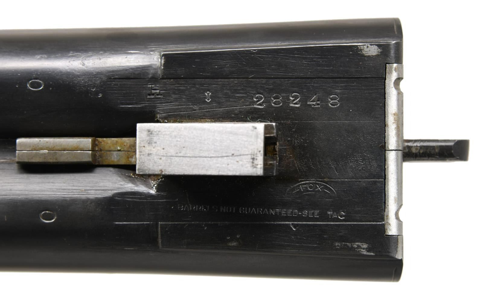 CHOKES. Cal. 12 Ga. 3". S# 28248. The 32" Chromox fluid steel barrels have steel information and Fox's Philadelphia address marked on tops. Narrow matted rib is fitted with white front bead. Barrel flats are stamped with grade, S#, Fox proof and "BARRELS NOT GUARANTEED-SEE TAG"; as was usual for these special long range guns. Robust Fox rotary bolt action with correct markings on watertable features automatic safety and double triggers. Action is engraved with line and scroll borders in usual "H" grade style. "ANSLEY H. FOX" is on each side. S# is on trigger guard tang. Round knob pistol grip buttstock of lightly fiddle figured American walnut measures 15" over Decelerator black sporting clays pad. Standard point pattern checkering is at grip. Matching splinter ejector forend with patent dates on iron has Deeley type release. MEASUREMENTS: BBLS: Bore Diameter: L .744. R .746. Restriction: L screw chokes. R screw chokes. Wall thickness: L .043. R .040. STOCK: DAH: 2-7/8". DAC: 1-5/8+". CAST: neutral. LOP: 15". WEIGHT: 9 lb. 3 oz. UNATTACHED ACCESSORIES: plastic case containing Briley thin wall choke tubes for IC, Mod & IMod with wrench, (2 in gun for skeet & light mod for a total of 5). CONDITION: fine as refinished. Barrels retaining nearly all of a good quality re-black with a few marks. Action recolored and retaining nearly all of these colors. Wood also refinished with some scattered marks, checkering re-cut. Bore are bright and shiny, action is tight, ejectors in time. There are some small chips and gaps in wood at juncture of action and buttstock which show repairs. (23-1268/MGM). C&R. $2,500-4,000.