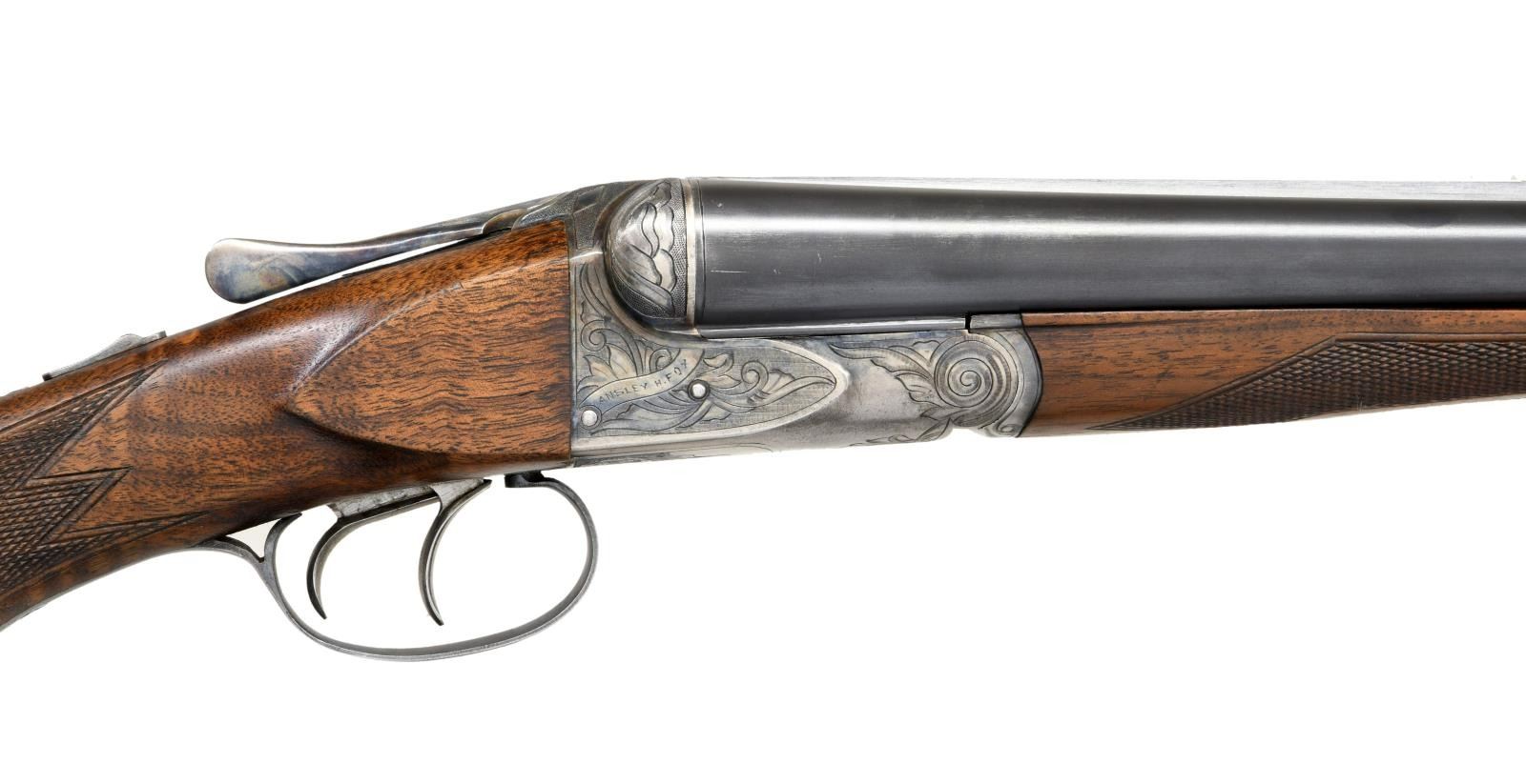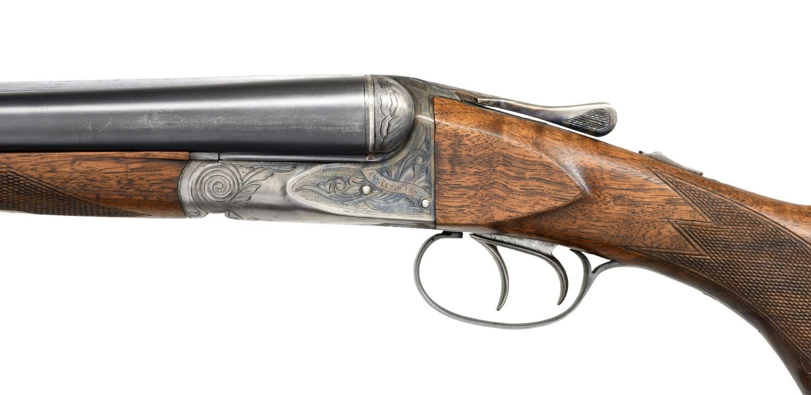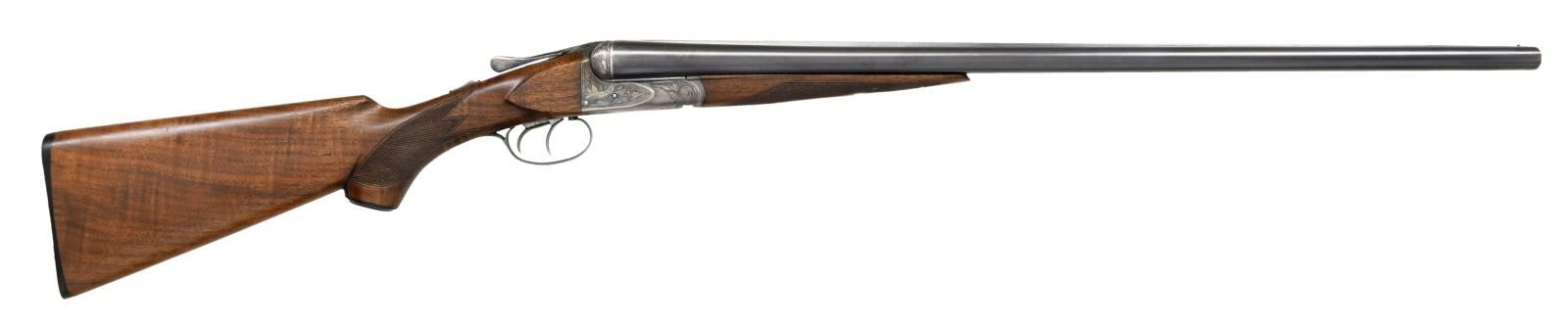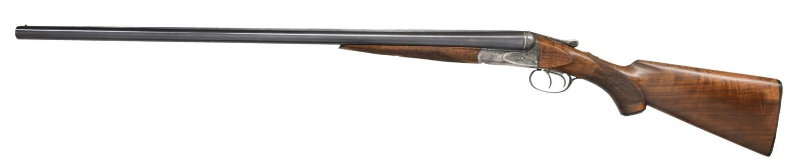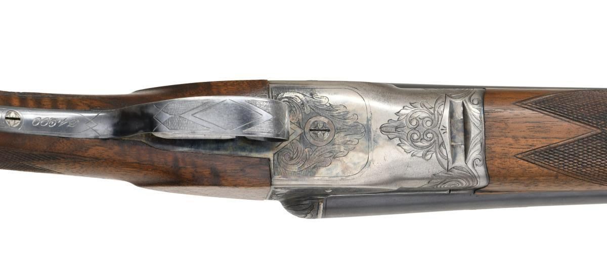Cal. 12 ga 2 3/4". S#: 34299. BBLS. No. 3 weight of Special Alloy Forged Steel shortened to 28 25/16", Steel front bead. Case colored boxlock action has deep style scroll engraving. Selective ejectors and double trigger. Splinter forend and hard rubber capped pistol grip stock of fancy walnut have hand checkering. LOP: 14 1/4" over original buttplate. DAC. 15/8". DAH 2 3/4". Neutral cast. Bore Diameter: RT .731, LT .732. Choke Constriction: RT .034. Lt .033. Weight 7 lbs., 3.4 ozs. CONDITION: Bbls retain over 80% lightly faded blue. Action shows 70% lightly faded colors with silvering in carry areas. Stocks have very good finish & checkering. Tight action. Very good bright bores. (23-1300/DS). CURIO. $1500-2200.