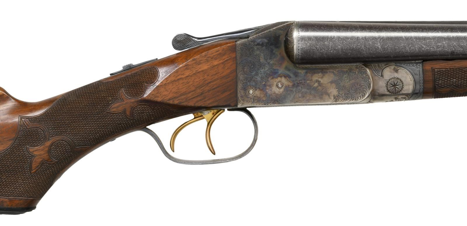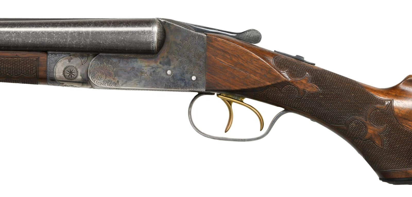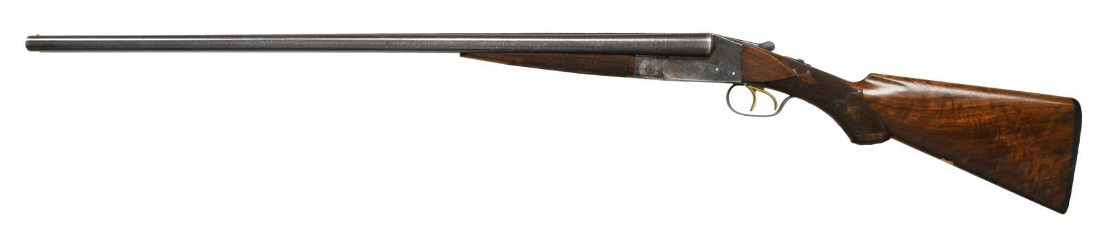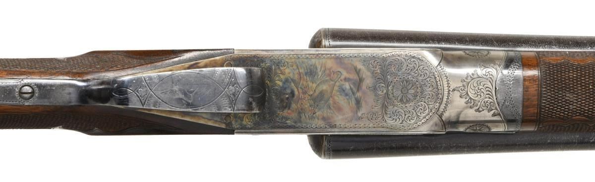 Cal. 16 ga. 2 9/16". S# 201342. Bbls. 30" of fine Damascus steel. Shotgun is nitro proofed which is rare & desirable. Brass front bead. Case colored boxlock action. Grade 4 engraving featuring game scenes of pointing dogs on sides w/ a quail on floor plate & woodcock on the trigger guard bow. Scenes are surrounded by arabesque scroll & fancy borders. Gold finished double triggers. Plain extractors. Ebony tipped splinter forearm & hard rubber capped pistol grip stock of fancy black walnut. Features include segmented Fluer-de-Lis hand checkering & gold shield in toeline. LOP: 14 7/16" over original buttplate. DAC: 1 7/8. DAH: 2 3/4. Neutral cast. Bore diameter: R, .664, L, .661. Choke constriction: R, .005, L, .019. Minimum wall thickness: R, .037, L, .040. WEIGHT: 6 lbs, 14.4 ozs. Mfg. 1910. CONDITION: very fine. Bbls. retain over 90% gray toned browned finish showing vivid Damascus pattern. Action retains 80% bright case colors showing wear in carry areas. Wood has good original finish & checkering showing scattered scratches & handling marks. Very good bright bores. (23-4808/DS). CURIO. $3000-4500.