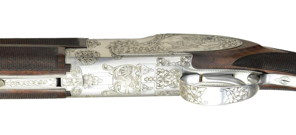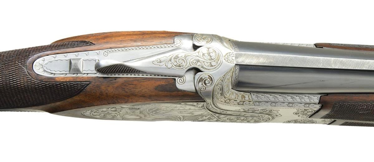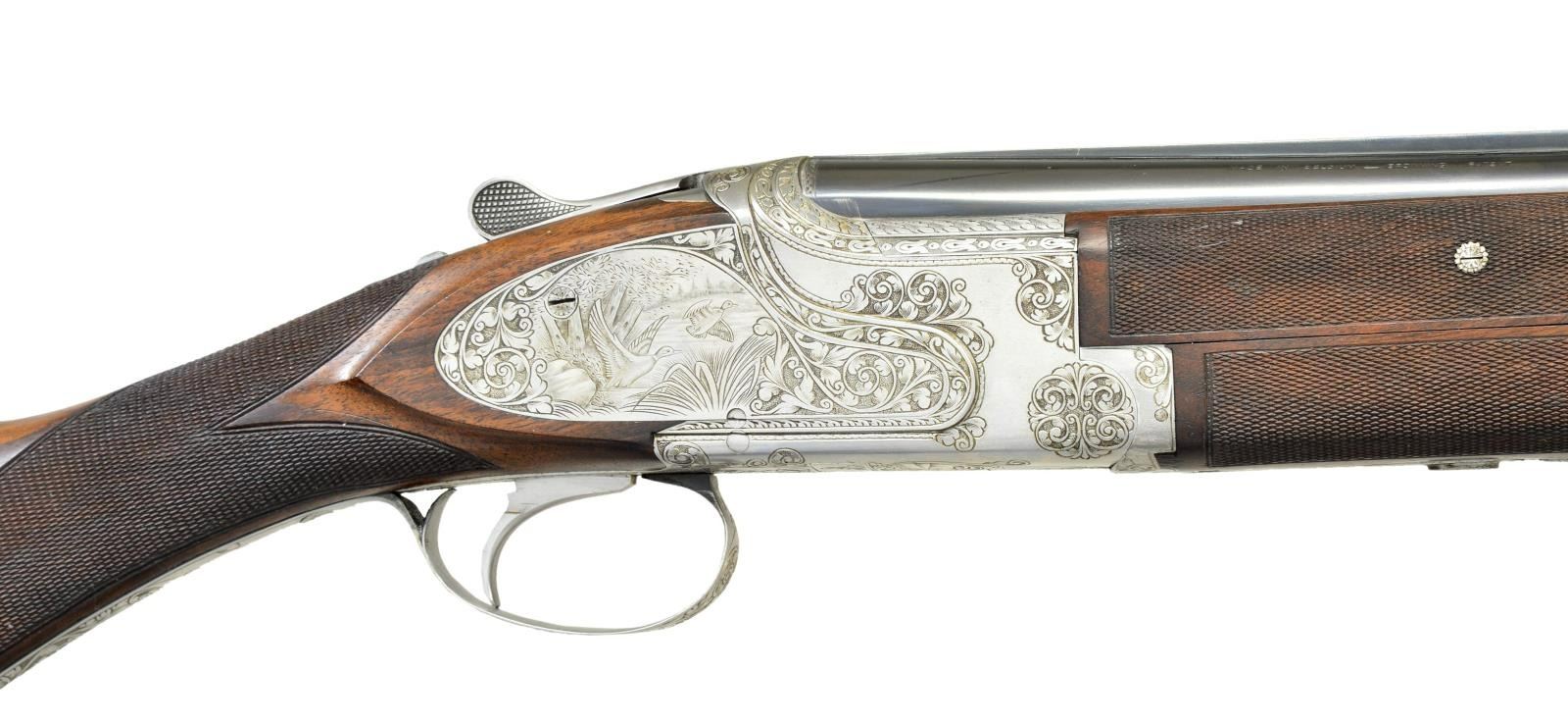 SUPERPOSED SIDE PLATED O/U SHOTGUN. Cal. 12 Ga. S# 78483S7-1. Spectacular 2 bbl. set shotgun with Chambord (F1) Royal style engraving. This is the finest European style engraving pattern offered by FN. Game scenes feature flying mallards on right side plate with flushing pheasants on right side plate and flushing quail on floorplate. Scenes are surrounded by foliate scroll and chain stitched borders that extend to top lever, trigger guard, forearm iron and breech section of bbls. Satin silver finished action features a single selective trigger and selective ejectors. Wood and checkering are the finest that FN offered. Schnable tipped 3 piece forearm and long tang swan neck stock have an oil type finish on dark European walnut having fiddle figure with prominent dark streaking. Elegant hand checkering wraps over the top of the wrist. Forearm has extensive checkering on upper and lower sections. LOP: 14 3/8" to a wood butt with French style skip line hand checkering. DAC: 1 5/8". DAH: 1 7/8". Stock has approx. 3/8" cast off. Both bbls. are 27 5/8" with narrow 5mm hand matted vent ribs. Original choke markings on both bbls. are 2 stars under and 1 over, signifying M & F. (Bbl. No. 1) Small steel front bead. Bore diameter: U .723, O .727". Choke constriction: U .017", O .038". Minimum wall thickness: U .040", O .036". (Bbl. No. 2) Large steel front bead. Bore diameter: U .727", O .728". Choke constriction: U .016", O .021". Minimum wall thickness: U .030", O .028". WEIGHT: 6 lbs, 14 ozs. Mfg. in Belgium for the European market in 1967. UNATTACHED ACCESSORIES: Hartman 2 bbl. set case with white plastic handle insert, fleece lining and original key. Case is in very good condition. CONDITION: near excellent showing little if any use. Bbls. and action retain over 98% original finish. Bbl. set no. 2 shows light slide wear from forearm with small mark on right side of bottom bbl. Stock has excellent wood finish. Checkering on left side of wrist has a few bruised diamonds. Forearm 2 has small handling marks on left side at tip. All bores are bright and near excellent. (23-650/DS). CURIO. $10,000-15,000.