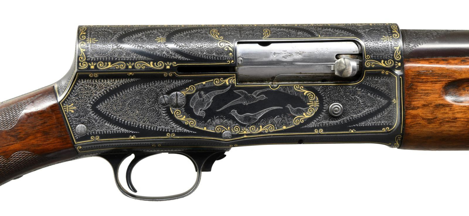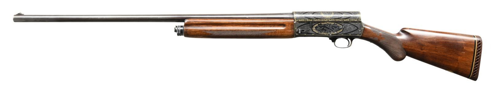 A5 SEMI-AUTOMATIC SHOTGUN. Cal. 12 Ga. 2-3/4". S# 310332 (1950). The 29-1/2" plain barrel choked full, is marked "FABRIQUE NATIONALE D'ARMES DE GUERRE HERSTAL-BELGIQUE" on top rear, in front of 1-1/2" triangle of exceptionally well cut shaded scroll. Blued A5 action is also engraved with near full coverage of this scroll which is outlined by very attractive border of flush gold inlaid individual double ended scrolls, separated by small three rayed sunbursts. This eye catching treatment surrounds ovate game scenes on sides with four mallard ducks flying around a pond on left and four pheasant, one appears to be falling from the sky, on right. Scroll and gold treatment extends to trigger guard bow and tang. This fine work appears to be of factory quality however, a brief search cannot find where this pattern or this grade was offered. Also, no engraver's signature is found so it must be assumed that this is custom work. Round knob buttstock of relatively plain European walnut measures 14-1/2" over brown A&F marked pad. Fancy pattern flat top checkering with fleur-de-lis patterns is at grip and a vacant gold oval is on toeline. Forend wood with finger grooves appears to be of standard grade. MEASUREMENTS: STOCK: DAH: 2-5/8". DAC: 1-5/8". LOP: 14-1/2". WEIGHT: 8 lb. 6 oz. CONDITION: fine as custom finished. Barrel retaining nearly all of an old re-blue. Action retains nearly all of a custom blue most likely applied after engraving was finished. There are a few small scattered patches of rust, mostly on left side above trigger. Stocks retain most of an old oil finish, possibly original, with added oil. Bore is bright and shiny. Mechanically good. (23-2051/MGM). C&R. $3,500-5,500.