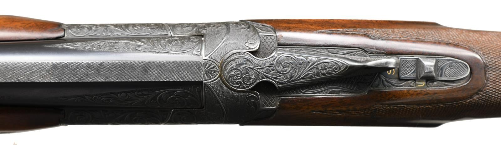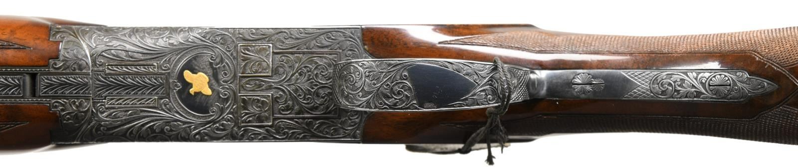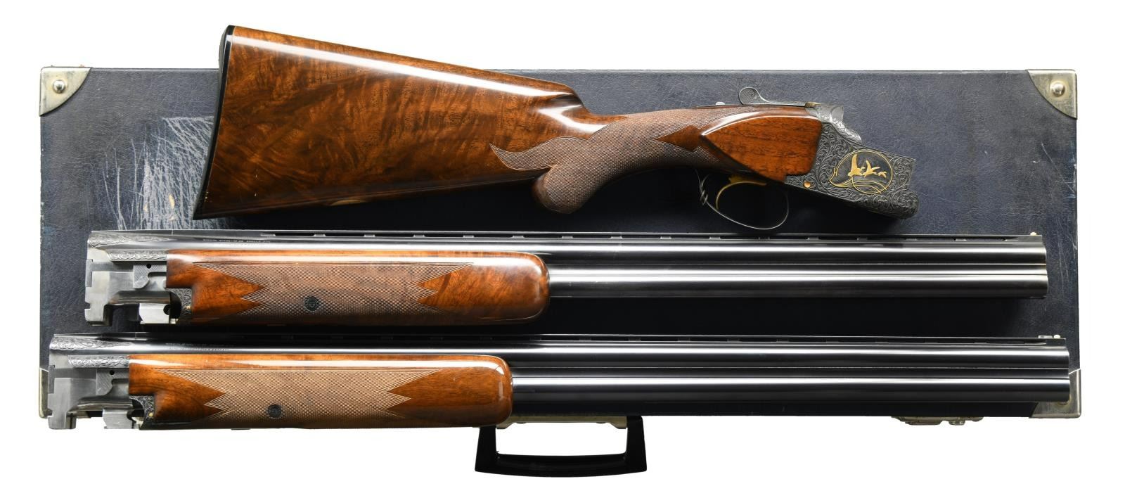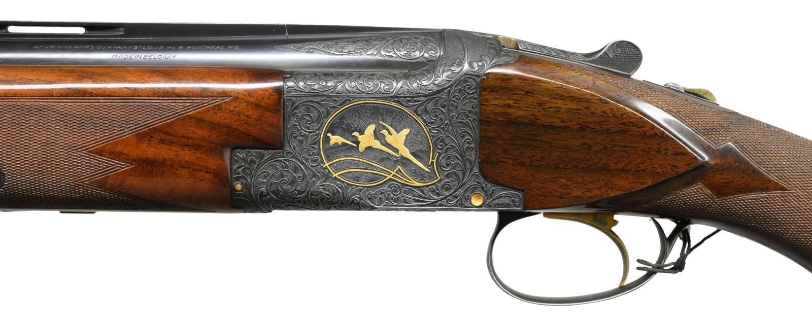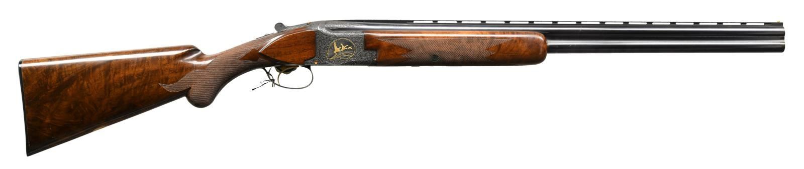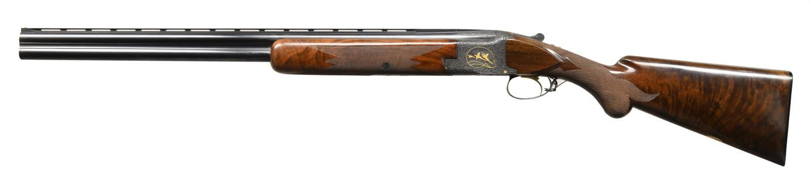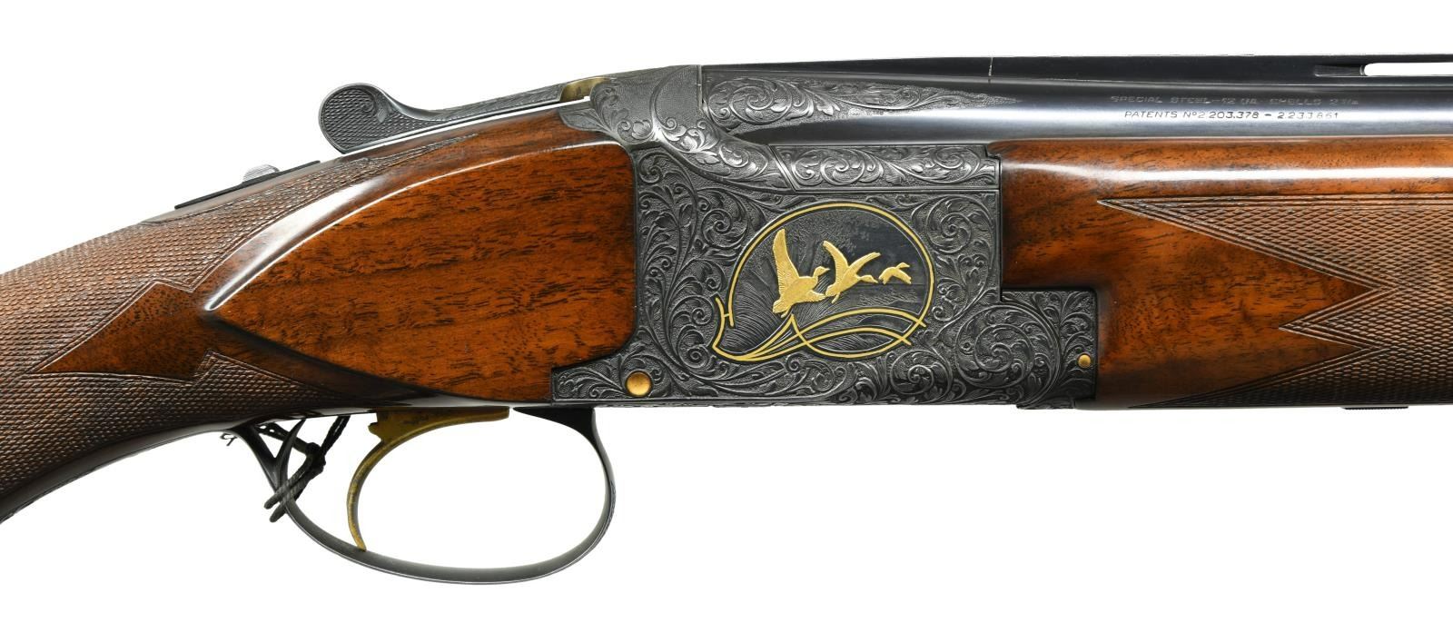 SHOTGUN. Cal. 12 ga. 2 3/4". S#. 47729 S5. The new style Grade VI or Midas Grade engraving was designed by Louis Vranken and first advertised in the 1957 catalog. The game scenes are bordered by gold inlay with 3 gold mallards on the right and 3 gold pheasants on the left side. The floorplate features a single gold quail. The scenes are surrounded by deep relief vine type foliate scroll and finely shaded backgrounds that extend to the top lever, trigger guard, forend irons and breech ends of bbls. The signature of Master Engraver Andre Watrin is located on the lower rear corner of the left side of the receiver. Top tang has gold safety & bbl. selector markings. Gold plated SST. Selective ejectors. Round knob long tang stock of gloss finished exhibition grade walnut . LOP: 14 1/8" over original buttplate. Brass oval presentation plate in toe line is engraved with initials "MAC". Each bbl. set has an individual matching forend with point pattern wrap around checkering. BBL. 1: 28" with fixed Mod & full chokes. BBL. 2: 26 1/2" with fixed IC & Mod chokes. Both bbls have hand matted vent ribs and white front beads. 1965 Belgian mfg. UNATTACHED ACCESORIES: Browning Style "SB" 2 bbl set Superposed luggage case. The Grade "B" case was a best value" case with black leatherette covering. It was discontinued in 1957. Case lid has an area of scrapes on right side. Case interior is loose in some spots. The original gold Superposed hang tag is present. CONDITION: Very good used condition. Over 85% action blue showing carry wear on receiver edges and trigger guard. Trigger has over 50% gold finish. Both bbls retain over 97% blue and have bright near excellent bores. Original wood finish shows a few light scratches & marks. Action is tight & on face. PROVENANCE: From the Estate of Jon Thomas. (23-1636/DS). curio. $6,000-8,000.