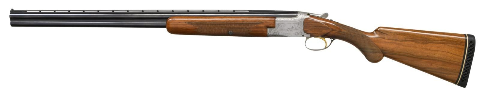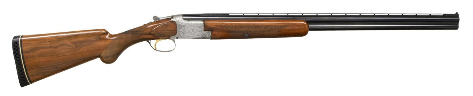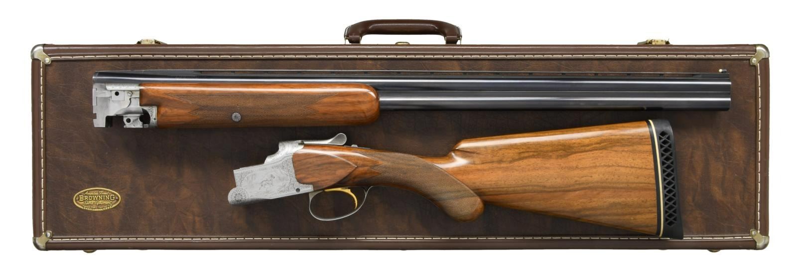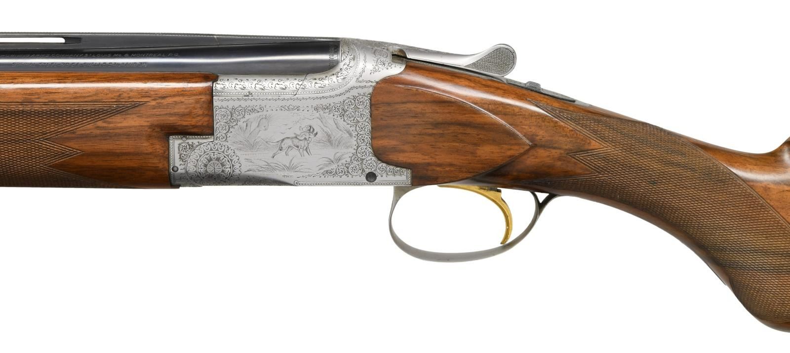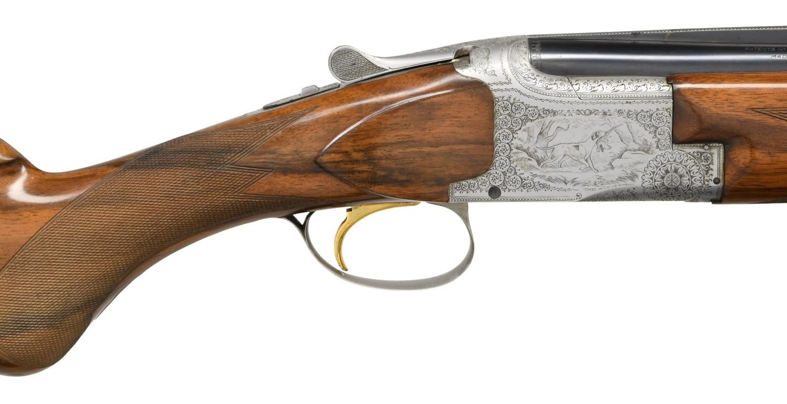 GRADE BROWNING SUPERPOSED FIELD GUN ENGRAVED BY MAGIS WITH CASE. Cal. 20 Ga. 3". S# 18740 (1960). The 26-3/8" barrels fitted with matted ventilated rib are marked for IC and mod chokes. St. Louis and Montreal addresses along with chamber information and patent numbers as well as "MADE IN BELGIUM" are on top barrel. Small size coin finished O/U action with gold plated selective single trigger is engraved in normal pointer style, with well cut scroll surrounding oval scenes of dogs on sides. A setter retrieving a duck is on left side and a pointer retrieving a pheasant on right. Both of these delicately cut scenes are signed "M. MAGIS". A pair of quail are on bottom of action and two pheasant; one taking wing, are on trigger guard bow. Long tang round knob buttstock of nicely streaked light colored European walnut measures 13-1/2" over newer black open sided white line pad. Multi point pattern checkering is at grip. Captive field forend matches well. MEASUREMENTS: BBLS: Bore Diameter: O .621. U .621. Restriction: O .014 (Mod.) U .005 (IC). Wall thickness: O .040. U .039. STOCK: DAH: 2-1/8". DAC: 1-7/16". CAST: neutral. LOP: 13-1/2". WEIGHT: 6 lb. 5 oz. UNATTACHED ACCESSORIES: gun comes in a brown vinyl Browning case lined in dark brown faux fur. CONDITION: very fine. Mostly original, barrels retaining over 80% original blue with scattered light scratches and marks and high edge wear. Action retains nearly all original factory gray finish with some slight evidence of wear and some darkening. Stocks retain nearly all of what appears to be their original finish with a fair scattering of light marks and scratches. Checkering remains light in color. Pad is a later replacement and not well fitted. Bores are bright and shiny, though a bit dirty. Mechanically fine. (23-2134/MGM). C&R. $5,000-8,000.