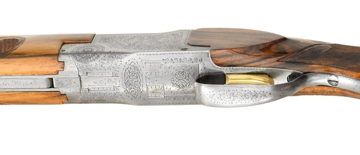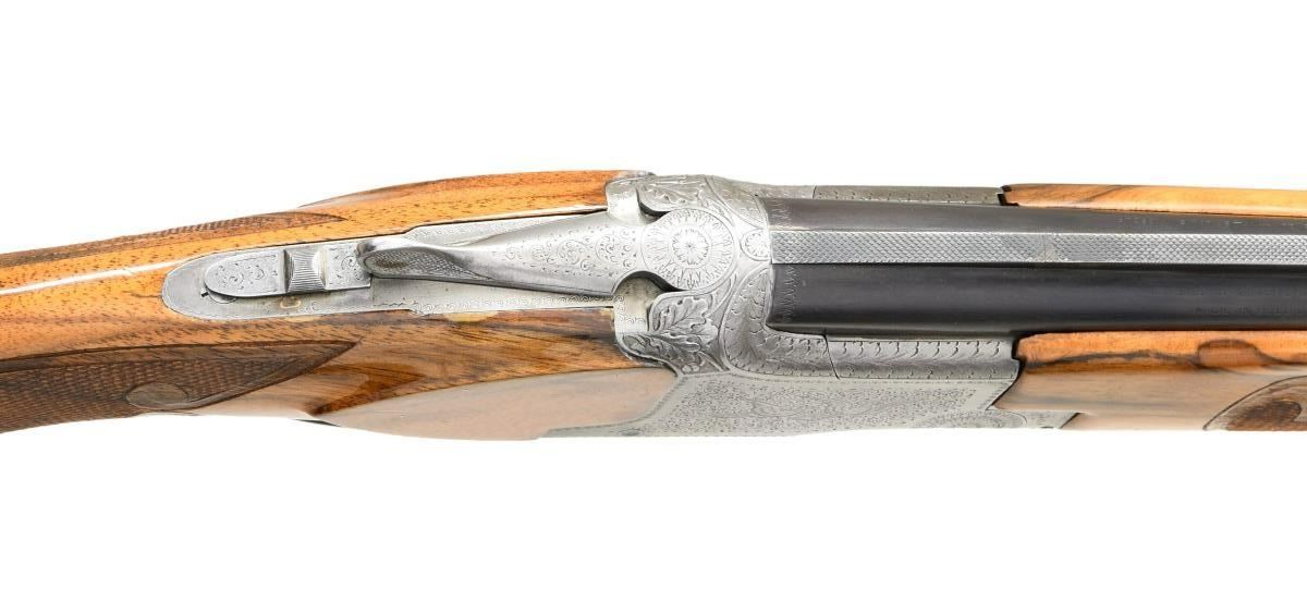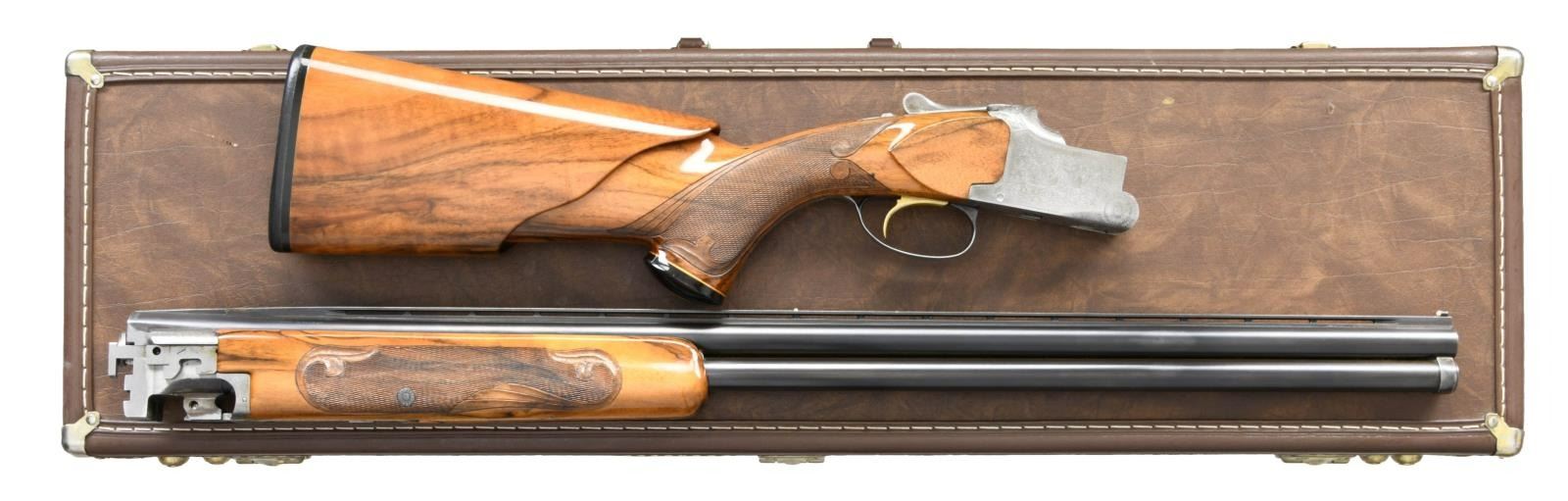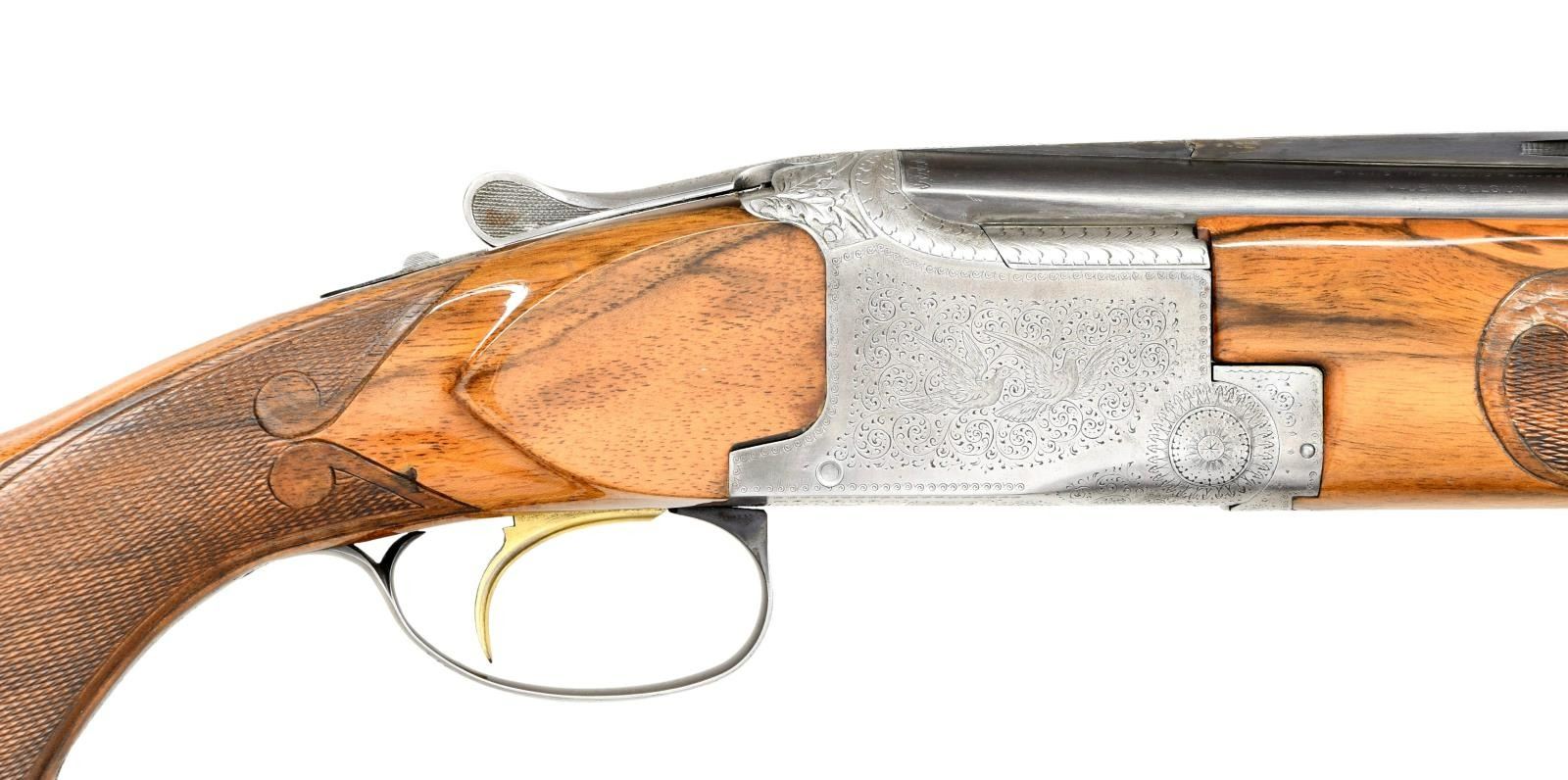 WITH CUSTOM HYDROCOIL STOCK WITH CASE. Cal. 20 Ga. 2-3/4". S# 6606 (1953). The 28" demi-bloc barrels with narrow matted ventilated rib are made without side ribs. Browning St. Louis address is the only one on top barrel along with chamber, patent and Belgium information. Barrels are marked for cylinder and cylinder chokes. Coin finish, small size Browning action with gold plated single selective trigger is engraved in usual pigeon style with pigeons flying through open scroll on sides, rose bouquet on bottom and relief carved oak leaves and acorns on top fence. Custom made Hydrocoil buttstock of very attractively marbled and lightly figured European walnut measures 14-1/4" over black thin pad when in extended position. Stock measures 13" when collapsed. Rosewood grip cap has inlet gold diamond engraved "ROH" and grip checkering has relief carved and scrolled borders. Semi-beavertail captive forend matches well. MEASUREMENTS: BBLS: Bore Diameter: O .620. U .621. Restriction: O .000 (cyl). U .000 (cyl). Wall thickness: O .049. U .048. STOCK: DAH: 1-5/8". DAC: 1-5/8". CAST: neutral. LOP: 14-1/4" when extended. WEIGHT: 7 lb. 6 oz. UNATTACHED ACCESSORIES: gun comes with a brown vinyl Browning case lined in brown fuzzy faux fur. CONDITION: fine as completely refurbished. Barrels retaining nearly all old re-blue over some scratches and marks. Choke markings re-stamped. Action remains silver gray as refinished. Engraving somewhat softened. Newer custom stocks retain nearly all of their shiny finish. Checkering lightly worn. Hydrocoil mechanism not working requires air at a minimum. Bores are bright and shiny. Action is slightly loose. Barrels slightly off face. Mechanically good. Case is good. (23-2138/MGM). C&R. $3,000-5,000.