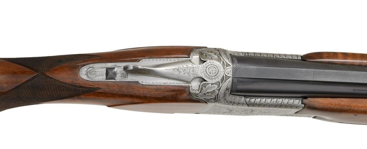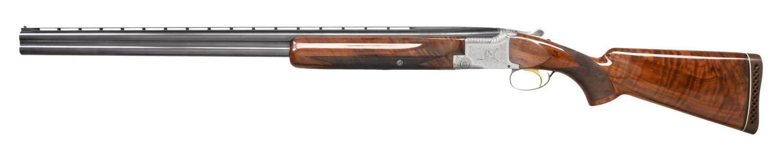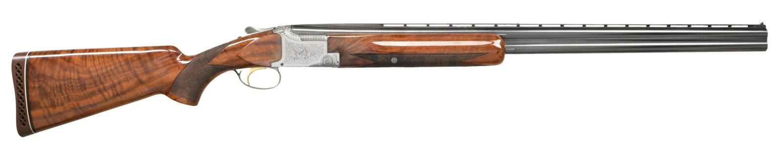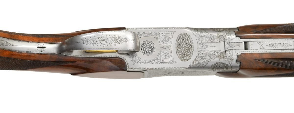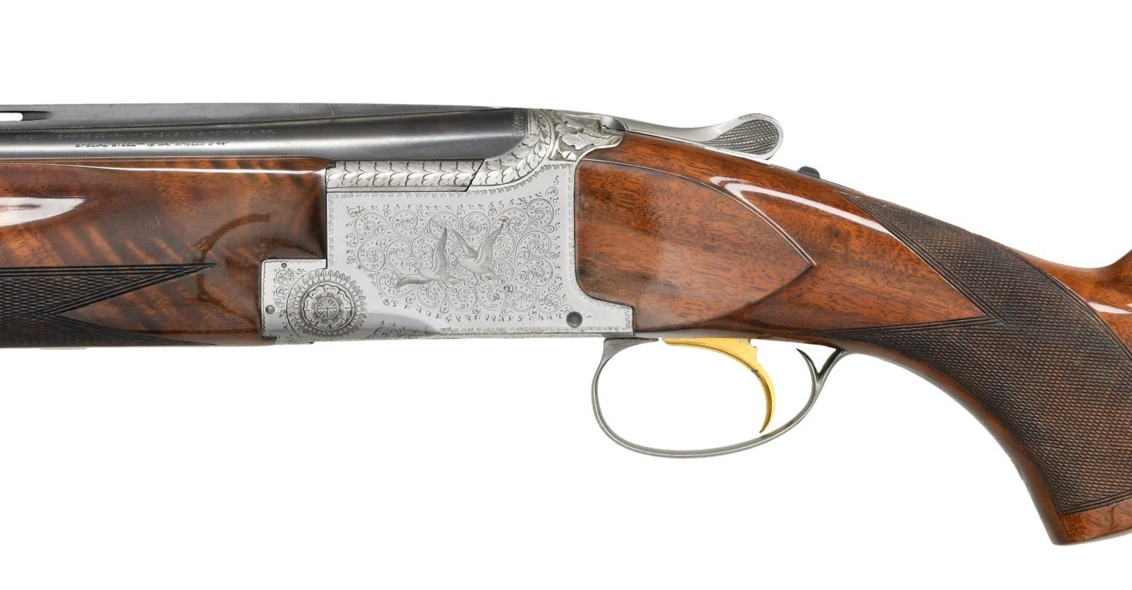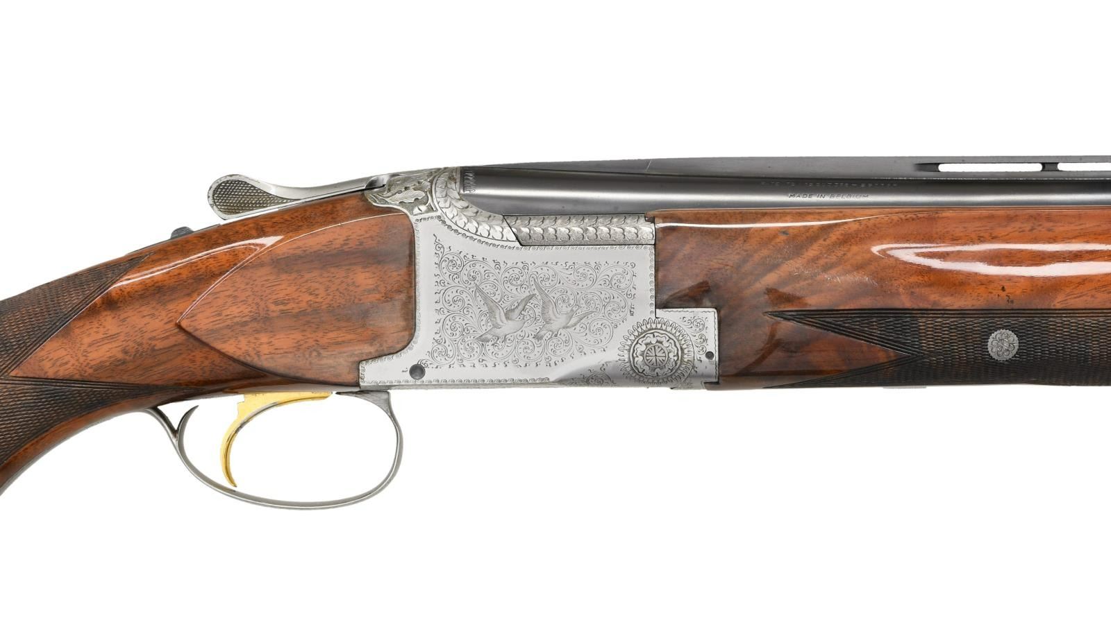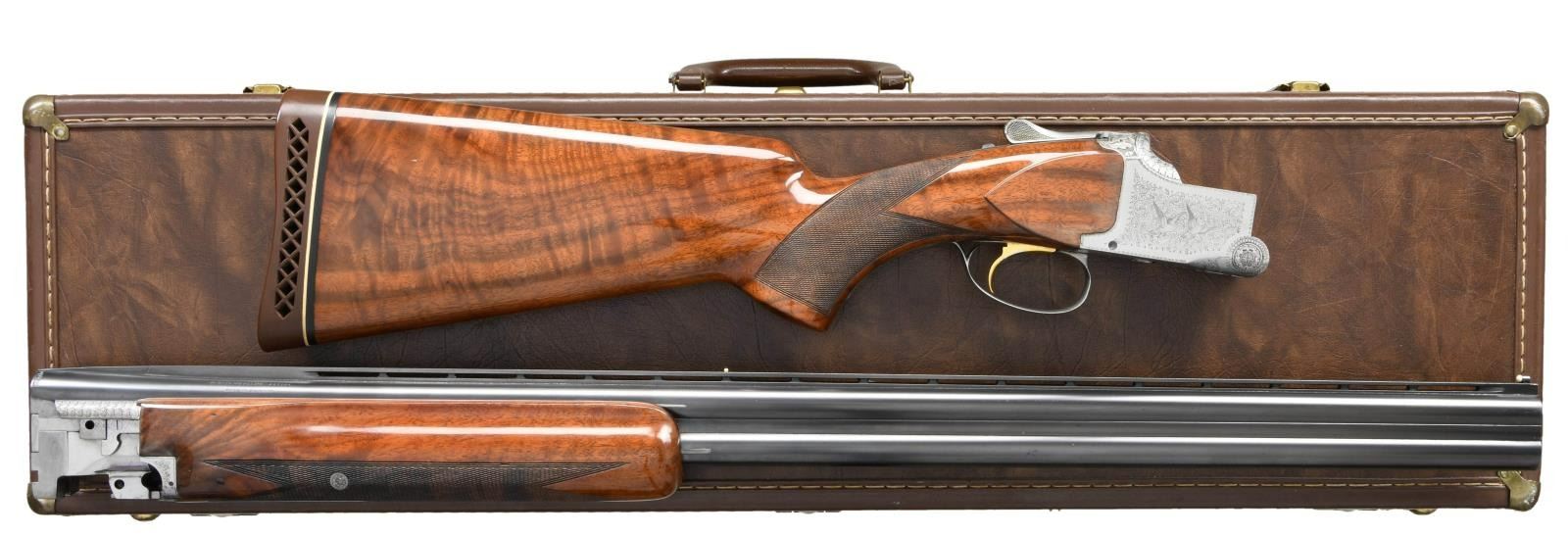 SUPERPOSED GAME GUN WITH 20 GA. TUBE SET AND CASE. Cal. 12 Ga. 2-3/4". S# 93756 (1961). The 30" barrels fitted with slightly raised matted ventilated rib are marked for mod and full chokes. St. Louis and Montreal addresses along with chamber information, patents and "MADE IN BELGIUM" are on top barrel. Coin finished action with gold plated single selective trigger is engraved in usual pigeon style with pairs of pigeons flying through scroll on both sides. Rose bouquets are on bottom. Top fence is nicely relief carved with oak leaves and acorns. Long tang, square knob buttstock of crotch figured American walnut measures 14-1/2" over Browning trap type pad. Standard checkering is at grip. Target type captive forend matches well. Barrels are fitted with 20 ga. full length tubes (not removed so bores etc. are not inspected). MEASUREMENTS: STOCK: DAH: 1-3/4". DAC: 1-3/8". CAST: neutral. LOP: 14-1/2". WEIGHT with tubes: 9 lb. 0 oz. UNATTACHED ACCESSORIES: gun comes in a brown vinyl Browning case, lined in dark brown faux fur and contains a key. CONDITION: fine as refinished, retaining nearly all factory type finishes on wood and metal with only minor handling and assembly marks. Checkering lightly worn and does not appear to be re-cut. 12 ga. bores are not inspected or measured. Tube bores are bright and shiny. Mechanically good. Case is good. (23-2136/MGM). C&R. $2,500-3,500.