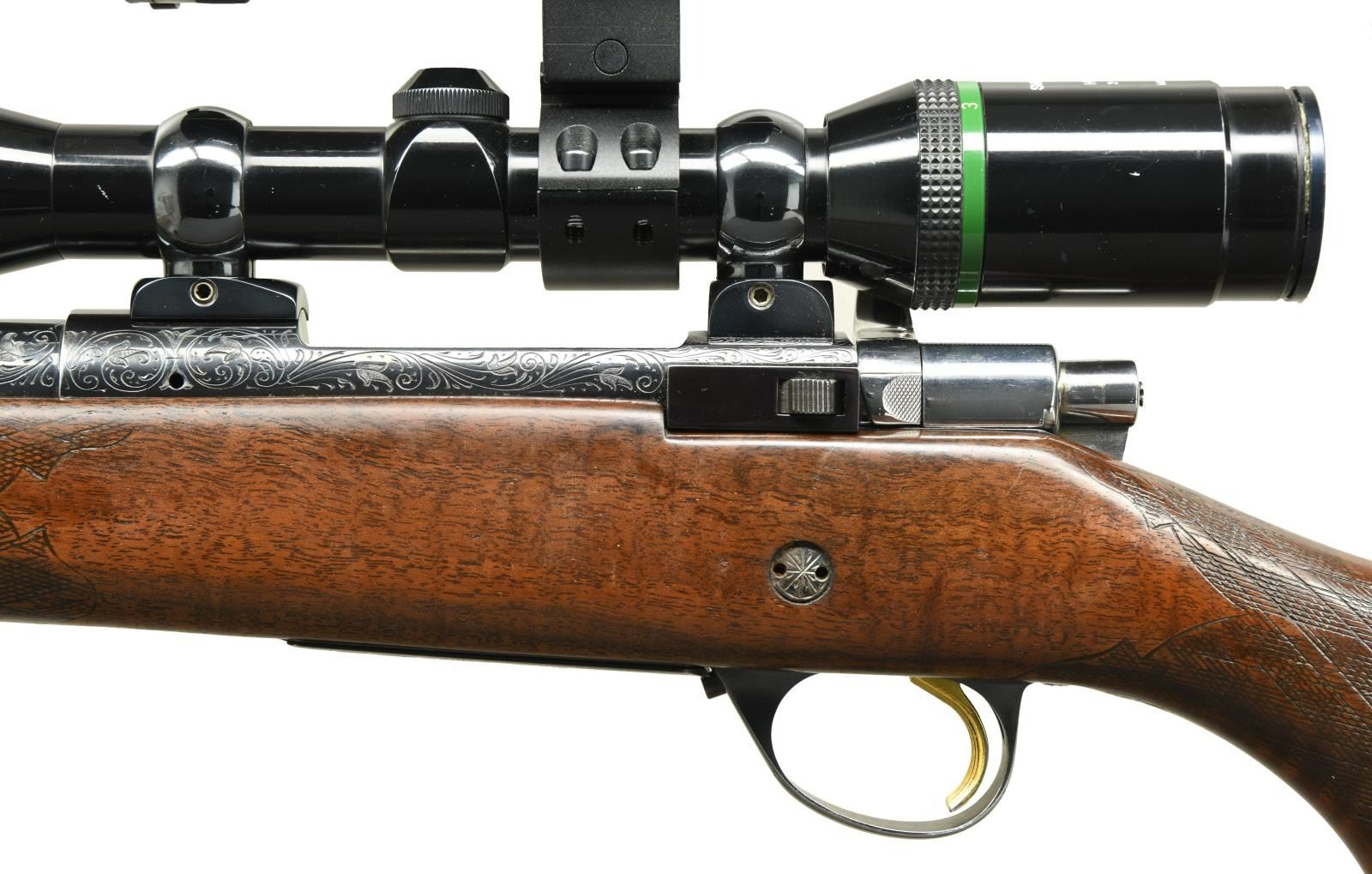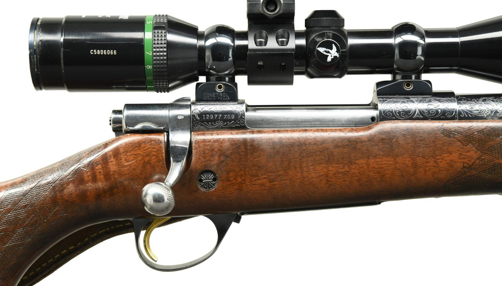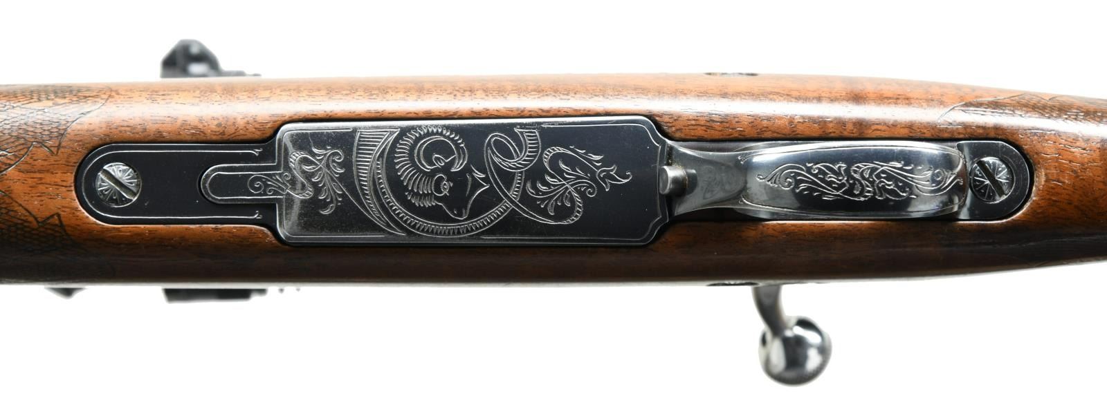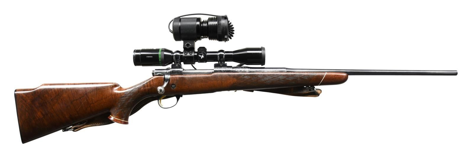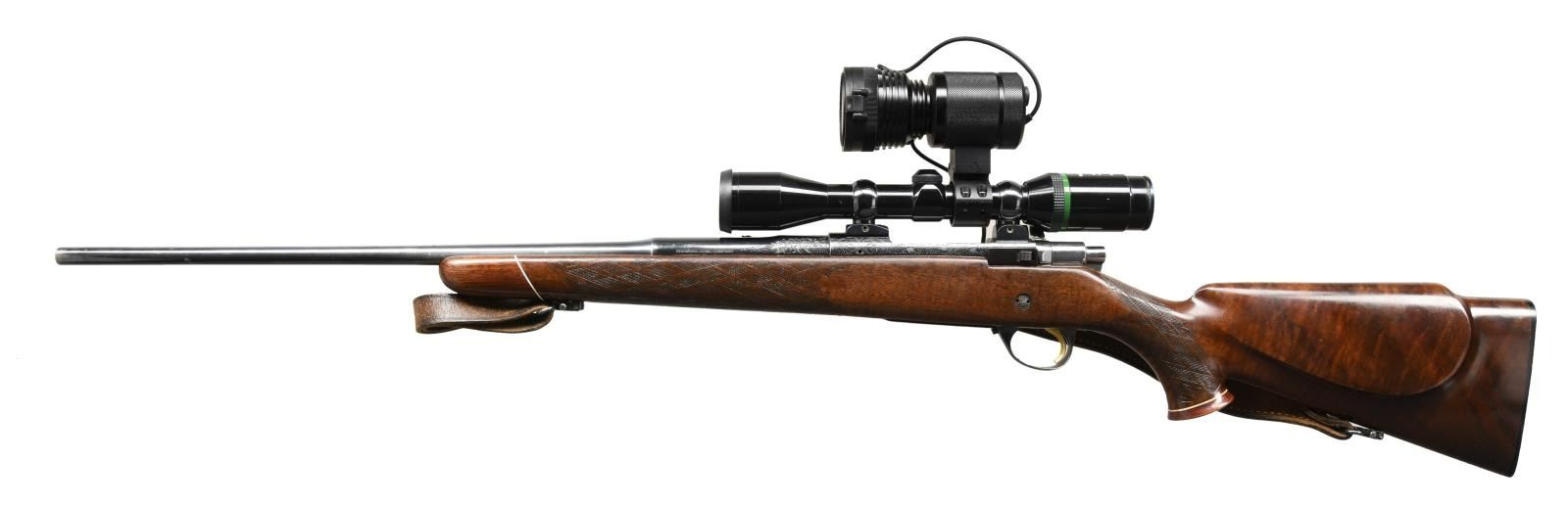 RIFLE WITH SWAROVSKI SCOPE AND GAME LIGHT. Cal. .243 Win. S# 12977-Z69. The 22" light weight barrel without sights has caliber, S# and "MADE IN BELGIUM" on rear along with some scroll engraving. Sako action with gold plated trigger and hinged floorplate is engraved in medallion style with open scroll. A big horn ram is on floorplate. Capped pistol grip stock of fine quilt figure lightly streaked European walnut measures 13-3/4" over Browning buttplate. Stock features Monte Carlo comb, swept right hand cheekpiece, rosewood forend tip and grip cap. Skipline checkering with fancy border and reinforcing stock bolt. Rifle is fitted with 1" tube Swarovski Habicht 3-9X scope with duplex reticle in 1" Conetrol rings and mounts. Scope in turn, is fitted with large diameter night hunting flash light with red filter. Rifle also comes with brown leather basket weave pattern cobra type sling with QD loops. CONDITION: good to fine. Metal showing considerable wear. Stock with old refinish has some marks, checkering is sanded or worn, almost smooth. Bore is bright and shiny. Mechanically good. Scope is fine with some marks, optically clear; rubber eye piece is loose, should be re-glued. Light is good and in working order. Stock wood tests positive for salt. Little metal damage noted except for some red rust in recoil bolt and on buttplate screws. (23-1441/MGM). C&R. $3,000-4,500.