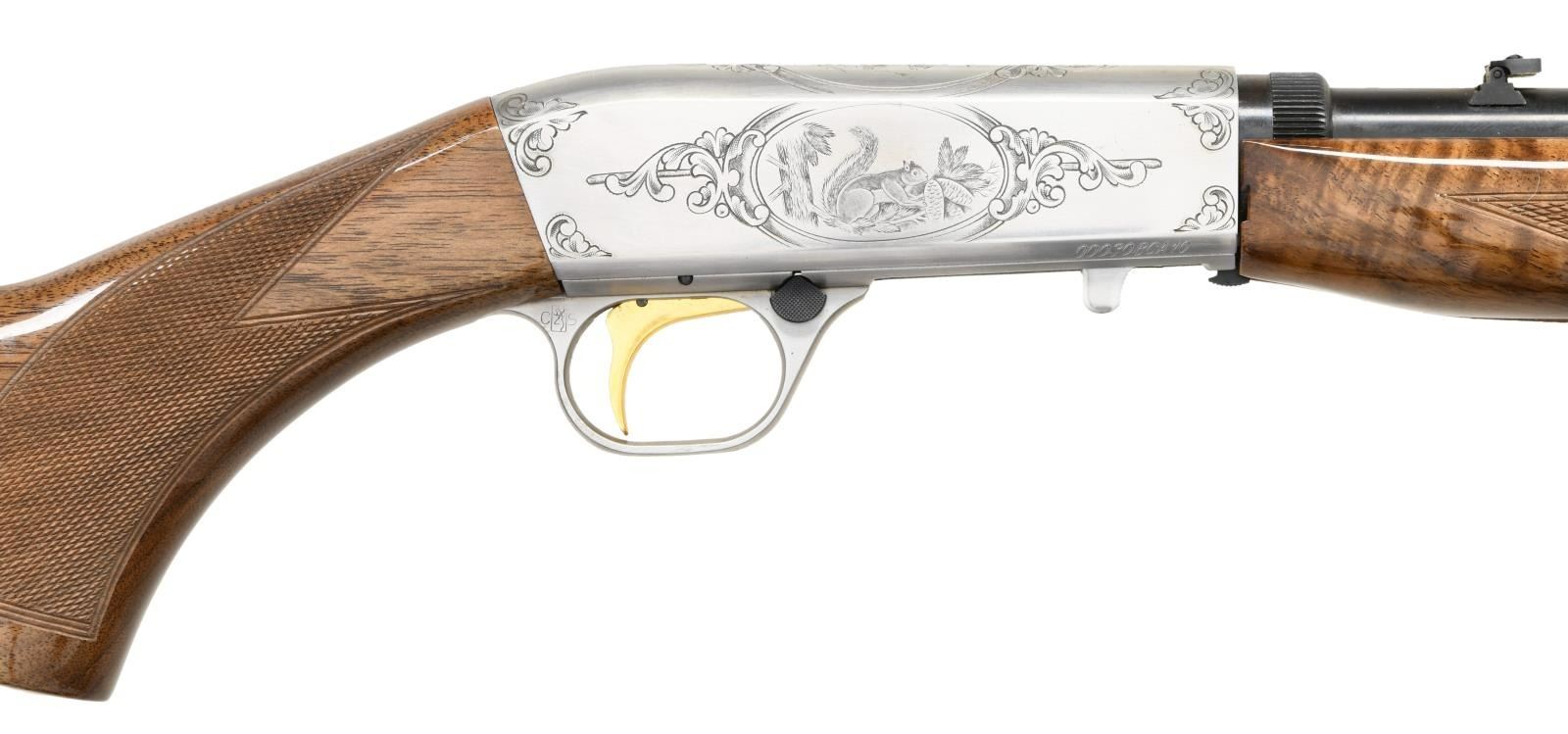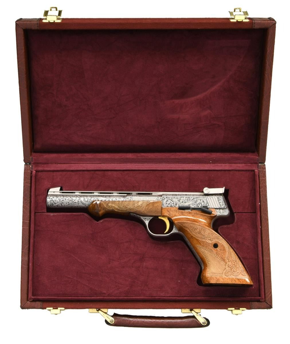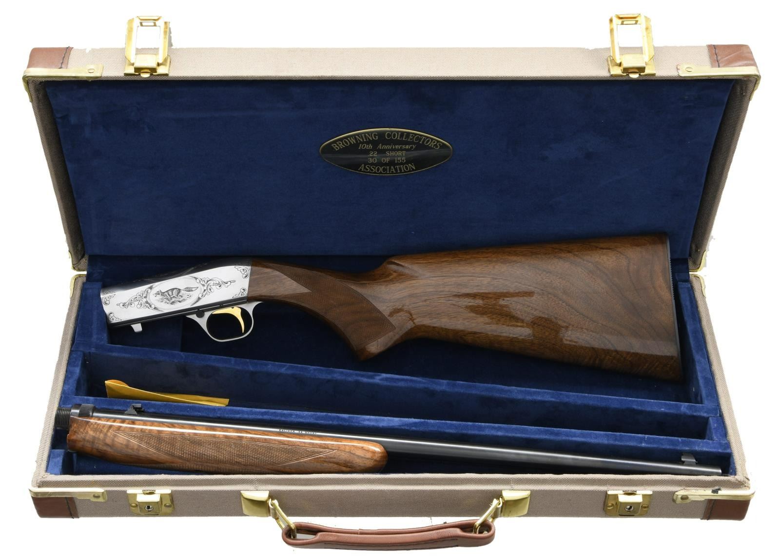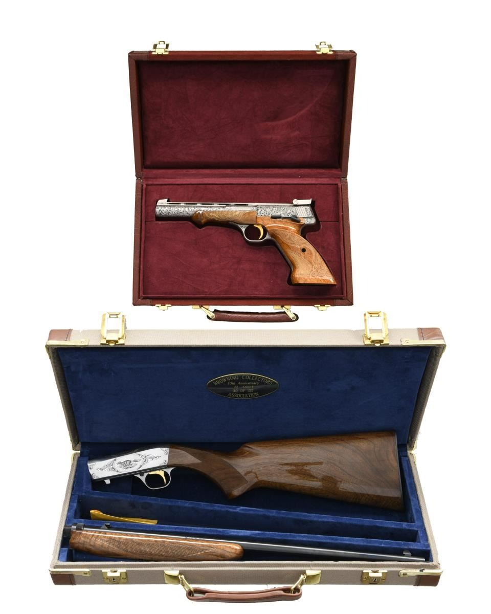 10TH ANNIVERSARY SET. GUN 1: 22 Takedown 10th anniversary special edition. No. 30 of 155 mfg. in 1989. Cal. 22 Short. S# 00030BCA10. Bbl. 19 3/8". Coin finished engraved action features vignettes w/ a squirrel on the right, cottontail rabbit on the top & a running fox on the left. Highlights of scroll engraving are found on either side of the scenes & at the front as well as rear of the receiver. Trigger guard bow has a matching scroll highlight. Engraving is signed "P. Lallemand". Gold finished trigger. Bead front sight w/ folding leaf rear sight. Beavertail forearm & pistol grip stock of gloss finished walnut w/ hand checkering. Mag. tube inserts through the grooved steel buttplate & loads on the right side. UNATTACHED ACCESSORIES: Browning luggage case w/ blue velour fitted interior. Inside lid of case has a 10th anniversary brass plaque. Case contains key. CONDITION: as new, appears unfired. (23-4769/DS). GUN 2: Renaissance metalist no. 30 of 60 mfg. in 1986. Cal. 22 LR. S# 655PT00030. Bbl. 6 3/4" w/ vent rib & patridge front sight as well as square notch adj. rear sight. French gray finished action & bbl. have full coverage Renaissance grade scroll engraving. Engraving is signed "Lewanczyk". Gold finished grooved trigger. Schnable tipped forearm & thumb rest target stocks of gloss finished walnut have fancy hand checkering w/ carving & beaded borders. UNATTACHED ACCESSORIES: Browning pistol case w/ maroon velour fitted interior. CONDITION: as new, appears unfired. (23-4770/DS). BOTH MODERNS. $6000-9000.