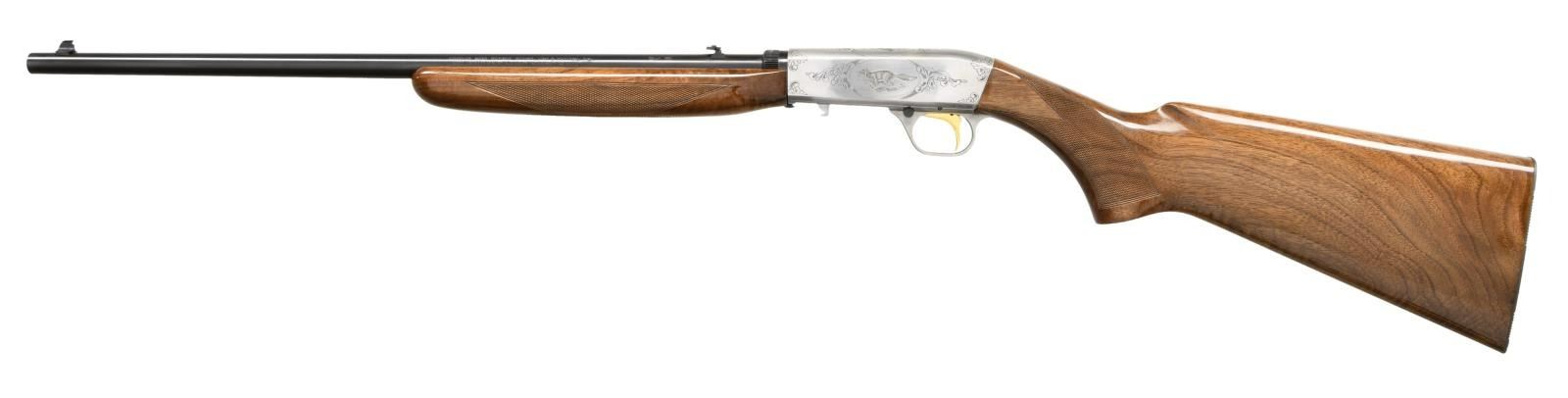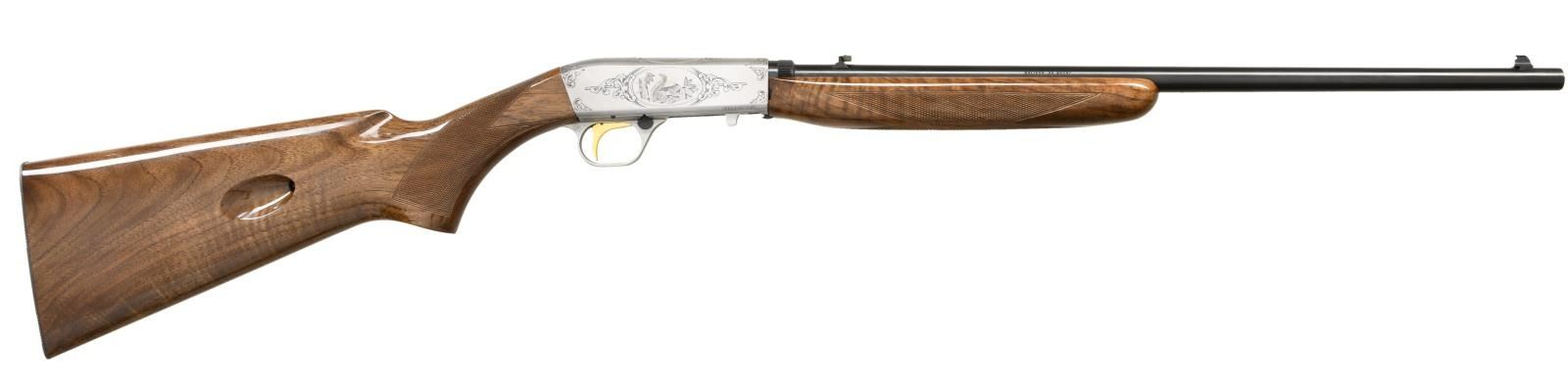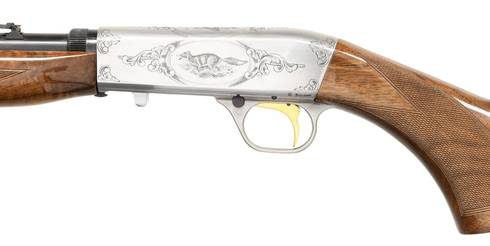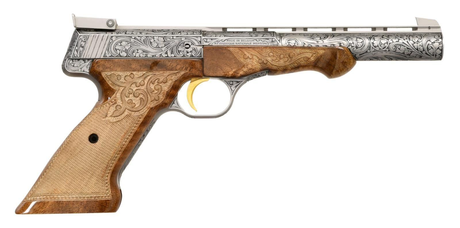 10TH ANNIVERSARY SET. GUN 1: 22 Takedown 10th anniversary special edition. No. 30 of 155 mfg. in 1989. Cal. 22 Short. S# 00030BCA10. Bbl. 19 3/8". Coin finished engraved action features vignettes w/ a squirrel on the right, cottontail rabbit on the top & a running fox on the left. Highlights of scroll engraving are found on either side of the scenes & at the front as well as rear of the receiver. Trigger guard bow has a matching scroll highlight. Engraving is signed "P. Lallemand". Gold finished trigger. Bead front sight w/ folding leaf rear sight. Beavertail forearm & pistol grip stock of gloss finished walnut w/ hand checkering. Mag. tube inserts through the grooved steel buttplate & loads on the right side. UNATTACHED ACCESSORIES: Browning luggage case w/ blue velour fitted interior. Inside lid of case has a 10th anniversary brass plaque. Case contains key. CONDITION: as new, appears unfired. (23-4769/DS). GUN 2: Renaissance metalist no. 30 of 60 mfg. in 1986. Cal. 22 LR. S# 655PT00030. Bbl. 6 3/4" w/ vent rib & patridge front sight as well as square notch adj. rear sight. French gray finished action & bbl. have full coverage Renaissance grade scroll engraving. Engraving is signed "Lewanczyk". Gold finished grooved trigger. Schnable tipped forearm & thumb rest target stocks of gloss finished walnut have fancy hand checkering w/ carving & beaded borders. UNATTACHED ACCESSORIES: Browning pistol case w/ maroon velour fitted interior. CONDITION: as new, appears unfired. (23-4770/DS). BOTH MODERNS. $6000-9000.