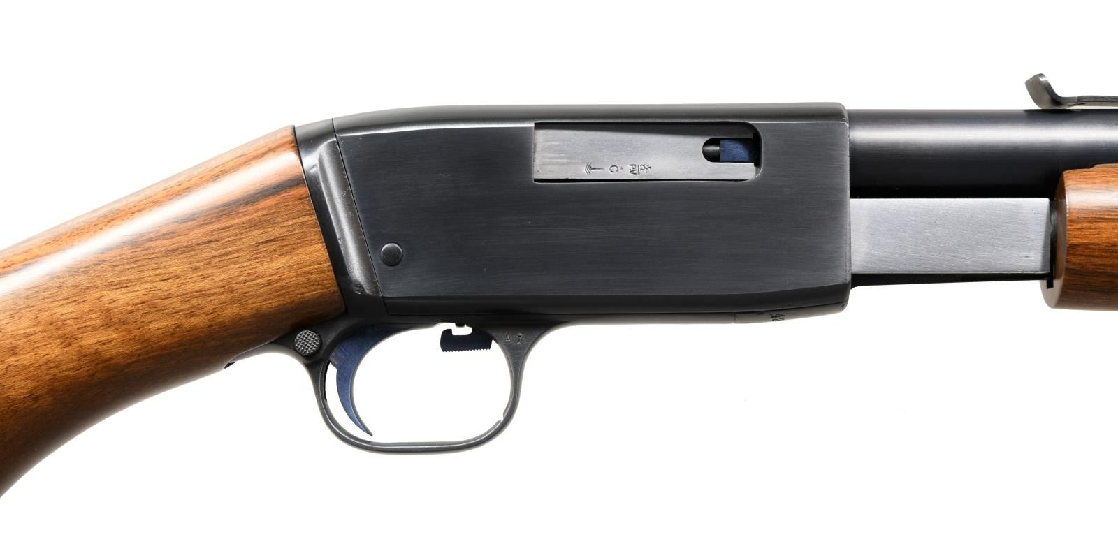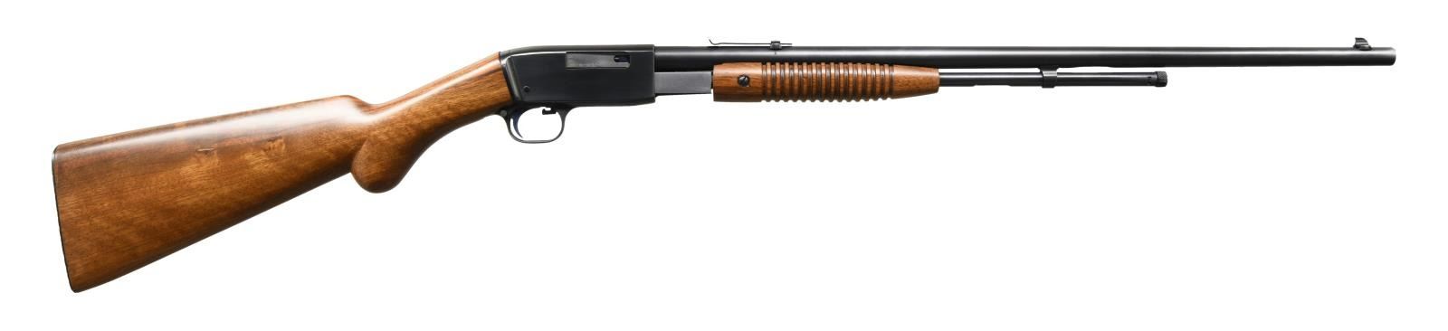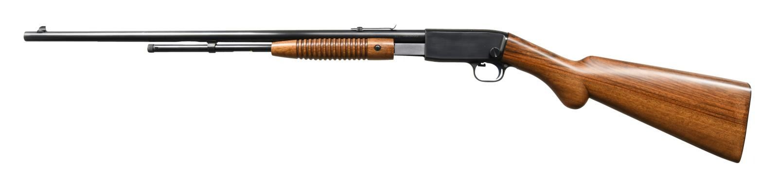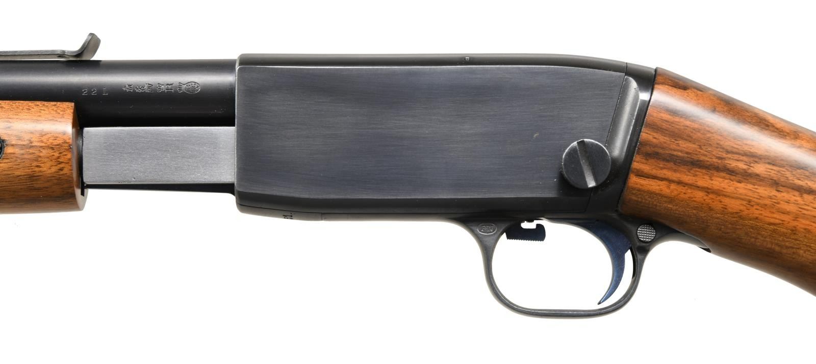 Cal. 22 LR. S# 42451. Bbl. 22" w/ factory dovetailed sights. Mfg. 1922-1974; approx. 15,000 units. Numerous Belgian proofs, rnd. rear trigger guard tang, rnd. knob buttstock w/ smooth metal butt plate & "22 L" on bbl. CONDITION: near excellent overall appearance of top quality restoration having very sharp proof marks. Very nice Nitre blued sm. parts. Light cleaning marks on magazine tube. Rear sight missing elevation screw. Very light marks around right eschuteon of operating handle. Near excellent bore. PROVENANCE: The Collection of Gun Sport Ltd. owned by Jon R. Thomas. (23-3640/NW). CURIO. $1.000-1,500.