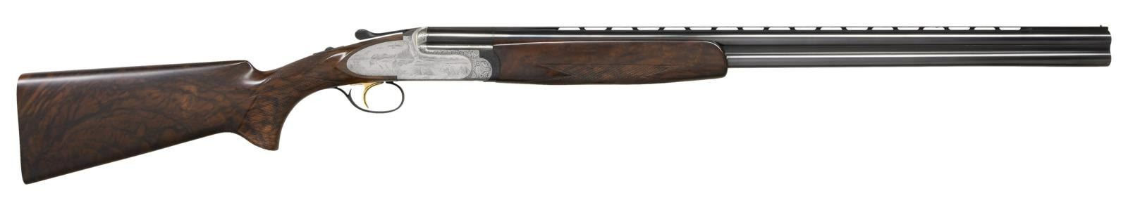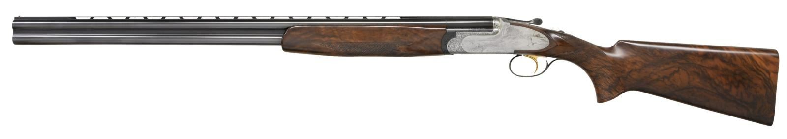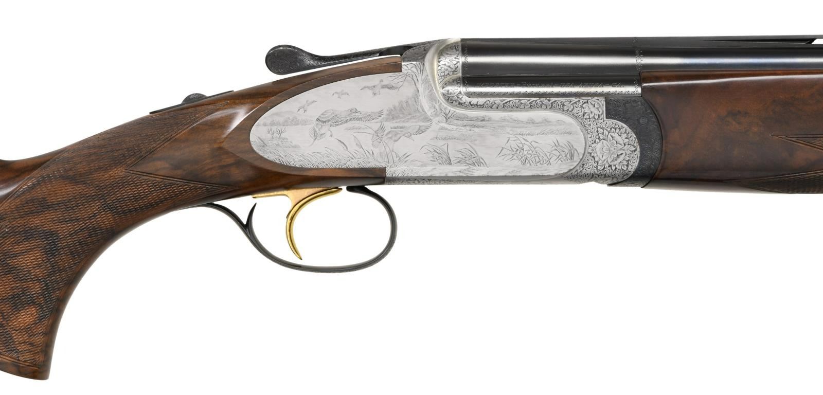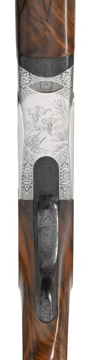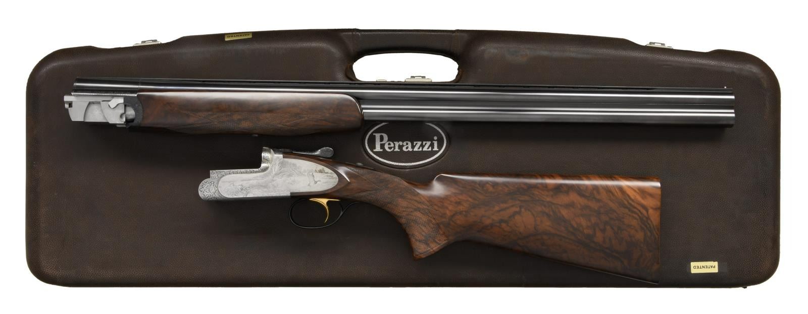 BY LORENZO GAMBA WITH CASE. Cal. 20 Ga. 2-3/4". S# 118931 (2000). The 28-1/2" monobloc barrels are fitted with narrow matted ventilated rib, solid side ribs and choke tubes. Maker's name and address are on left ejector housing and importer, "Perazzi USA" are on right. Bottom of monobloc is stamped with the year 2000 Italian nitro proofs and grade. Coin finished, low profile, small O/U Perazzi action is fitted with ornamental side plates and gold plated single selective trigger in blued firing group housing. Action is engraved with near full coverage small scroll with floral highlights which offsets bullino game and dog scenes that continue onto sideplates. A pair of golden retrievers watch a mallard take wing in marsh setting on left side, while a group of pintail ducks settle into a cattail marsh on right. Bottom of action portrays a pair of mallards flying over a marsh. Engraver's signature "GAMBA" is on trigger plate (Lorenzo Gamba born in 1954 engraves guns for numerous Italian, English, German and American gunmakers). Exhibition quality extravagantly marbled European walnut extreme pistol grip buttstock measures 14-1/2" over checkered wood butt. Point pattern checkering is at grip. Matching slim one piece field forend has Deeley type release. MEASUREMENTS: STOCK: DAH: 1-7/8". DAC: 1-3/8". CAST: neutral. LOP: 14-1/2". WEIGHT: 7 lb. 2 oz. UNATTACHED ACCESSORIES: gun is housed in its original dark brown leather covered Perazzi marked case. Interior is lined in Perazzi marked cloth and contains: paperwork in thin red wallet, stock removal tool, bags for barrels and action and black plastic container holding 4 choke tubes and wrench (2 tubes in gun for a total of 6). CONDITION: exceptionally fine. Appears essentially "as new" with almost no evidence of having been fired since proof. There are only a scattering of miniscule handling and assembly marks on all surfaces. Case is also very fine. This gun currently retails for well over $45,000. (23-4761/MGM). MODERN. $30,000-45,000.