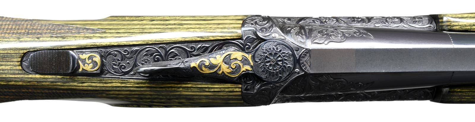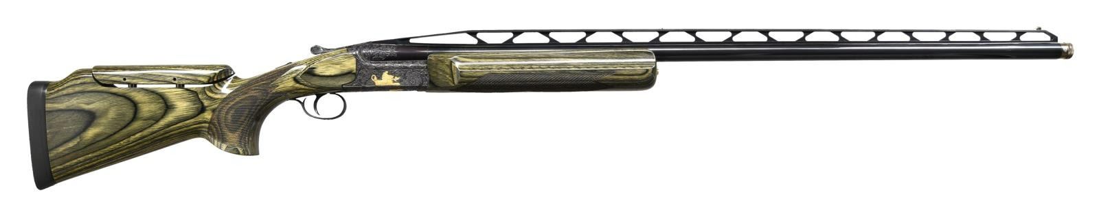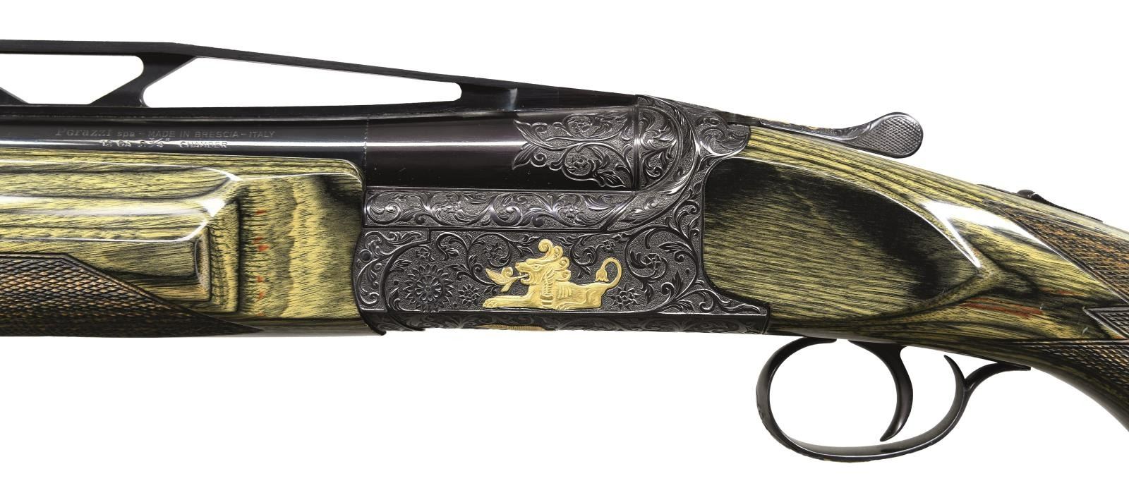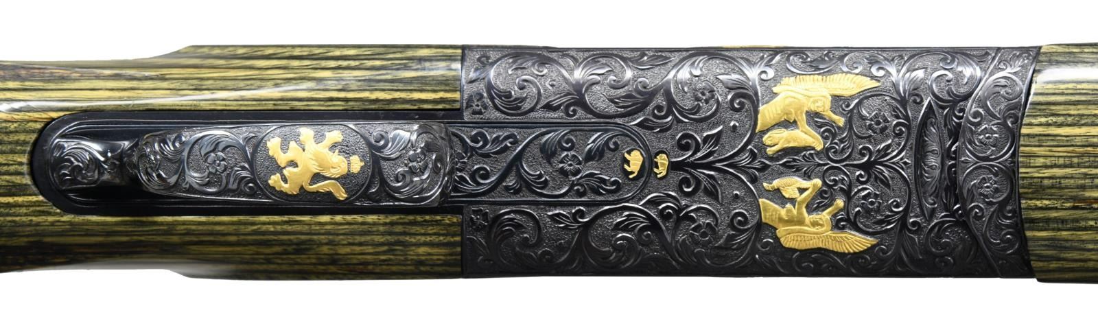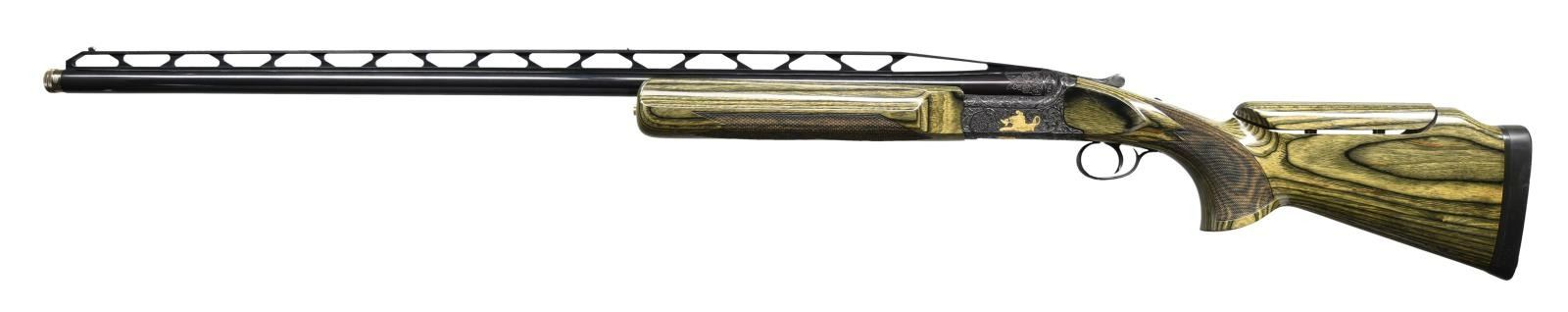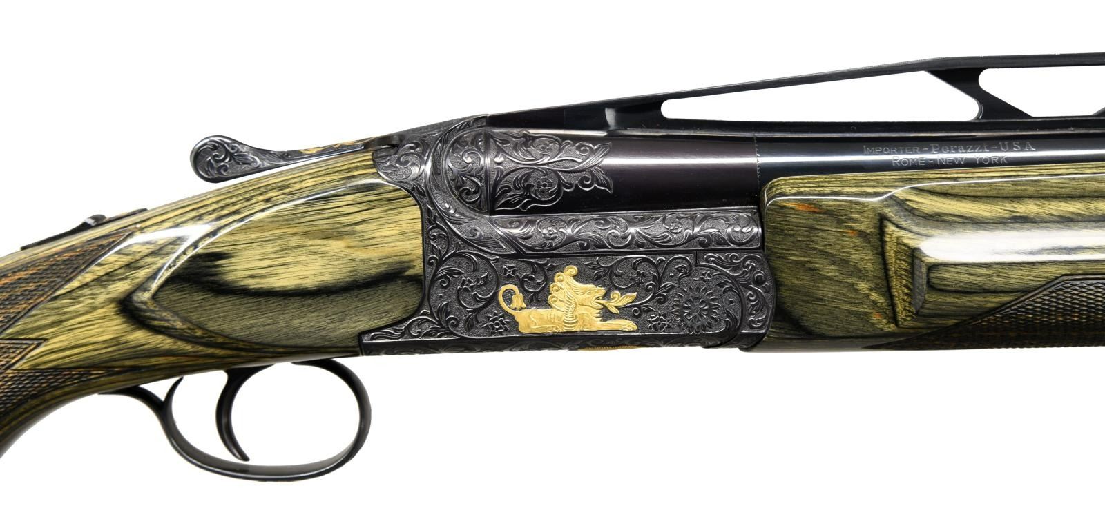GRIFFIN ENGRAVING BY THE CELEBRATED BILL MAINS. Cal. 12 Ga. 2-3/4" S# PU70521. The 33-1/2" mono-bloc barrel fitted with choke tubes has very high matted ventilated rib. Mono-bloc is stamped with 1987 Italian nitro proofs. Relief carved scrolling acanthus is on breech end. Blued Perazzi singles action is marked "SCO" on left flat. Action is engraved with full coverage, large open scrolling acanthus which surrounds relief gold inlays of griffins on sides which have leaves emanating from their mouths. Bottom of action depicts gold angels holding dead game while a rampant lion is on trigger guard bow. Semi-relief scroll is on top lever and safety button. This well done work is by Bill Mains famous ex-Colt engraver who's buffalo signature is gold inlaid on bottom of action and trigger plate. Extreme ambidextrous pistol grip stock is made of green wood laminate and measures 14-3/4" over black "Kick-eez" pad. An adjustable comb has been fitted. Point pattern checkering is at grip. Matching target type forend has Anson type push button release. MEASUREMENTS: LOP: 14-3/4". WEIGHT: 9 lb. 7 oz. CONDITION: very fine. Metal retaining nearly all original blue. Stocks have only a few minor marks. Bright shiny bore. Mechanically good. PROVENANCE: From the personal collection of Brad Shepherd. (23-2098/MGM) MODERN. $6,000-9,000.