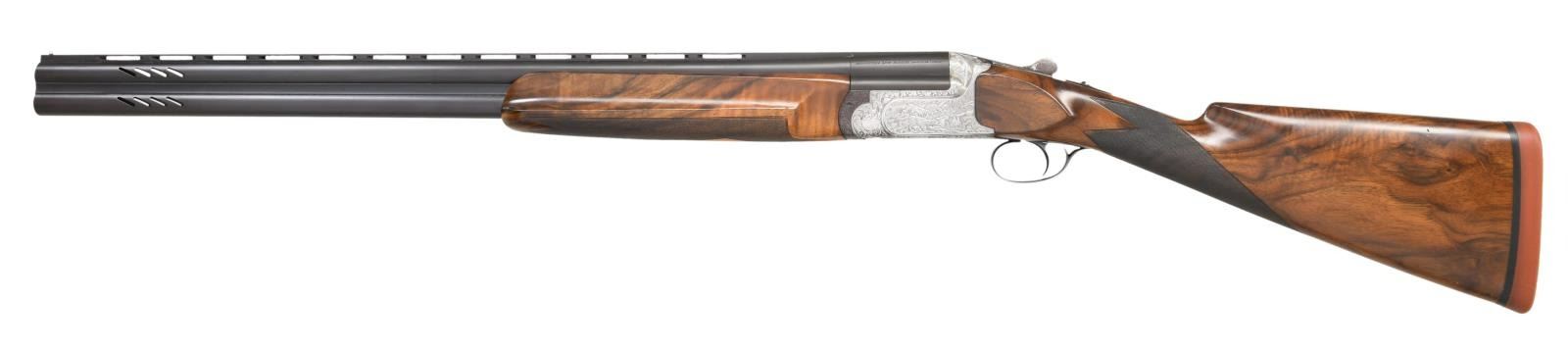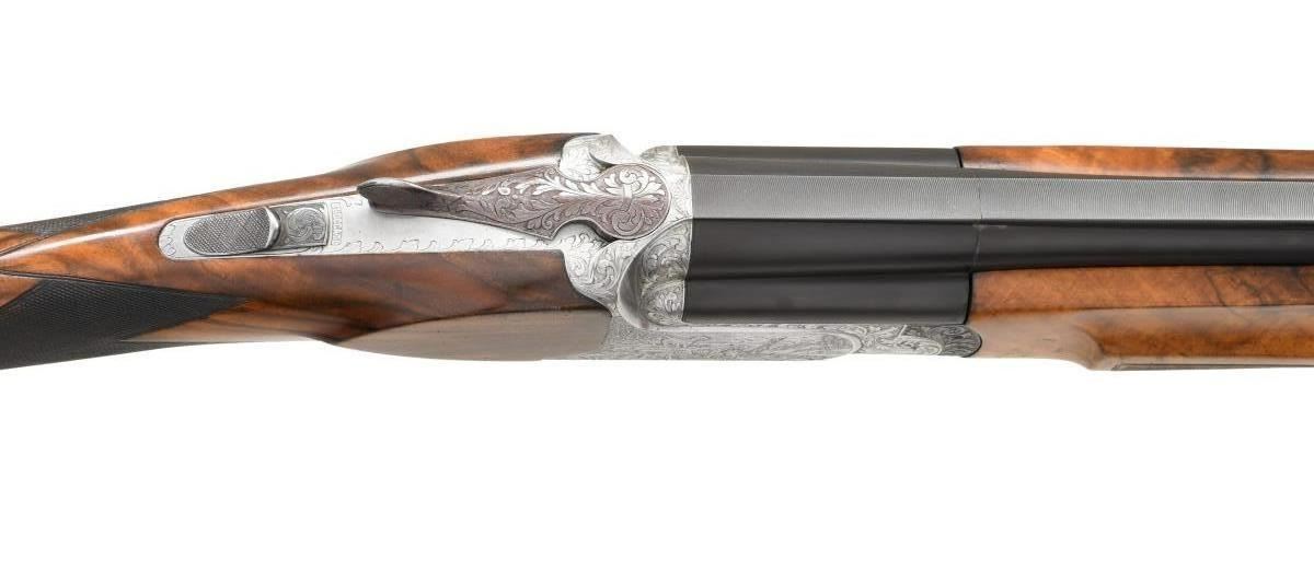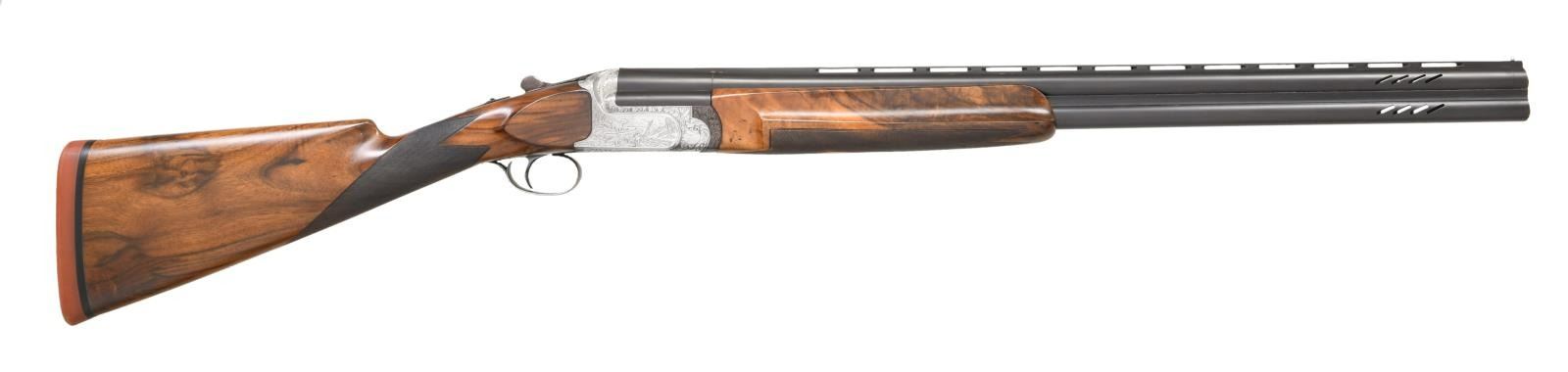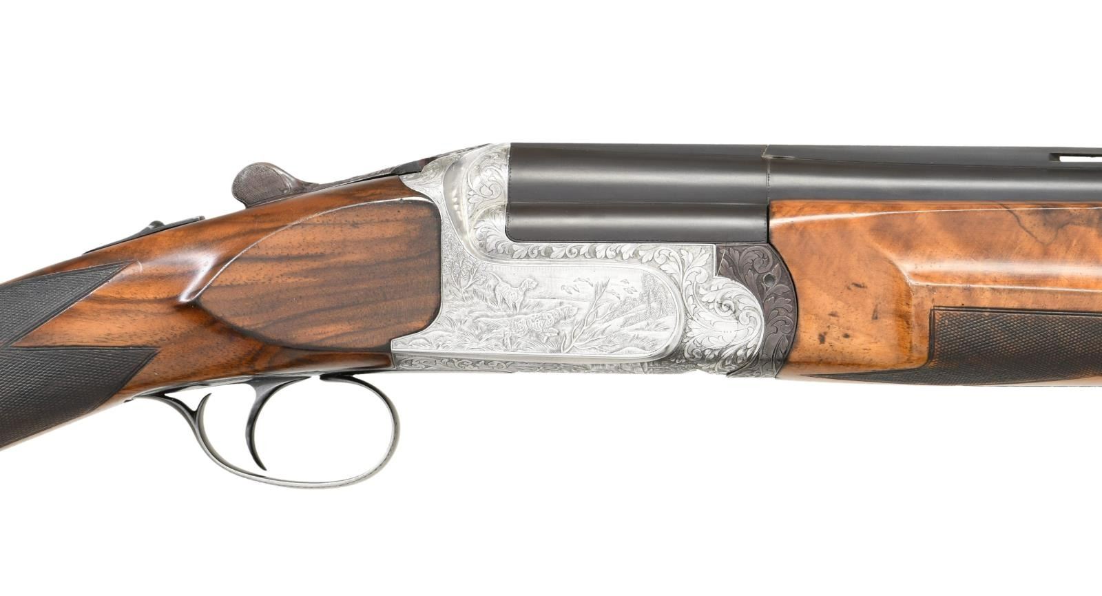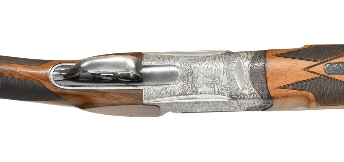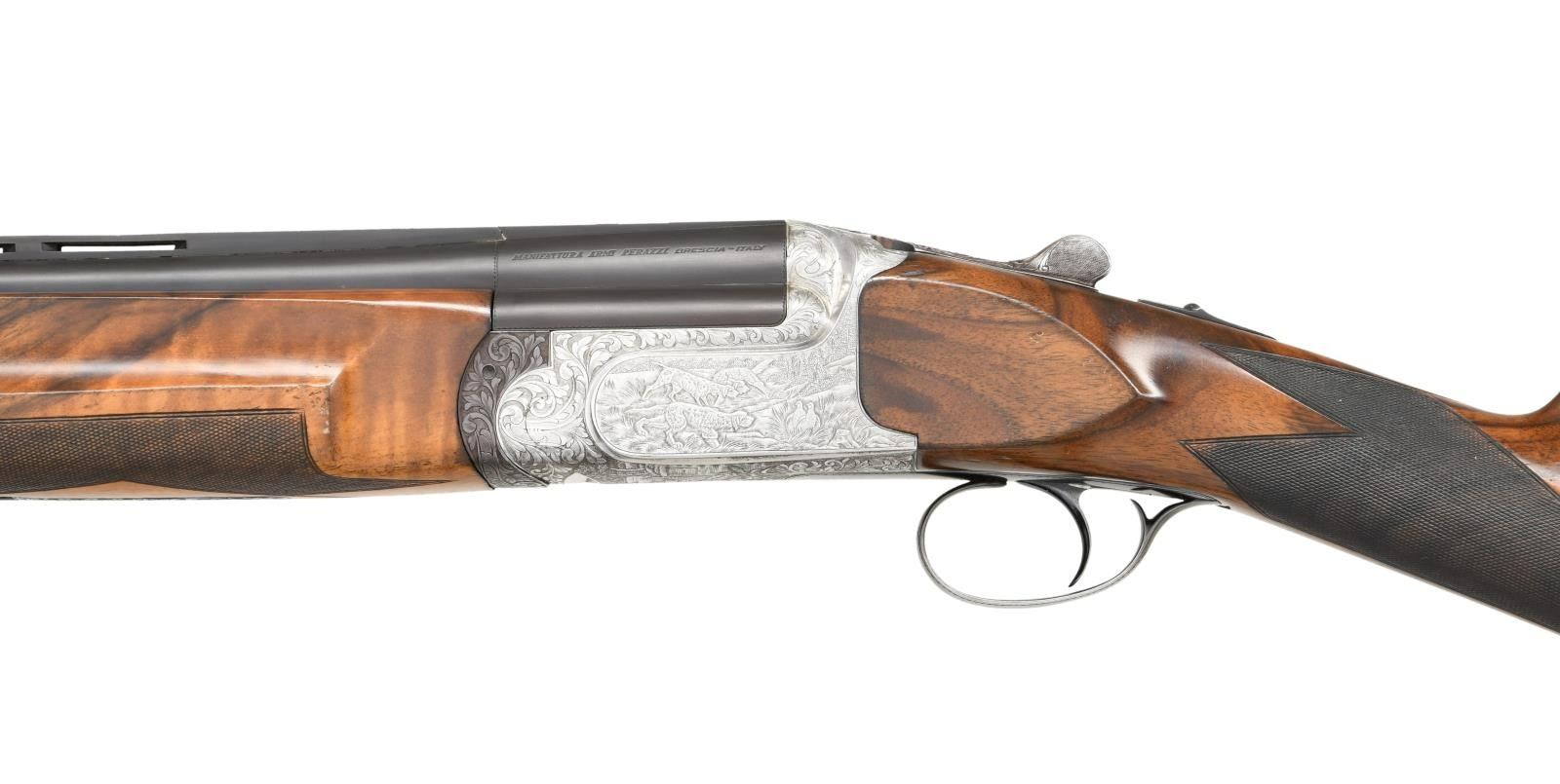. Cal. 12 Ga. 2-3/4". S# 33298 (1968). The 26" mono-bloc barrels are fitted with matted ventilated rib and are ported. Maker's name and address are on top left of mono-bloc. Bottom of mono-block is stamped with 1968 Italian nitro proofs for 2-3/4" chambers. Coin finished low profile MX-8 action is of early production as action was named after the Mexico City Olympics of 1968. Action features removal trigger/firing group with "V" springs and non-selective single trigger. Safety is non-automatic. Action is engraved in SC3 style with attractively cut large flowing shaded scroll which surrounds game scenes on sides and bottom. Left side portrays a trio of dogs; two setters and a pointer, all pointing a pair of nested quail. Right side shows setter and pointer watching a flock of departing quail; while the bottom portrays a pair of ducks settling into a marsh. No engraver's signature is found. Straight grip buttstock made of attractively marbled and lightly figured European walnut measures 14" over solid red "Decelerator" pad. Point pattern checkering is at grip. Matching one piece beavertail type forend has Deeley type release. MEASUREMENTS: BBLS: Bore Diameter: O .725. U .725. Restriction: O .004 (IC). U .004 (IC). Wall thickness: O .026. U .028. STOCK: DAH: 2-1/16". DAC: 1-7/16". CAST: about 1/4" off. LOP: 14". WEIGHT: 7 lb. 9 oz. CONDITION: fine as partially refinished. Barrels retaining nearly of a new re-black. Action shows some light cleaning with some remaining frosting in beads. Stocks retain most of their original finish with some areas worn through on high edges. Checkering shows moderate wear. Bores are bright and shiny. Action is tight although top lever stops a considerable distance left of center. Mechanically good. There is some discoloration from chemical bleed out on interior of forend iron with some rusting evident at front of mono-bloc left side of bottom barrel. (23-2177/MGM). C&R. $6,000-9,000.