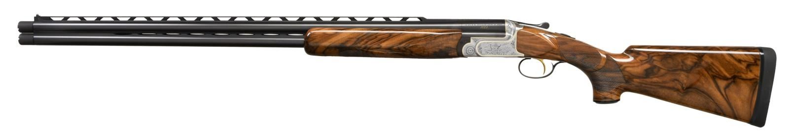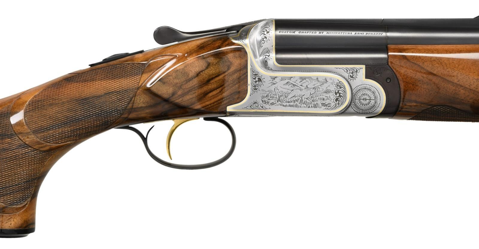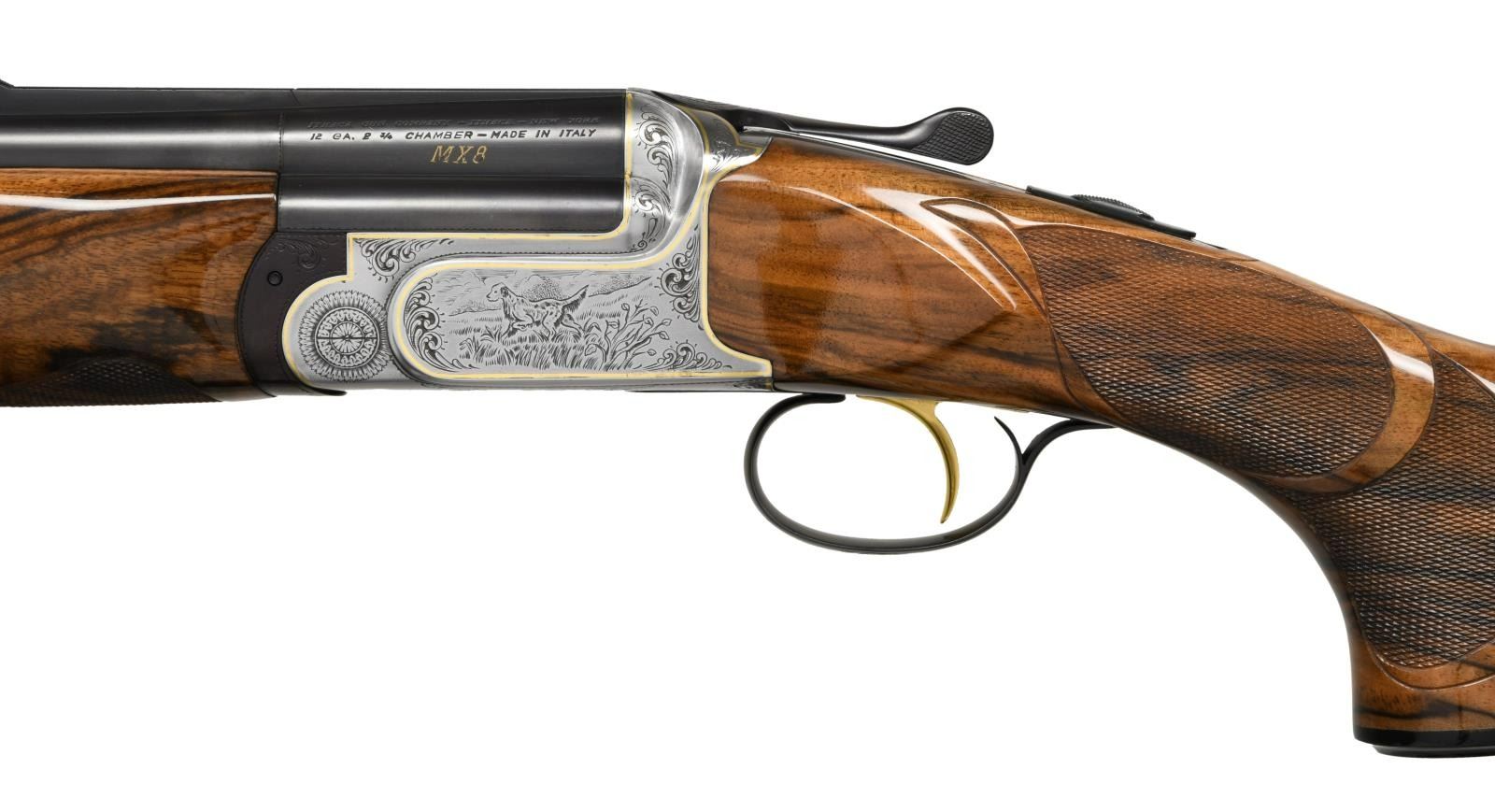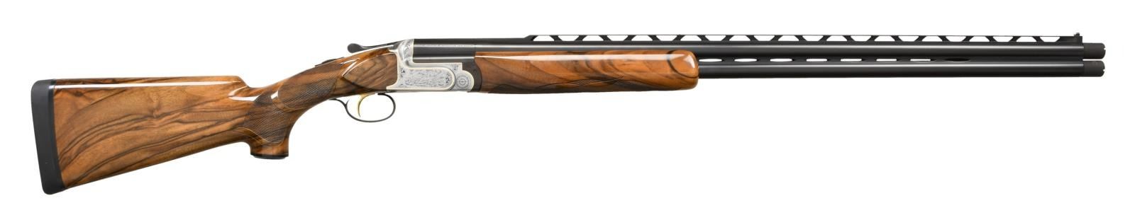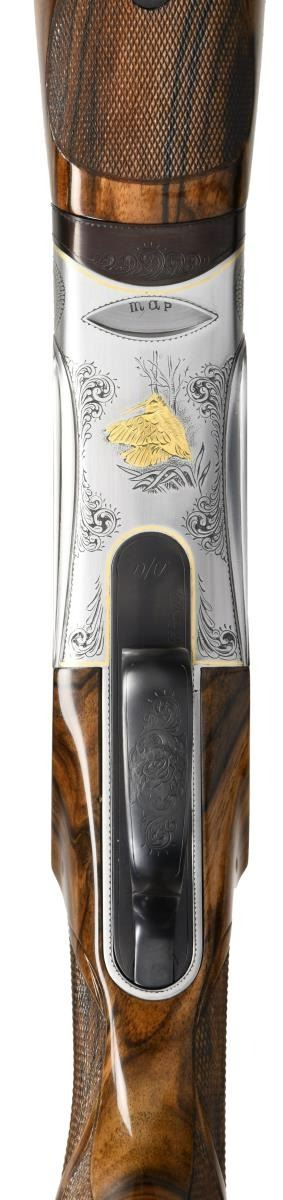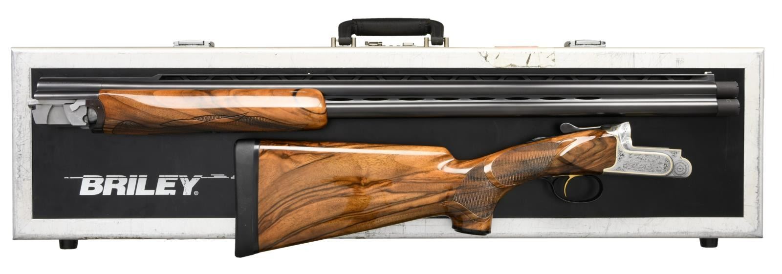 WITH STOCKS BY BRENT UMBERGER INCLUDING 28 GA TUBE SET AND CASE. Cal. 12 Ga., 2 3/4". S# 38745. The 30" monobloc barrels with raised ventilated rib and ventilated side ribs are fitted with choke tubes. Ithaca retailer and Perazzi info along with MX8 are on monobloc. Bottom is stamped with 1971 Italian nitro proofs. Coin finished action with removable trigger group features gold plated single non selective trigger for O/U and blocked out safety. Action is engraved with sprays of well cut shaded scroll within gold line borders surrounding nicely detailed dog and bird scenes, with pointing setter on left and pointer on right sides. A gold inlaid woodcock is on bottom of action. Engraver's signature "F.L. Conroy '95" "-FEGA-" are on trigger group. Per Consignor, trigger group engraved by Frank Conroy & remainder engraved by Joseph Depasquale. Beautifully marbled and lightly figured European walnut extreme pistol grip buttstock measures 14 3/4" over black Kick Eez pad and features attractively designed flowing incised carving and ribbons through checkering pattern on grip with right had palm swell. Hard rubber grip cap has gold oval on bottom marked "BRENT UMBERGER" "MASTER STOCKMAKER". Matching one piece forend has Deeley type release. MEASUREMENTS: STOCK: DAH: 1 13/16". DAC: 1 11/16". CAST: about 3/8" off. LOP: 14 3/4". WEIGHT: 8lb. 7oz. UNATTACHED ACCESSORIES: gun is housed in aluminum Americase marked "Briley" which contains: 28 Ga. full length barrel tubes by Briley with installation and removal tool, 28 Ga. choke tubes, 12 Ga. choke tubes with wrenches and stock removal tool. CONDITION: very fine as custom finished, retaining nearly all high quality finishes on wood and metal. Mechanically fine. Case and accessories are fine. (23-4838/MGM). CURIO. $4,000-6,000.