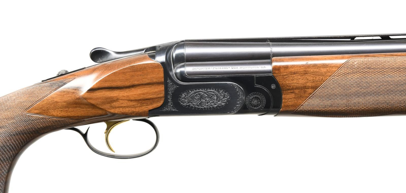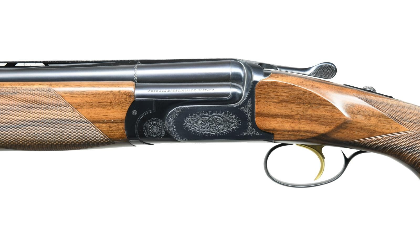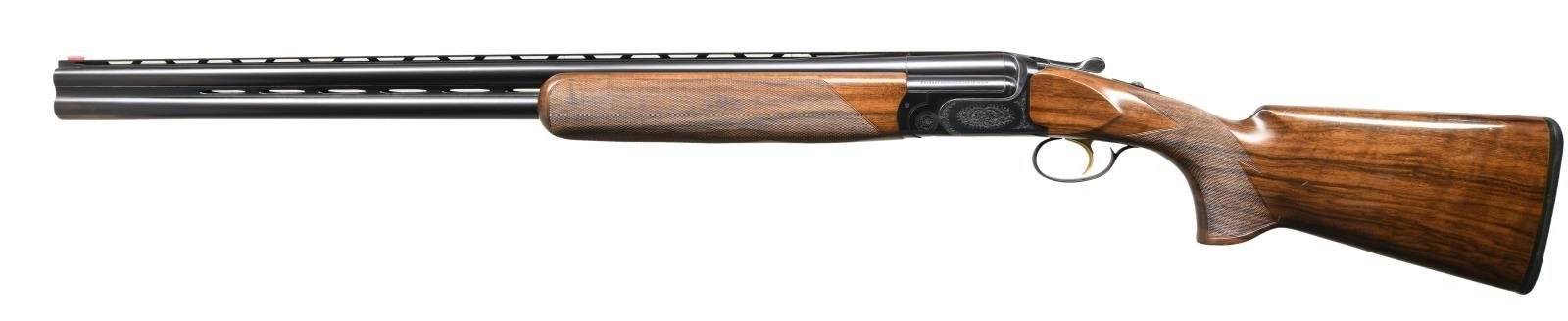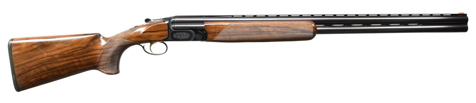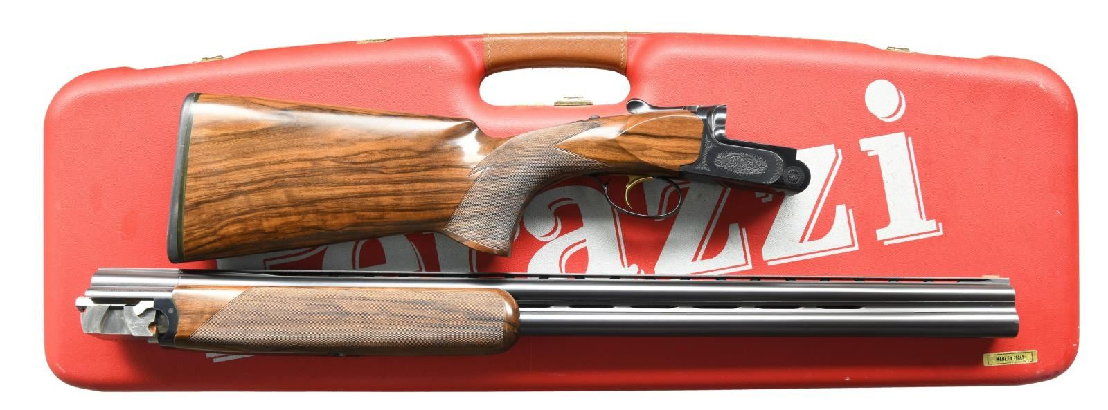 Cal. 12 Ga. 2-3/4". S# 114315. The 28-3/8" monobloc barrels with matted ventilated top rib and ventilated side ribs have Perazzi address and importer information (Monrovia, CA.) on ejector housings. Bottom of monobloc is stamped with 1999 Italian nitro proofs for 2-3/4" chambers. Bottom barrel is fitted with choke tube. Blued low profile MX8 action is fitted with non-automatic safety and removable trigger group with "V" springs. Non-selective single trigger is gold plated. Action is engraved with sprays of small well cut scroll surrounding central floral and ribbon engraved ovals. The quality of this work is very fine. Extreme pistol grip buttstock of well veined and lightly figured European walnut measures 14" over thin black Perazzi pad. A right hand palm swell is on point pattern checkered grip. Matching one piece target type forend has Deeley type release. MEASUREMENTS: BBLS: Bore Diameter: O .724. U .723. Restriction: O .036 (Full). U Choke tube with .022 (Mod). Wall thickness: O .033. U .033. STOCK: DAH: 1-15/16". DAC: 1-1/2+". CAST: about 1/2" off. LOP: 14". WEIGHT: 8 lb. 4oz. UNATTACHED ACCESSORIES: gun is housed in its original ABS Perazzi marked case, lined in blue Perazzi marked cloth. Case contains paperwork, stock removal tool, spare parts kit (which is complete) and tube of Perazzi grease. Also includes a case of 5 choke tubes & wrench. CONDITION: very fine, showing very little use. Metal parts retaining essentially all of their original blue with a hint of high edge wear and some scattered light flecking. Stocks retain most of their original oil finish, checkering with very light wear. Stocks generally show some very light marks however there are six or seven heavier small dings on left side of butt at face. Bores are bright and shiny. Mechanically fine. This gun retails for around $13,000. (23-1700/MGM). MODERN. $3,500-5,500.