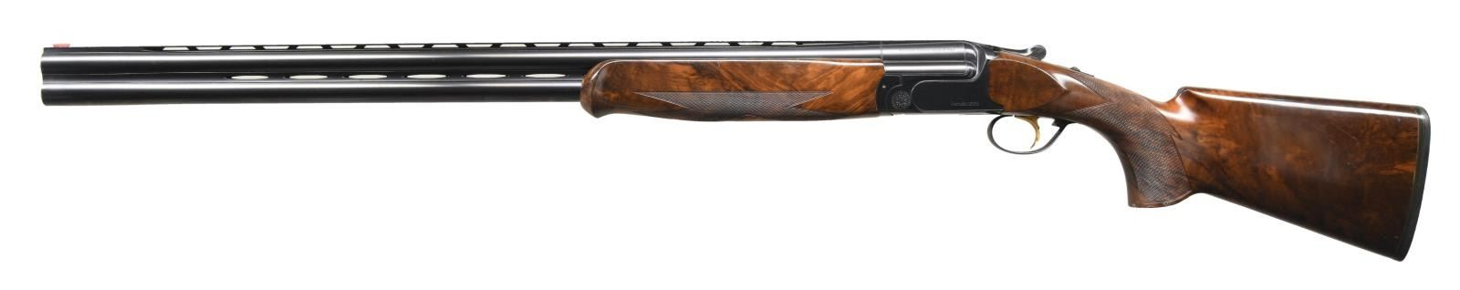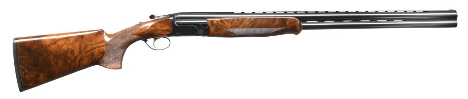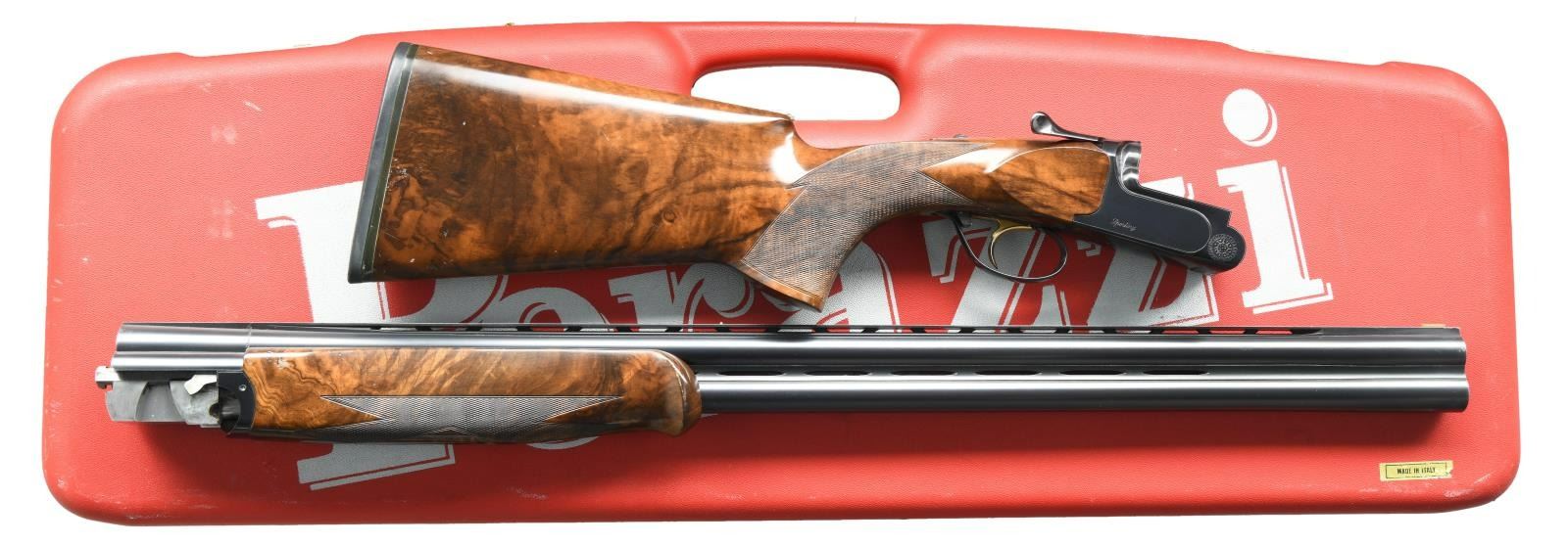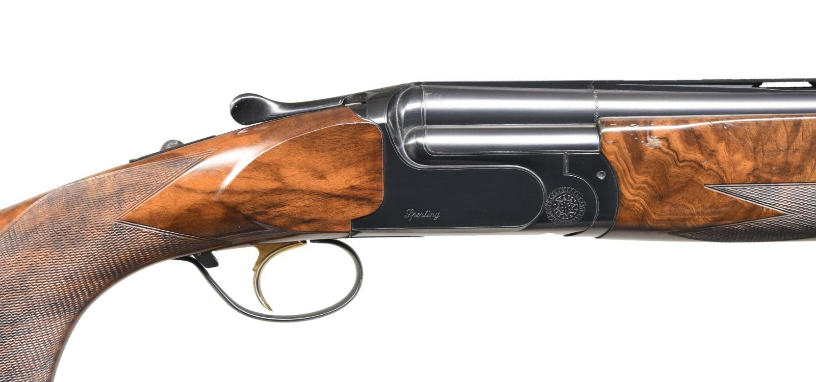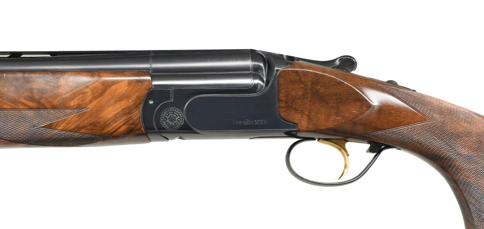 Cal. 12 Ga. 2-3/4". S# 99666. The 29-1/2" monobloc barrels fitted with choke tubes have ventilated top and side ribs and are marked with Perazzi address and "MADE IN ITALY" on top left of monobloc. Bottom of monobloc is stamped with 1997 Italian nitro proofs for 2-3/4" chambers. Blued MX8 action features non-automatic safety and removable trigger group having "V" springs which is fitted with gold plated single selective trigger. Left side of action is marked "Perazzi MX8"; right side is marked "Sporting". Extreme pistol grip buttstock measures 13-7/8" over thin black Perazzi pad and is made from an attractive piece of stump figured European walnut. Stock has right hand palm swell on point pattern checkered grip. One piece schnabeled matching forend has Deeley type release. MEASUREMENTS: STOCK: DAH: 2-1/4". DAC: 1-1/2+". CAST: approximately 1/2" off. LOP: 13-7/8". WEIGHT: 8 lb. 5 oz. UNATTACHED ACCESSORIES: gun comes in red ABS Perazzi marked case with blue Perazzi marked cloth lining and it contains: stock removal tool, paperwork in red folder, spare parts kit and tube of grease. CONDITION: very fine, showing moderate use. Metal with high edge wear. Stocks show a fair number of marks; checkering lightly worn. Shiny bores, mechanically good. Case is good, parts kit complete. (23-1701/MGM). MODERN. $3,500-5,500.