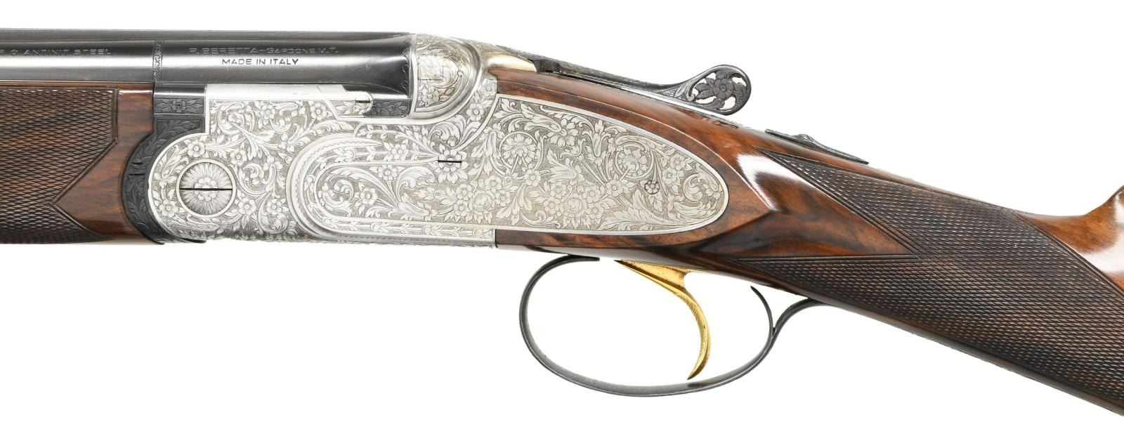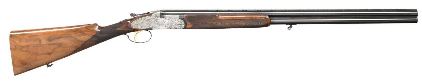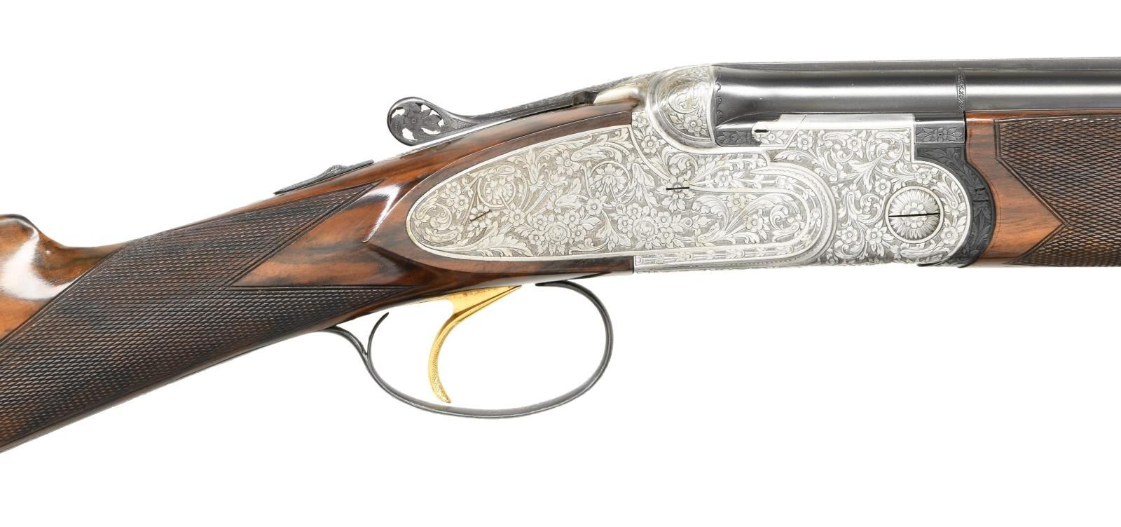 Cal. 20 ga. 2 3/4". S# 29921. Bbls. 27 1/2" vent rib. Coin finished side plated action w/ full coverage rose & scroll hand engraving having punch dot backgrounds. The engraving extends to the pierced top lever, safety button & long tang trigger guard. Trigger guard bow has gold inlaid initials AC. Engraver's signature "Loli" is found on lower tang. Gold finished checkered single selective trigger. Selective ejectors. Trim finger grooved forearm & straight grip stock of gloss finished fancy walnut w/ hand checkering. LOP: 13 5/8" to a checkered butt. DAC: 1 1/2. DAH: 2 1/4. Neutral cast. Toeline of stock & bbl. has sling swivels. Inside of forearm iron & breech of bbls. are hand jeweled. Gold plated cocking levers. WEIGHT: 5 lbs, 12.8 oz. Bore diameter: U, .624, O, 620. Choke constriction: U, .011, O, .022. Minimum wall thickness: U, .033, O, .040. CONDITION: over 98% metal finish. Original wood finish shows light wear w/ numerous scratches & marks. Very good bores. (23-4817/DS). CURIO. $7000-10000.