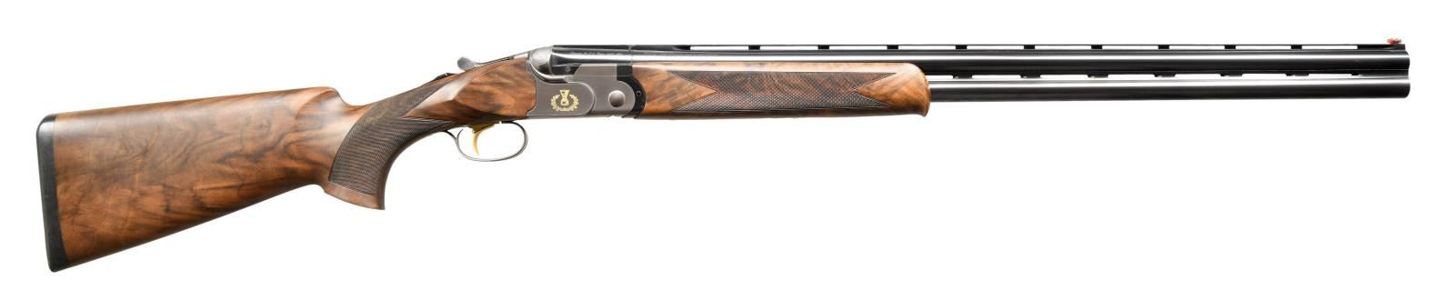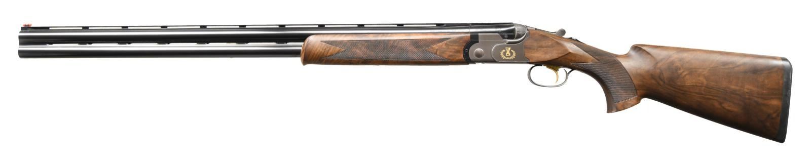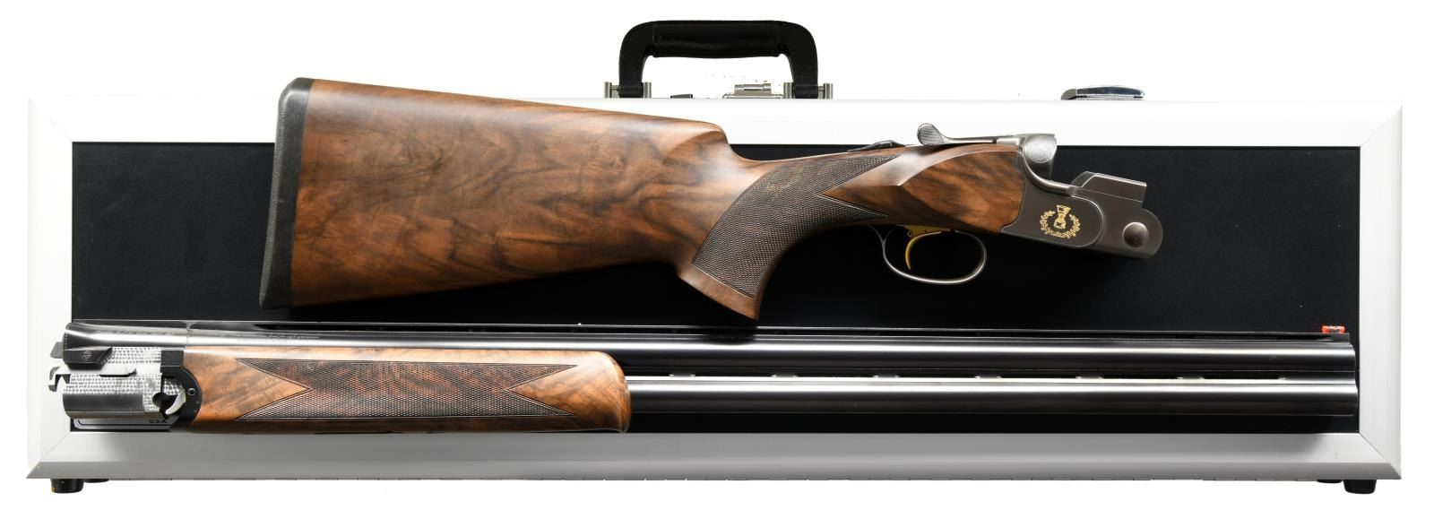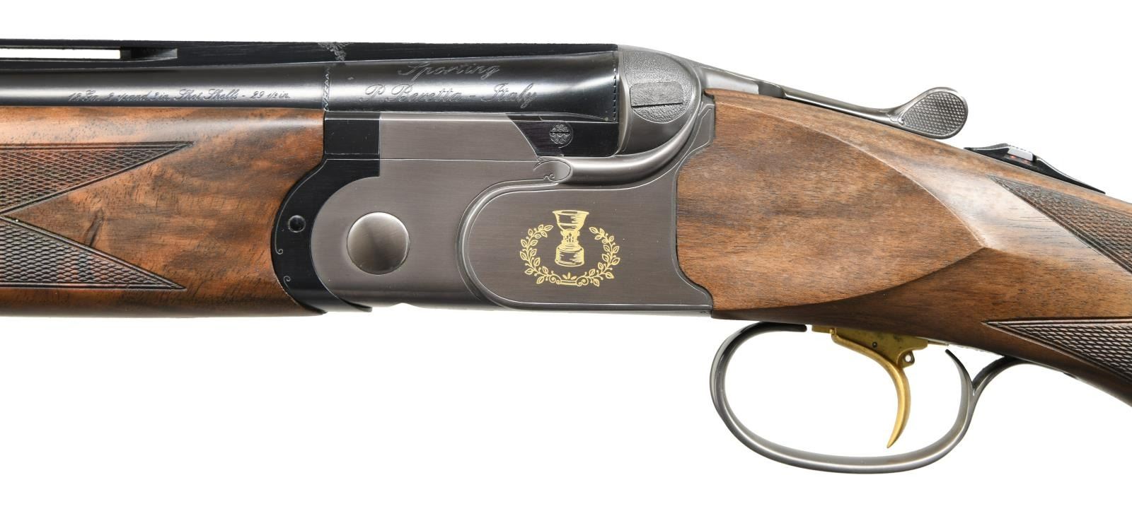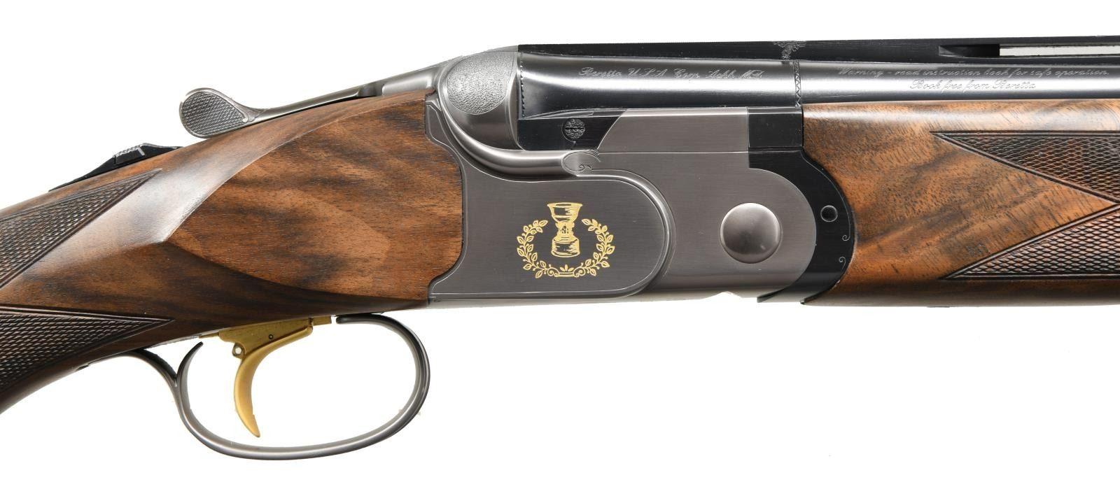 Cal. 12 Ga. 3". S# AD6941B. The 29-1/2" mono-bloc barrels with choke tubes have slightly raised ventilated rib and ventilated side ribs. Bottom of mono-bloc is stamped with 1997 Italian nitro proofs for 3" chambers. Dark gray finish O/U action features non-automatic safety and gold plated selective single trigger. Trigger blade is adjustable for position. Action is decorated with line borders surrounding gold washed laurel leaves and trophy cups. Bottom of action is stamped with Maker's name, model and logo which are also gold washed. "SPORTING" is on trigger guard bow. Extreme pistol grip buttstock with right hand palm swell is of nicely marbled and stump figured European walnut and measures 14-3/4" (trigger mid position) over black Beretta pad. Matching one piece schnabled forend has Deeley type release. MEASUREMENTS: STOCK: DAH: 2-1/4". DAC: 1-3/8"+. CAST: neutral. LOP: 14-3/4". WEIGHT: 8 lb. 3 oz. UNATTACHED ACCESSORIES: gun comes in aluminum "Americase" with black ballistic cloth cover which is lined in black velvet. Case contains choke removal tool and two Briley choke tubes (two in gun for a total of 4. Beretta molded case containing paperwork, cleaning tools, 3 sets of 12 GA. Snap caps, 4 screwdriver sets and extra trigger, sears, firing pin and beads. CONDITION: exceptionally fine close to "as new" with only some minor handling and assembly marks in all original factory finishes. Mechanically crisp. Case is also fine. Cloth covering needs to be re-glued. (23-1691/MGM). MODERN. $3,000-5,000.
