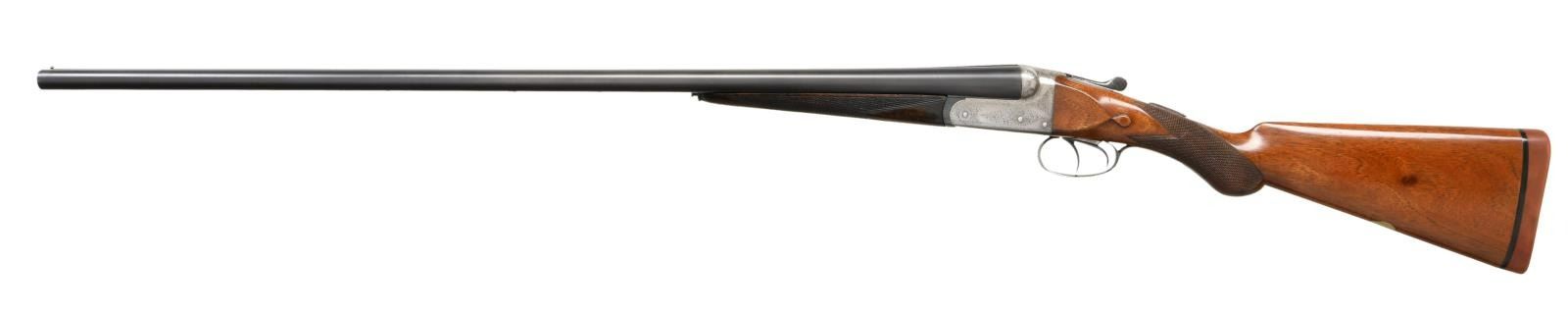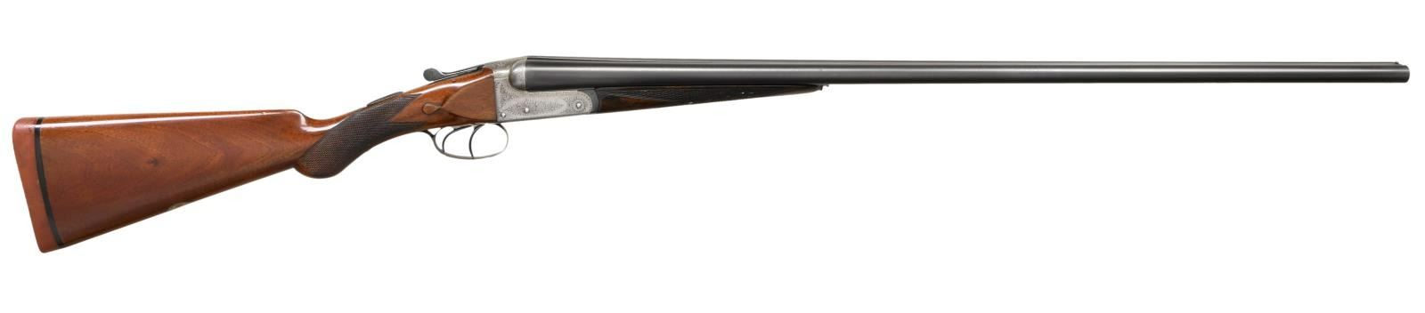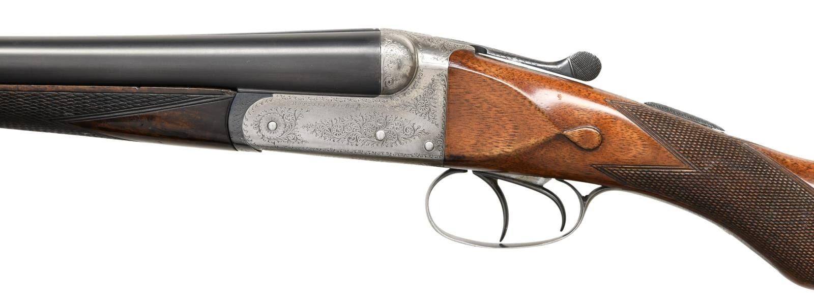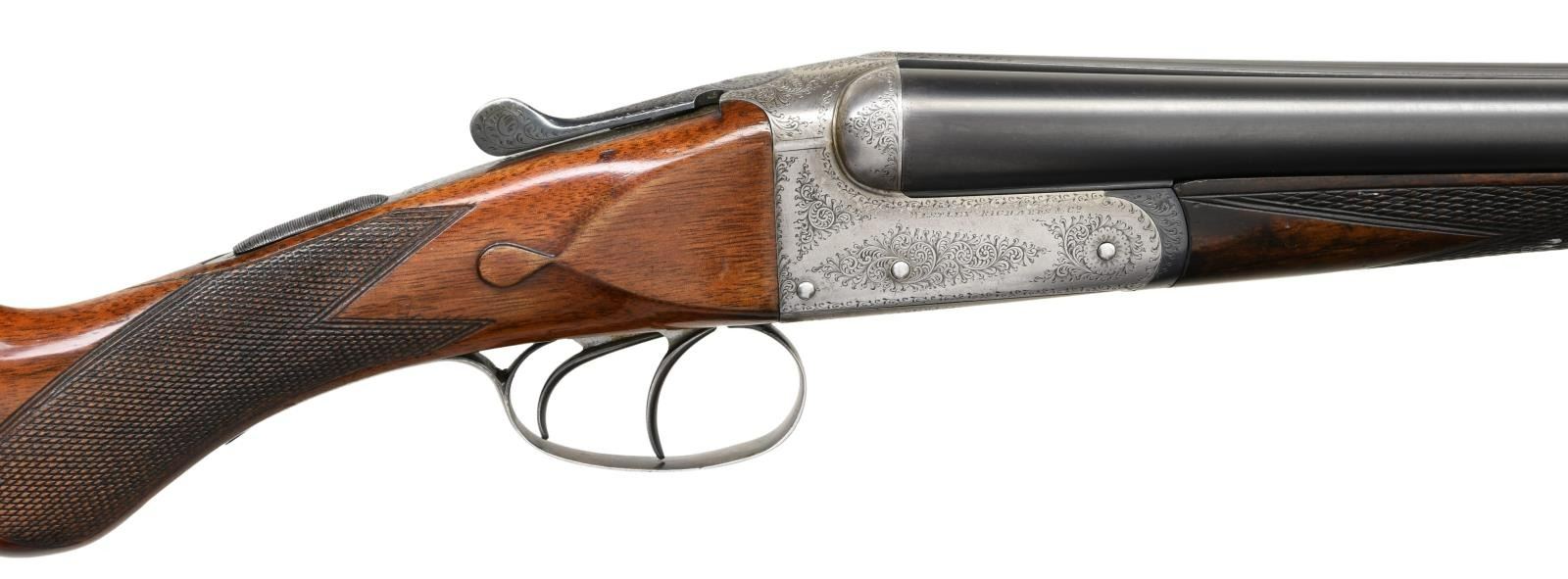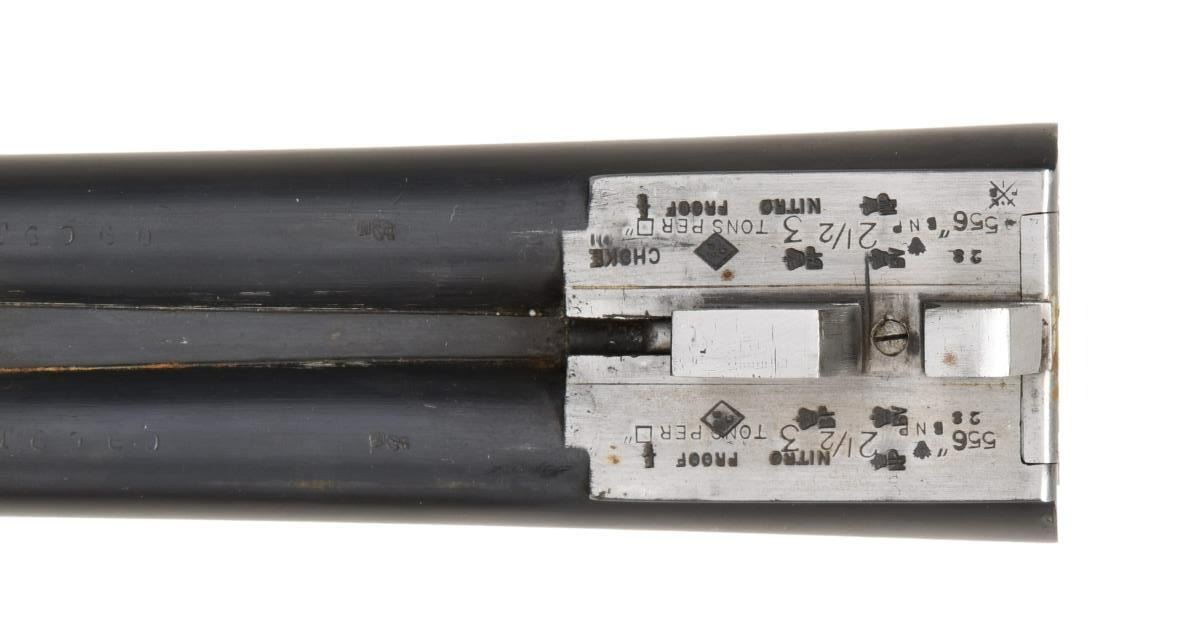 Cal. 28 Ga., 2 1/2". S# T6960 (1922). The 28 1/8" dovetailed barrels are engraved "Westley Richard & Co. London" on narrow game rib. Barrel flats are stamped with Birmingham nitro proofs for 2 1/2" chambers. Small boxlock action features automatic safety and double triggers. Action is engraved with 80% coverage well cut scroll; maker's name is on each side. S# is on scroll engraved trigger guard tang. Plain European walnut round knob pistol grip buttstock measures 14 1/4" over Silver type pad and features drop points, point pattern checkering and vacant silver oval. Matching splinter forend has Anson release. MEASUREMENTS: BBLS: Bore Diameter: L .564. R .560. Restriction: L .030 (Full). R .010. (IC). Wall thickness: L .026. R .030. STOCK: DAH: 2". DAC: 1 5/8". CAST: neutral. LOP: 14 1/4". WEIGHT: 5 lb. 2 oz. CONDITION: good as refinished. Barrels retaining nearly all of a good quality reblue, engraving softened. Action is cleaned to silver gray. Floorplate and trigger guard are cleaned and cold blued to grayish brown. Buttstock, possibly replaced, has oil finish with a few marks. Forend with darker wood has recut checkering. Bores are bright and shiny. Action is tight with forend installed, a bit shaky with forend removed otherwise mechanically good. (23-1287/MGM). CURIO. $2,000-3,000.