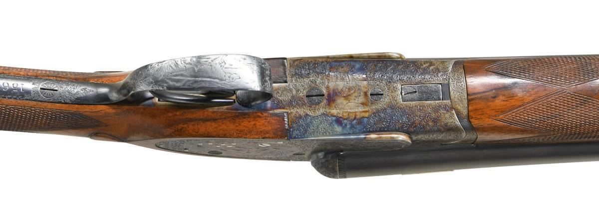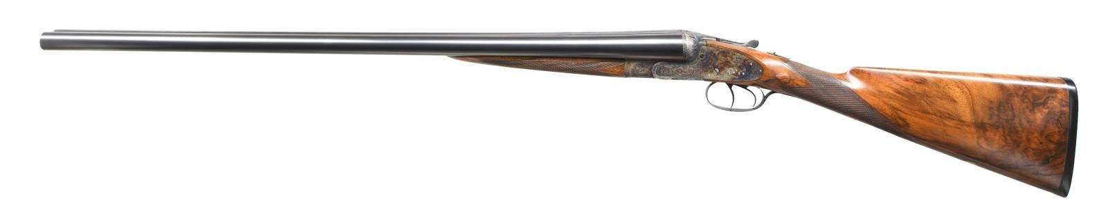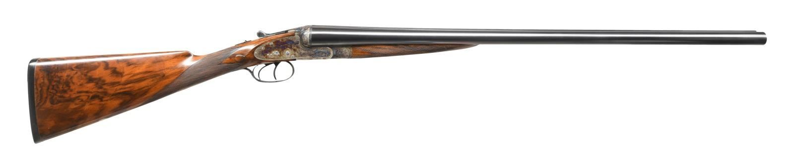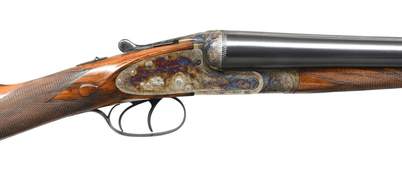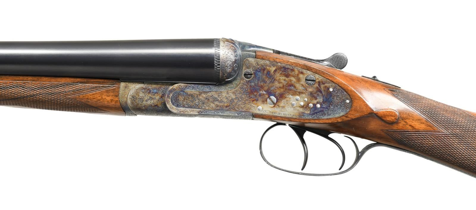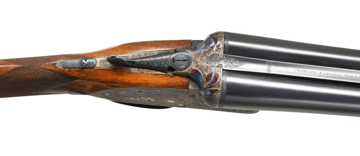GAME GUN NICELY REFURBISHED. Cal. 12 Ga. 2-3/4". S# 15600 (1908). The 27" dovetailed barrels are engraved "Charles Boswell. Maker. 126 Strand. London. W. C." on swamped game rib with dolls head extension. Barrel flats are stamped with Birmingham nitro proofs for 3 tons and Birmingham reproofs for 2-3/4" chambers. S#'s are engraved on bottoms of barrels. Case hardened action with back spring side locks have S#, maker's name, London view proofs and Birmingham proofs on watertable. Action also features automatic safely ("SAFE" inlaid in gold), third fastener which engages dolls head rib extension, bushed strikers, gold line tumbler end cocking indicators and double triggers. Action is engraved with near full coverage exceptionally well cut shaded scroll with some small scroll borders which surrounds game scenes. Five feeding partridge are on left lockplate, six pheasant are on right and two grouse are on bottom of action. Fences are relief carved with flowing ribbons. Engraving on fences is in semi-relief. This fine work is in the style of and almost certainly done by the reveered Harry Kell with his signature big-eyed birds. Blued trigger guard and top lever are engraved with matching scroll. A pointing setter is on trigger guard bow; S# is on tang. Attractively marbled and lightly stump figured European walnut straight grip buttstock measures 14-7/8" over thick hand serrated horn buttplate. Stock also features classic drop points, flat top grip checkering and silver oval. Matching splinter Deeley ejector forend has Anson release. MEASUREMENTS: BBLS: Bore Diameter: L .729. R .729. Restriction: L .021 (Mod). R .009 (IC). Wall thickness: L .032. R .034. STOCK: DAH: 2-1/8". DAC: 1-1/2". CAST: approx. 1/2" off. LOP: 14-7/8". WEIGHT: 6 lb. 12 oz. CONDITION: very fine as completely refurbished. Barrels retaining nearly all of a best re-blue. Action with over 90% re-color, engraving shows very slight softening. Stocks retain over 90% oil refinish with some scattered marks; checkering re-cut. Bores are bright and shiny. Action is tight; barrels are on face. Mechanically fine; ejectors are in time. (23-4960/MGM). CURIO. $7,000-10,000.