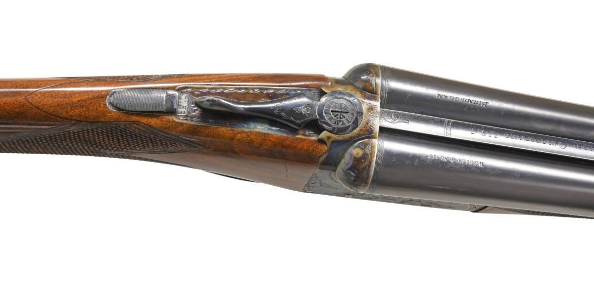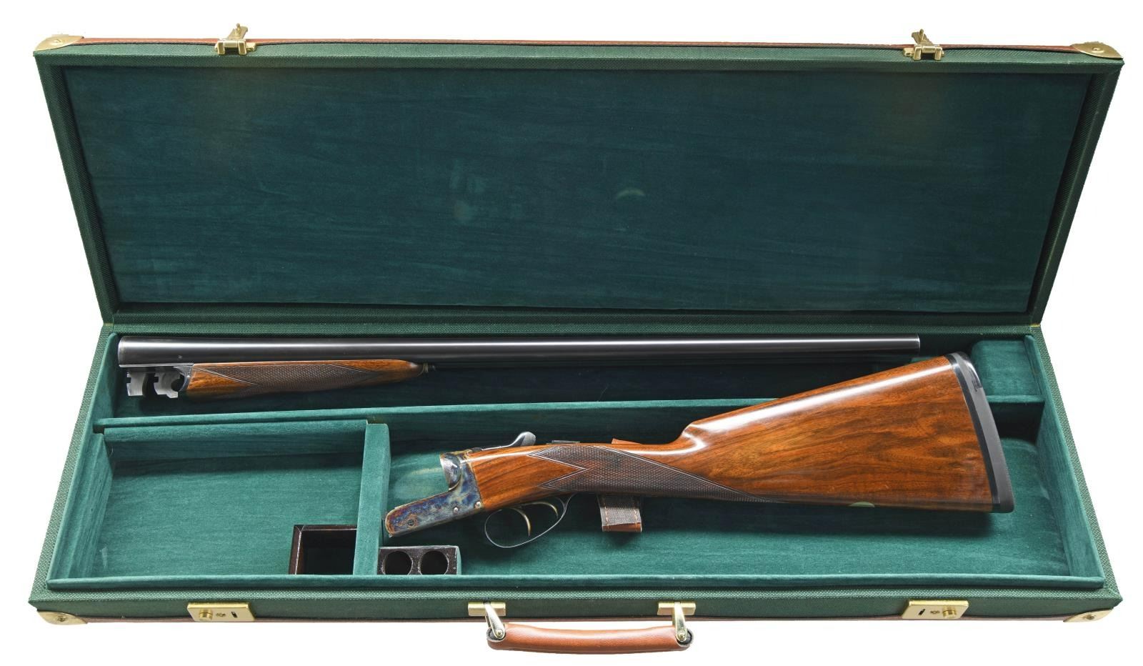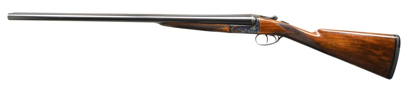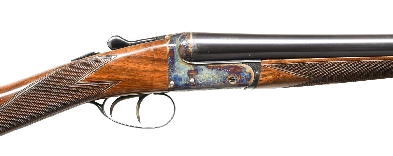 SXS SHOTGUN RETAILED BY ABERCROMBIE & FITCH. Cal. 12 Ga. 2-3/4". S# 146173. The 26" dovetailed barrels are engraved with A&F's Beverly Hills, California address on narrow swamped game rib. Maker's name and address are stamped on tops. Barrel flats are stamped with Birmingham nitro proofs for 2-3/4" chambers. Case hardened boxlock action with automatic safety and double triggers has some scroll engraving. Maker's name is on each side. S# is on trigger guard tang. Somewhat marbled and figured European walnut straight grip buttstock measures 15" over black Decelerator sporting clays pad. Well cut point pattern checkering is at grip and a vacant silver oval is on toeline. Matching splinter ejector forend has Anson release. MEASUREMENTS: BBLS: Bore Diameter: L .728. R .727. Restriction: L .022 (Mod). R .008 (IC) Wall thickness: L .028. R .032. STOCK: DAH: 2-3/16". DAC: 1-9/16". CAST: neutral. LOP: 15". WEIGHT: 6 lb. 7 oz. UNATTACHED ACCESSORIES: gun comes in a good quality green canvas case with tan leather trim lined in green velvet. CONDITION: very fine, retaining nearly all factory finished on all wood and metal with some slight staining on tops of barrels and some minor marks in wood. Bright bores, mechanically good. Case is good. (23-998/MGM). CURIO. $1,750-2,500.