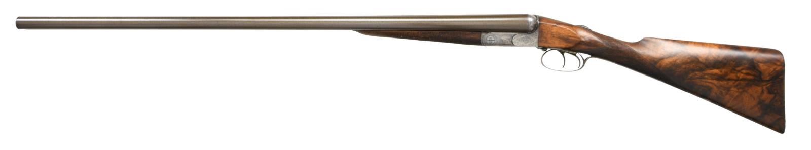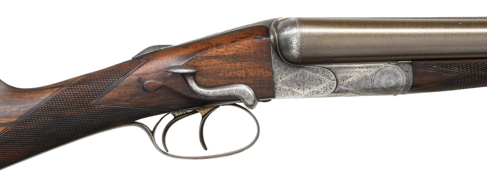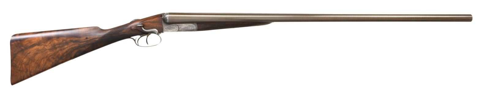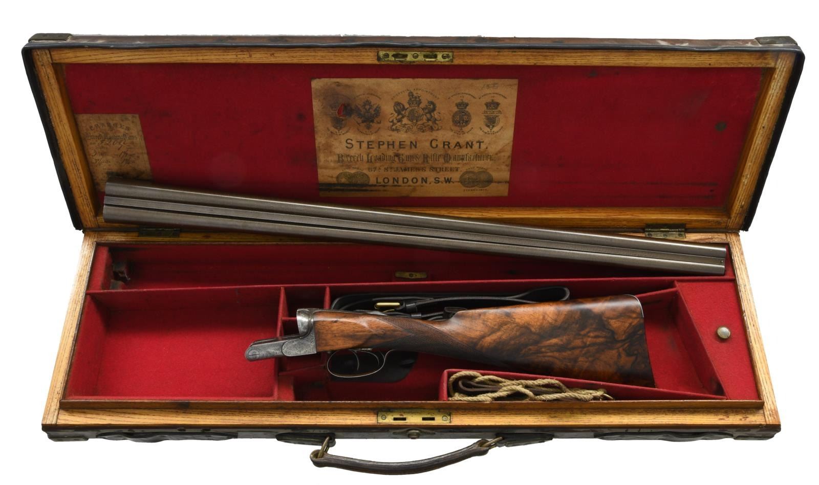 GAME SHOTGUN WITH CASE. Cal. 12 Ga., 2 3/4". S# 5209 (1882). This fine gun is built to Horatio Phillips 1879 patent with trigger plate action, which is cocked by a right hand side lever which also opens gun. The 30" two stripe damascus barrels are engraved "STEPHEN GRANT 67a St. James' Street London" "4" on narrow game rib. Barrel flats stamped with original London black powder proofs for 12B & 14M along with 2005 London nitro reproofs for 2 3/4" chambers. Trigger plate action which has the appearance of a boxlock has opening and cocking lever on right side and features automatic safety ("SAFE" inlaid in gold) and double triggers. Action engraved with near full coverage well executed medium scroll. Maker's name is on each side and top tang is engraved "Patent". Trigger guard with scroll on bow has S# and "4" on tang. Straight grip buttstock of attractively streaked and well figured Circassian walnut measures 13 1/2" over checkered wood butt with steel heel and toe plates (top engraved "4"). Stock also features drop points flat top point pattern checkering and vacant silver oval. Toeline is nicely swept yielding an elegant and racy look. Matching splinter forend has Anson release. MEASUREMENTS: BBLS: Bore Diameter: L .728. R .726. Restriction: L .028 (I-Mod). R .020 (Mod). Wall thickness: L .034. R .033. STOCK: DAH: 2 1/8". DAC: 1 7/16". CAST: about 1/4" off. LOP: 13 1/2". WEIGHT: 6 lb. 12 oz. UNATTACHED ACCESSORIES: gun is housed in its original oak and leather case with brass corners embossed "A.M." "Army & Navy Club." on top. There are some old steam ship company labels attached. Interior is lined in red cloth and a Stephen Grant paper label is in lid along with charge card for this particular gun. Case contains a dog leash ? and exterior straps. CONDITION: good as refurbished. Barrels retaining most of an old rebrown with fair definition to pattern over marks, dings and scratches. Action is mostly bright silver with traces of case hardening color visible where protected. Engraving remains clear. Stocks retain nearly of an oil refinish, checkering recut. Sharp details somewhat softened. Bores are bright and shiny. Action is tight (hinge pin replaced). Case leather is quite dark with many stains and rubs. New straps and handle bases have been added and are good. Interior cloth renewed some time ago with labels reattached, considerable subsequent staining is evident. (01-24236/MGM). ANTIQUE. $1,500-2,250.