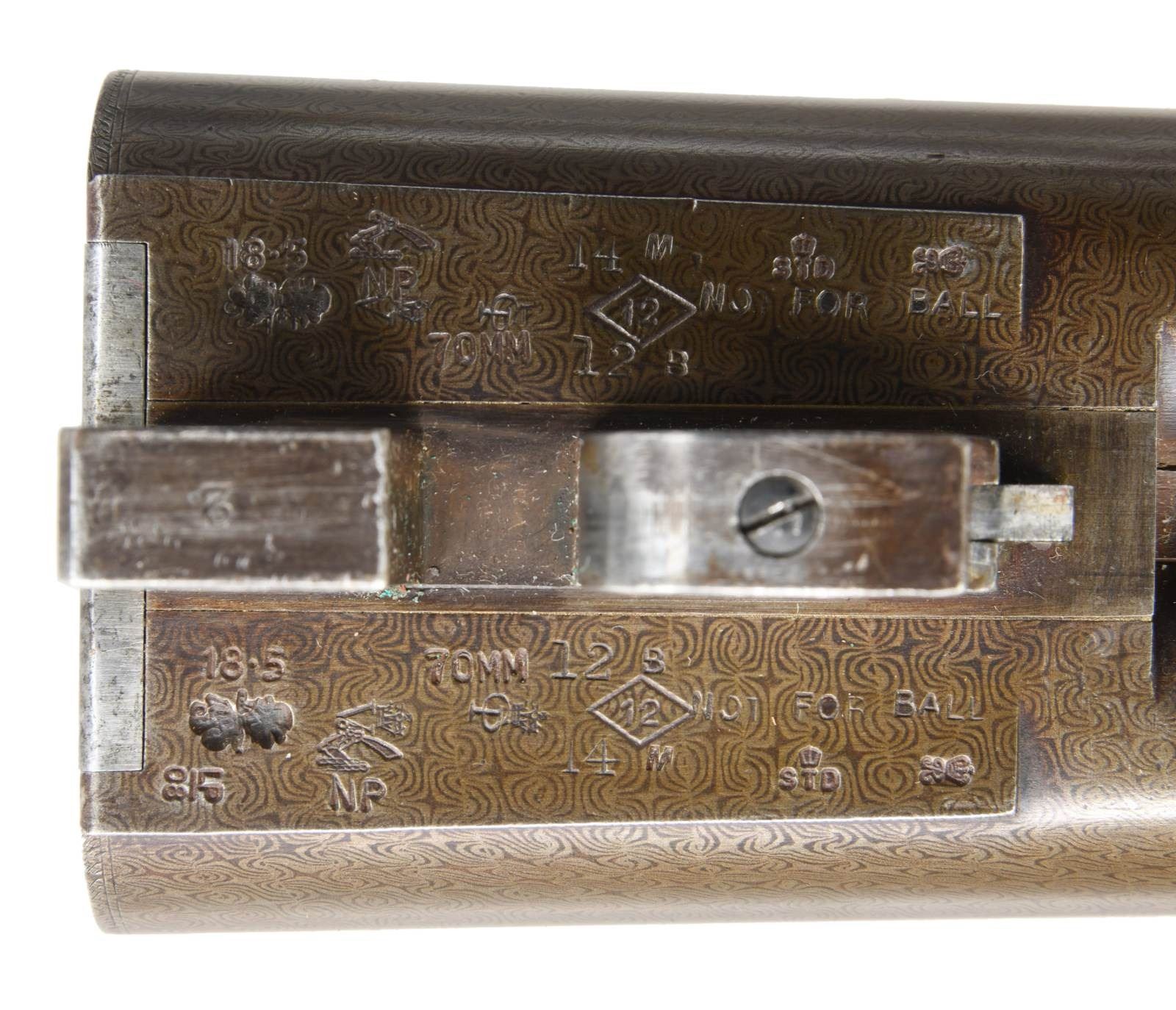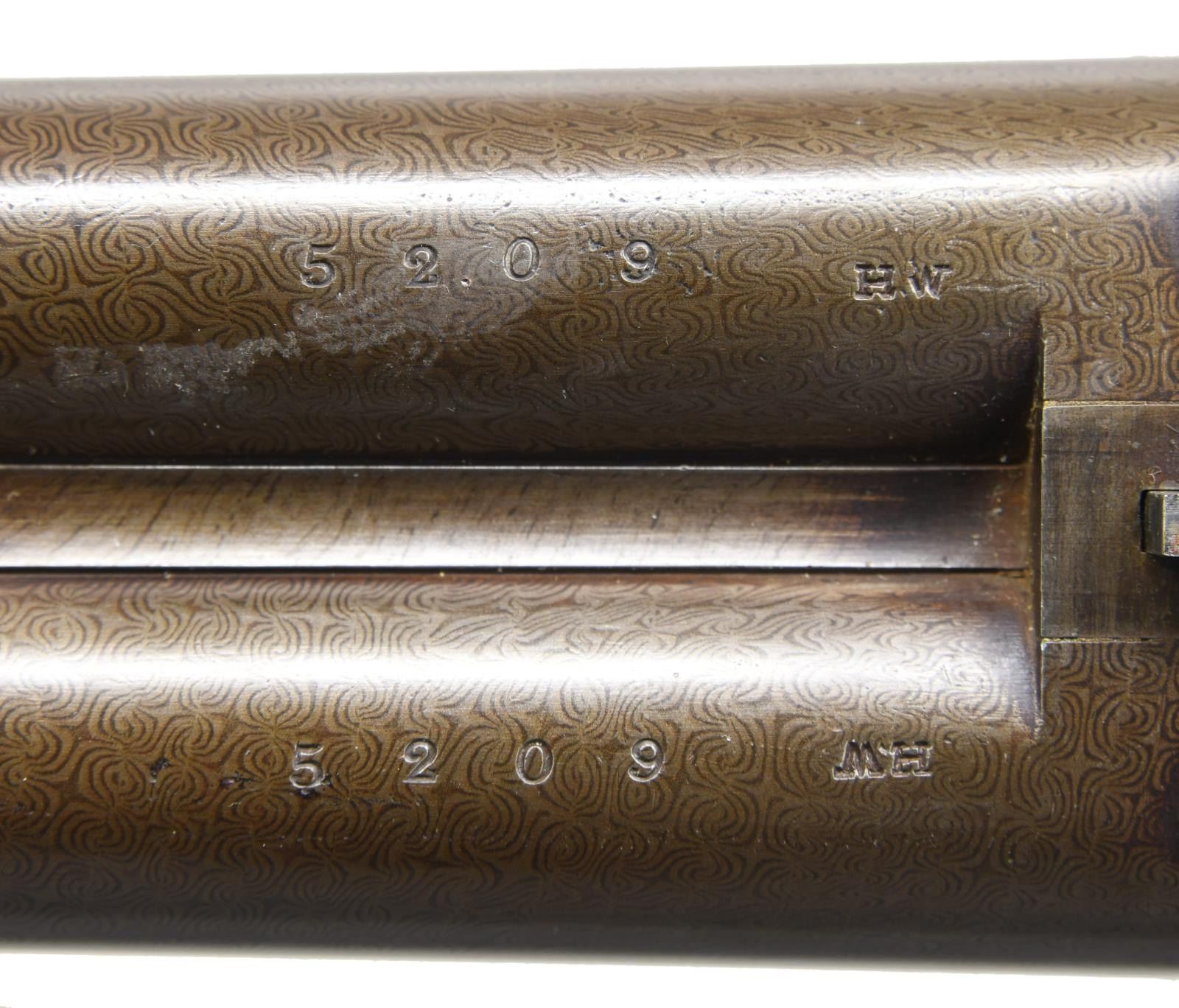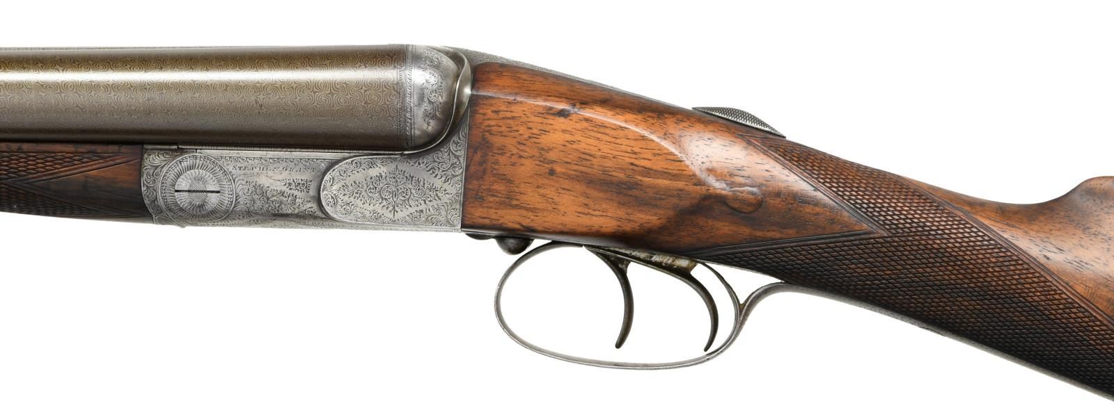GAME SHOTGUN WITH CASE. Cal. 12 Ga., 2 3/4". S# 5209 (1882). This fine gun is built to Horatio Phillips 1879 patent with trigger plate action, which is cocked by a right hand side lever which also opens gun. The 30" two stripe damascus barrels are engraved "STEPHEN GRANT 67a St. James' Street London" "4" on narrow game rib. Barrel flats stamped with original London black powder proofs for 12B & 14M along with 2005 London nitro reproofs for 2 3/4" chambers. Trigger plate action which has the appearance of a boxlock has opening and cocking lever on right side and features automatic safety ("SAFE" inlaid in gold) and double triggers. Action engraved with near full coverage well executed medium scroll. Maker's name is on each side and top tang is engraved "Patent". Trigger guard with scroll on bow has S# and "4" on tang. Straight grip buttstock of attractively streaked and well figured Circassian walnut measures 13 1/2" over checkered wood butt with steel heel and toe plates (top engraved "4"). Stock also features drop points flat top point pattern checkering and vacant silver oval. Toeline is nicely swept yielding an elegant and racy look. Matching splinter forend has Anson release. MEASUREMENTS: BBLS: Bore Diameter: L .728. R .726. Restriction: L .028 (I-Mod). R .020 (Mod). Wall thickness: L .034. R .033. STOCK: DAH: 2 1/8". DAC: 1 7/16". CAST: about 1/4" off. LOP: 13 1/2". WEIGHT: 6 lb. 12 oz. UNATTACHED ACCESSORIES: gun is housed in its original oak and leather case with brass corners embossed "A.M." "Army & Navy Club." on top. There are some old steam ship company labels attached. Interior is lined in red cloth and a Stephen Grant paper label is in lid along with charge card for this particular gun. Case contains a dog leash ? and exterior straps. CONDITION: good as refurbished. Barrels retaining most of an old rebrown with fair definition to pattern over marks, dings and scratches. Action is mostly bright silver with traces of case hardening color visible where protected. Engraving remains clear. Stocks retain nearly of an oil refinish, checkering recut. Sharp details somewhat softened. Bores are bright and shiny. Action is tight (hinge pin replaced). Case leather is quite dark with many stains and rubs. New straps and handle bases have been added and are good. Interior cloth renewed some time ago with labels reattached, considerable subsequent staining is evident. (01-24236/MGM). ANTIQUE. $1,500-2,250.