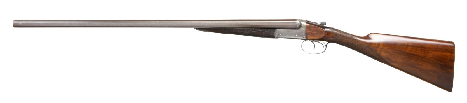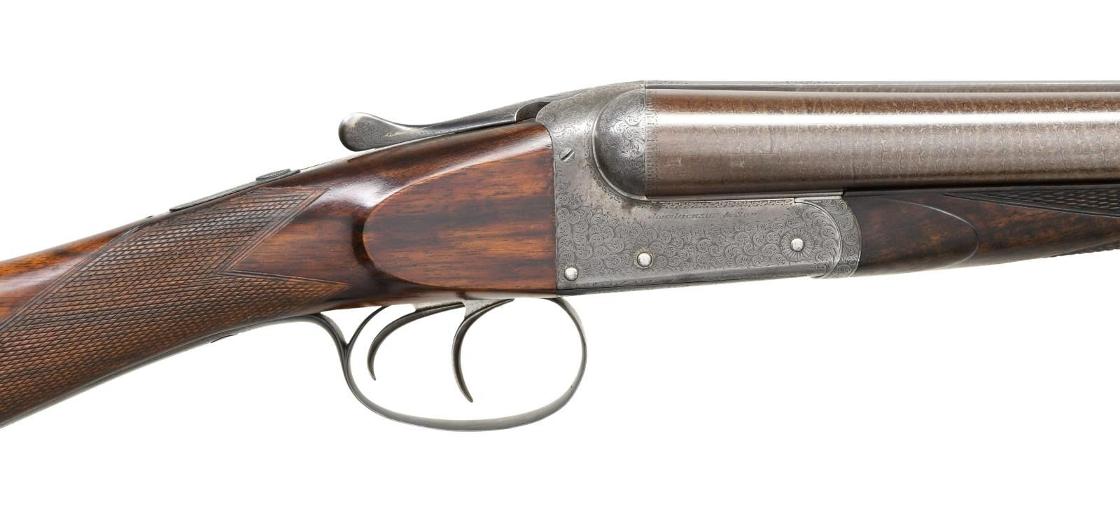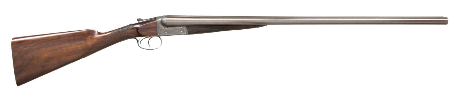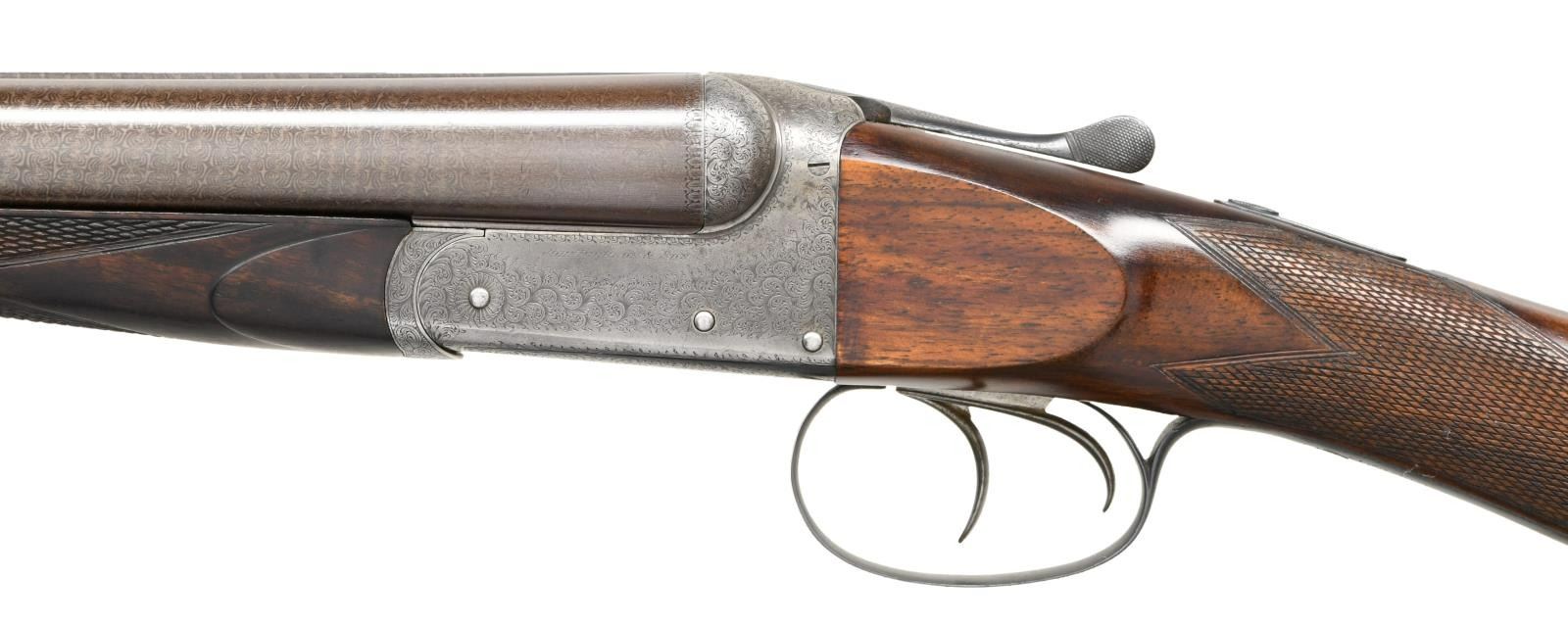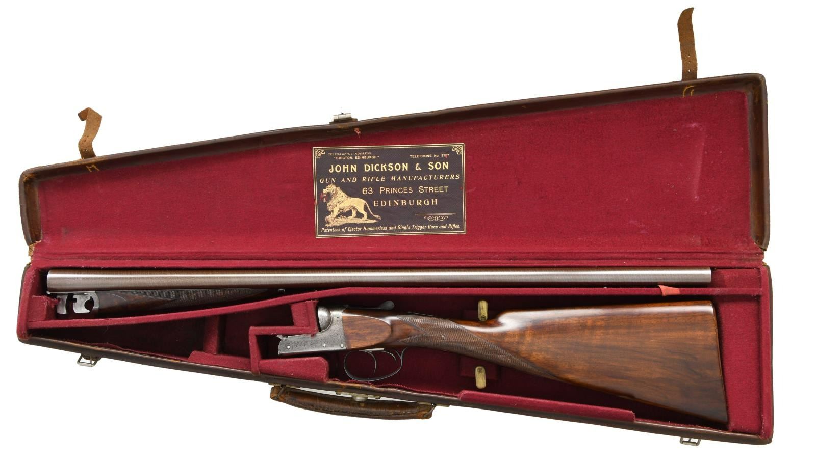 UNUSUAL MAKERS TAPERED CASE. Cal. 12 Ga. 2-1/2". S# 5680 (1905). The 28-1/4" three stripe damascus barrels are engraved "John Dickson & Son 63 Princes Street Edinburgh" on slightly swamped game rib. Barrel flats are stamped with London nitro proofs for 1-1/8" shot. Case hardened boxlock action with intercepting safety sears and hidden third fastener also features automatic safety and double triggers. Action is engraved with 80% coverage of small scroll. Maker's name is on each side. Blued top lever, floorplate, trigger plate and trigger guard are also engraved with scroll. S# is on trigger guard tang. Lightly fiddle figured and streaked Europeon walnut, straight grip buttstock measures 14-5/8" over serated wood butt. Flat top point pattern checkering is at grip and a vacant gold oval is on toeline. Matching splinter Deeley ejector forend has Anson release. MEASUREMENTS: BBLS: Bore Diameter: L .732. R .724. Restriction: L .038 (Full). R .000 (Cyl). Wall thickness: L .026. R .032. STOCK: DAH: 2-5/16". DAC: 1-7/16". CAST: about 1/2" off. LOP: 14-5/8". WEIGHT: 6 lb. 3 oz. UNATTACHED ACCESSORIES: unusual makers tapered leather trunk case embossed "W. R. H." on lid. Interior is lined in burgundy cloth and a brown gold embossed Dickson lion label is in lid. There are no accessories present. CONDITION: very good as partially refinished. Barrels retaining nearly all best quality re-brown with fine definition to pattern. Action retains traces of original case hardening color where protected and is mostly a pleasing pewter gray. Stocks retain nearly all of an oil refinish with some subsequent marks. Checkering re-cut, forend re-cut with raised diamonds. Bores are bright and shiny over some light pitting with some evidence of very minor dent removal 14" from muzzle of left barrel. Action is tight. Barrels on face. Ejectors in time. Case leather is dark, shows many scuffs on exterior. Straps and handle are good. Interior cloth is good with some rubs especially breech area of barrel compartment. Label is good to fine with deep rub on lions face. (23-1271/MGM). C&R. $1,500-2,500.