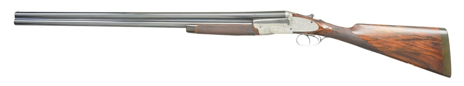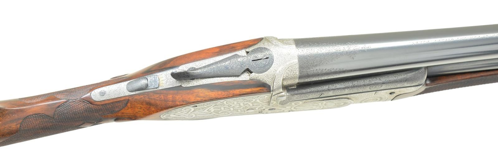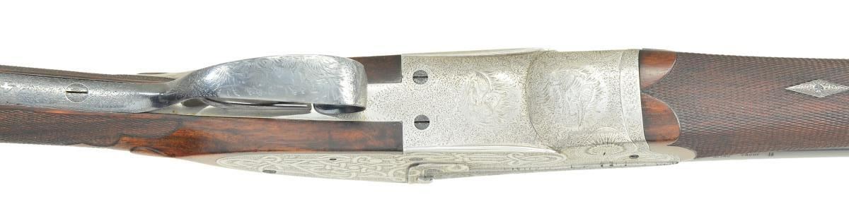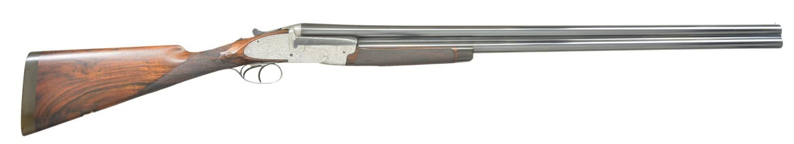 Cal. 12 Ga., 2-1/2". S# 4184. Bbls. 30" plain w/ 1-1/8 oz. proofs. Top is marked "ROBERT LISLE, 25 DERWENT STREET, DERBY". Assisted opening sidelock action w/ crossbolt that locks over bbl. extensions. Unusual full coverage engraving has viginettes w/ pheasants & quail on floorplate & pointing dog on trigger guard bow. Pheasants & partridge are found on sides of the forearm iron. Scenes are surrounded by fine arabesque scroll engraving & floral bouquets that extend to the bbl. The lock plate areas have a very unusual & distinctive interwoven ribbon pattern engraving. Small field style forearm that wraps around the lower bbl. only has a horn tip & Anson release. Straight hand stock of fancy English walnut w/ tear drop points having brass shield in toeline. Stock & forearm have elegant borderless hand checkering w/ scalloped edges. LOP: 14-7/8" over a 1" checkered hard rubber extension buttplate. DAC: 1-3/8". DAH: 1-7/8". Stock has approx. 1/4" cast off. Bore diameter: U .734", O .733". Choke constriction: U .048", O, cyl. bore. Minimum wall thickness: U .027", O .025". WEIGHT: 6 lbs, 12 ozs. CONDITION: bbls. retain over 98% reblackened finish. Action is polished bright. Wood has very good refinish & freshened checkering. Forearm has a crack extending from right side of iron. Very good bright bores. (23-682/DS). CURIO. $1,500-2,000.