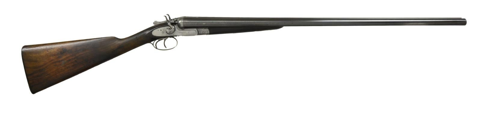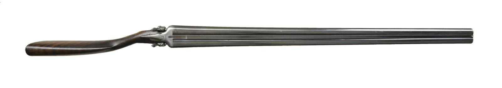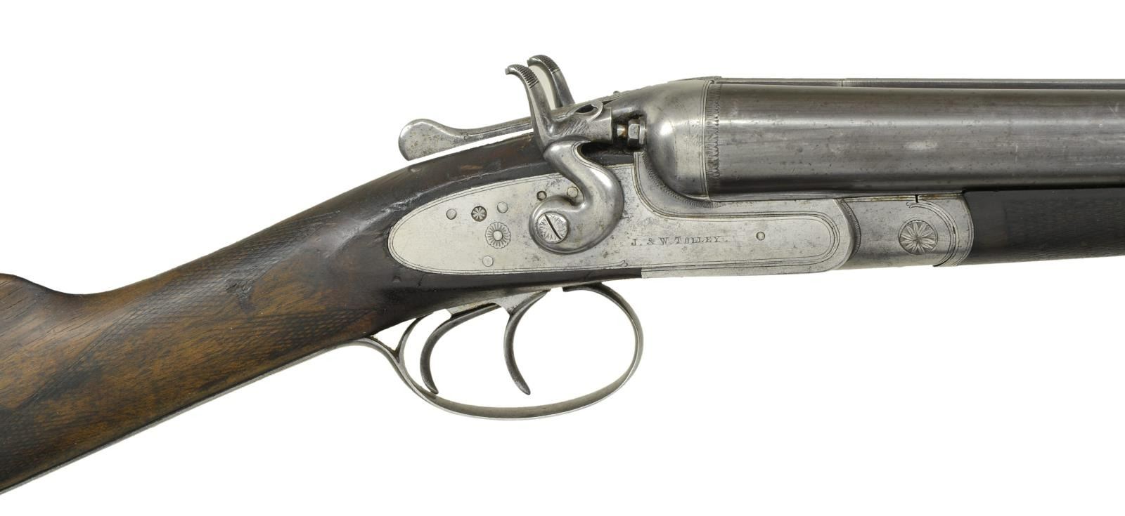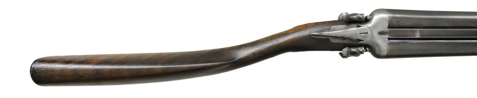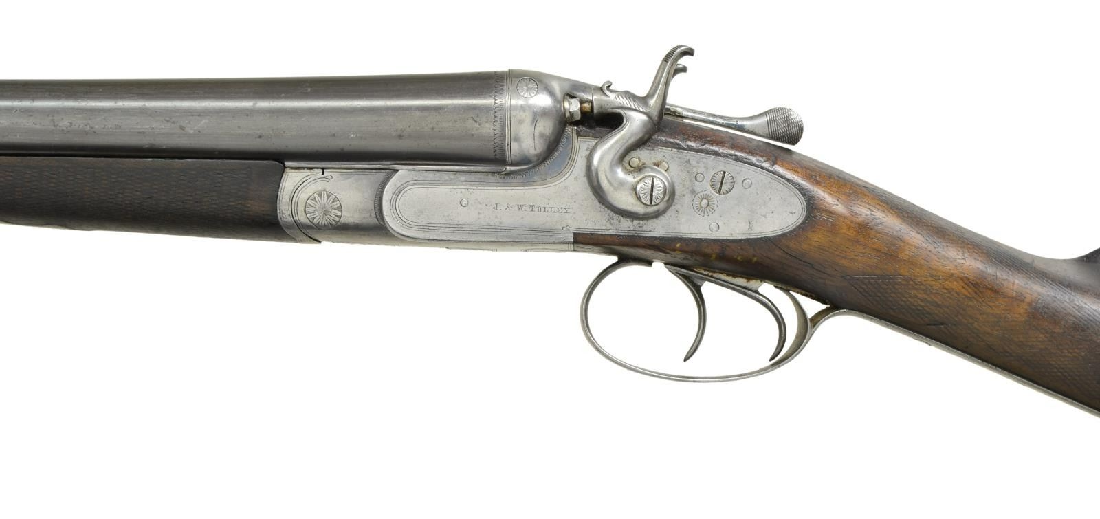 CROSSOVER STOCK. Cal. 12 Ga., 3". S# 1740. Bbls. dovetailed 30" are engraved "J&W Tolley 59 New Bond St. London" on slightly swamped game rib with crossbolt extension. Bbl. flats are stamped with Birmingham Nitro proofs for 2 1/2" chambers. Case hardened toplever action is fitted with front spring sidelocks with serpentine rebounding hammers. Action is fitted with Greener crossbolt third fastener and double triggers. Action and lockplates are line border engraved, maker's name is on each lockplate. Serial number is on trigger guard tang. Straight grip buttstock of lightly figured European walnut is sharply offset to allow for shooting right handed while using one's left eye. Stock measures approx. 14 5/8" over ribbed horn buttplate. Remnants of point pattern checkering are at grip. Matching splinter forend with shaped steel tip has Deeley release. MEASUREMENTS: BBLS: Bore Diameter: R .737", L .734". Restriction: R .002" (IC), L .030" (FULL). Min. Wall Thickness: R .020", L .025". STOCK: DAH: approx. 3". DAC: approx. 2 1/8". LOP: 14 5/8". CAST: wicked off. WEIGHT: 7 lb. 2 oz. CONDITION: good. Bbls. retaining most of an old reblue with a few subsequent dings and marks. Action retains traces of case hardening color but is mostly pewter gray. Lockplates are also silver gray. Stocks show considerable refinishing and a large number of marks and dings. Checkering almost gone. Bores are shiny with some light frosting evident. Action is somewhat loose. Locks are good. (22-4790). CURIO. $1,500-2,500.