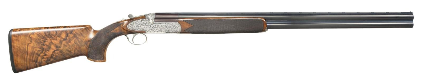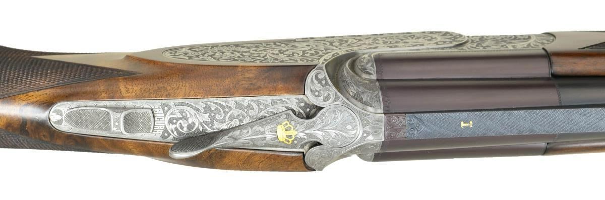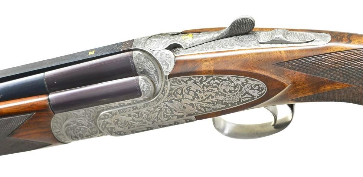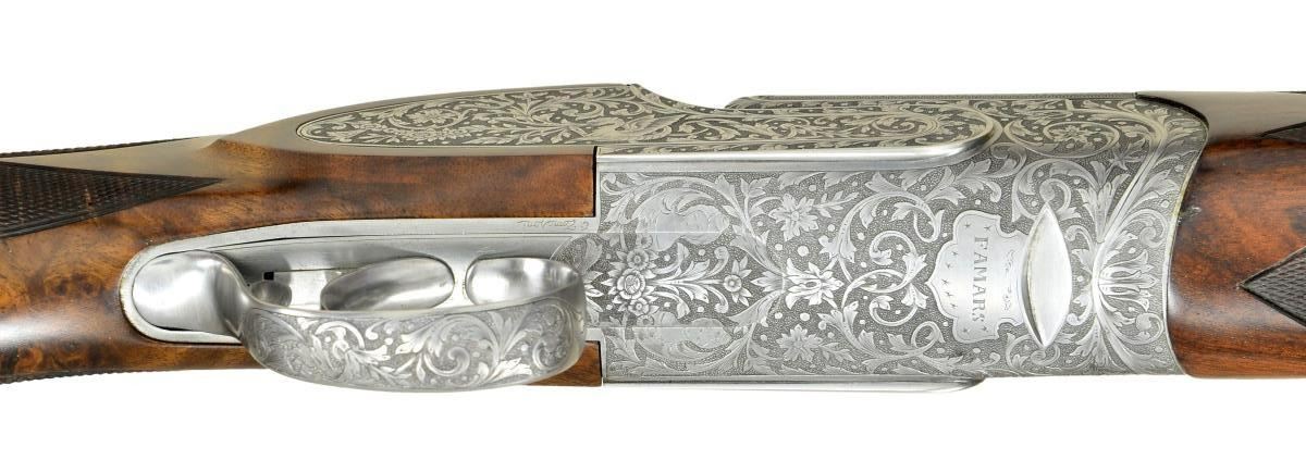 SPORTING DELUXE O/U SHOTGUN WITH EXTRA BARRELS, AND TRIGGER GROUP. Cal. 12 Ga. 2 3/4". S# F0099 / F0100. The 28 & 29 3/4" monobloc O/U barrel sets are each fitted with matted ventilated ribs that are gold inlaid "I" and "II" at breech ends. Both barrel sets are engraved "Famars Italy" on left side of top barrel and monoblocs are stamped with 1997 Italian Nitro proofs for 2 3/4". 28" Barrel set "I" (SN F0099) have bottom barrel fitted for choke tubes and top barrel choked mod. 29 3/4" Barrel set "II" (SN F0100) has choke tubes top & bottom. Coin finished Famars "Excalibur" type action with removable trigger group is also fitted with ornamental sideplates. Action and lockplates are engraved with near full coverage very nicely cut semi relief large acanthus scroll with some floral highlights on sideplates. Rear portion of this scroll emanates from the mouth of stylized dragons. Large scrolls on bottom of action terminate in the busts of lovely ladies with floral accent between. "FAMARS" is on shield like device behind forend iron mortice. A gold sovereign's crown is inlaid on top lever. Engraver's signature "C. Tomasoni" is on right side of lock mortice. Extreme pistol grip buttstock of exhibition quality burl figured European walnut measures 14 3/4" over thin black "Decelerator" pad. Well cut point pattern checkering is at grip which has right hand palm swell. Near fully checkered slim field type forend with Anson type release services both barrel sets. MEASUREMENTS WITH BARREL SET II: STOCK: DAH: 1 7/8". DAC: 1 3/8". LOP: 14 3/4". CAST: approx. 3/8" off. WEIGHT: 8 lb. UNATTACHED ACCESSORIES: gun comes in brown leather trimmed "Famars" plastic case with outer cover. Interior is lined in green velvet and has compartment for both barrel sets in lid. Divider has black leather "Famars" label. Case contains stock removal tool, one Briley series 1 choke tube with wrench and a spare firing mechanism in plastic case. CONDITION: fine as lightly refurbished, barrels retaining nearly all of a good quality reblack with some minor subsequent marks. Coin finish of action shows evidence of some very light cleaning, engraving remains sharp. What appears to be newer buttstock retains essentially all of its original oil finish, checkering still light in color. Forend shows refinish to match. Checkering with some wear and cleaning. Bores are bright and shiny. Mechanically fine. Case interior shows considerable wear, from lining is disintegration. Case cover shows mild water staining. (22-4471/MGM). MODERN. $9,000-14,000.