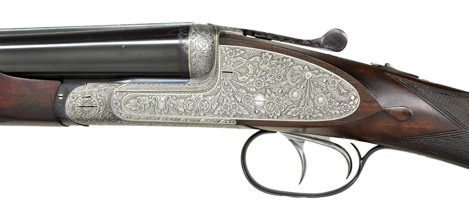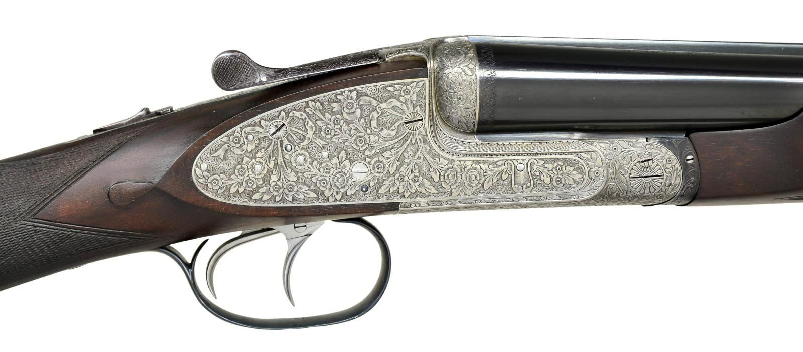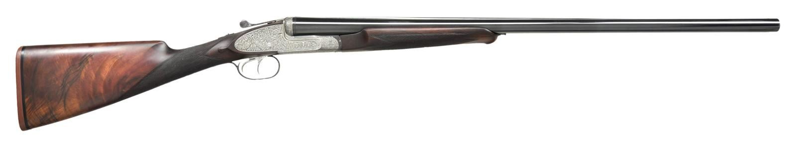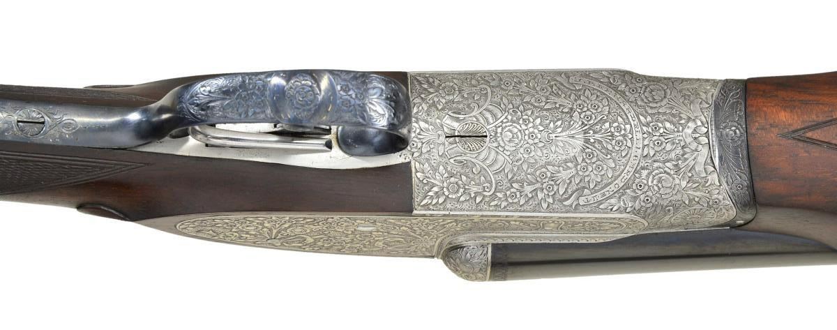 SIDELOCK EJECTOR DOUBLE TRIGGER HEAVY GAME OR PIGEON GUN WITH BEAVERTAIL FOREND AND CASE. Cal. 12 Ga., 2 3/4". S# 2286 (1971). The top of the line Bernardelli, this fine gun has 27 1/2" dovetailed bbls. with slightly raised matted game rib. Tops of bbls are engraved "Made in Italy" "V. Bernardelli s. p. a. Gardone V.T.". Engine turned bbl. flats are stamped w/ 1971 Italian Nitro proofs for 2 3/4" chambers. Coin finished sidelock action features non automatic safety ("SECURA" engraved), bushed strikers, hidden 3rd fastener, raised rib tumbler end cocking indicators, and dbl. triggers (front articulated). Action is engraved with full coverage ribbons & swags of acanthus having rose & other floral tips in a shaded background of small scroll. Fences are engraved with rose bouquets. Maker's name and address is on arched ribbon on bottom of action. Blued top lever and trigger guard are engraved to match. Straight grip buttstock of well marbled & nicely crotch figured European walnut measures 14 3/8" over thin brown rifle pad. Closely spaced point pattern checkering is at grip & slightly fluted drop points are behind lockplates. Matching schnabled beavertail ejector forend has Anson release. MEASUREMENTS: BBLS: Bore Diameter: R .722", L .722". Restriction: R .013" (MOD), L .030" (FULL). Min. Wall Thickness: R .030", L .030". STOCK: DAH: 1 3/4". DAC: 1 3/8". LOP: 14 3/8". CAST: approx. 1/4" off. WEIGHT: 7 lb. 6 oz. UNATTACHED ACCESSORIES: gun is housed in a best quality British oak & leather case with brass corners in leather trimmed canvas outter cover. Top of case is embossed "P" & "D" either side of central brass medallion. Interior is lined in burgandy cloth & has new Bernadelli label in lid & an old charge card. No accessories are present. CONDITION: very fine, appears to be original. Bbls. retaining over 90% good quality blue with some handling marks & light silvering. Action retains nearly all of its coin finish with some slight evidence of cleaning. Top lever & trigger guard retain most of their original blue. Trigger guard appears to be reblued, but with little polishing; engraving remains sharp. Stocks retain most of a light oil refinish, edges remaining sharp, checkering lightly worn. Bores are bright and shiny without any visible imperfections. Action is tight. Ejectors are strong and in time. Case leather is medium dark with many rubs and marks. Straps and handle are renewed. Outer cover shows light wear. Interior cloth is good with rubs & compressions w/ some soiling. Beavertail forend is too wide for bbl. channel & fit is very tight. (22-4537/MGM). CURIO. $4,000-7,000.